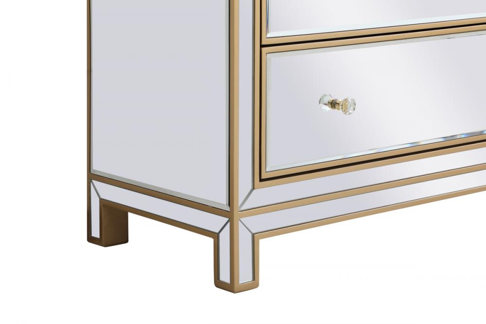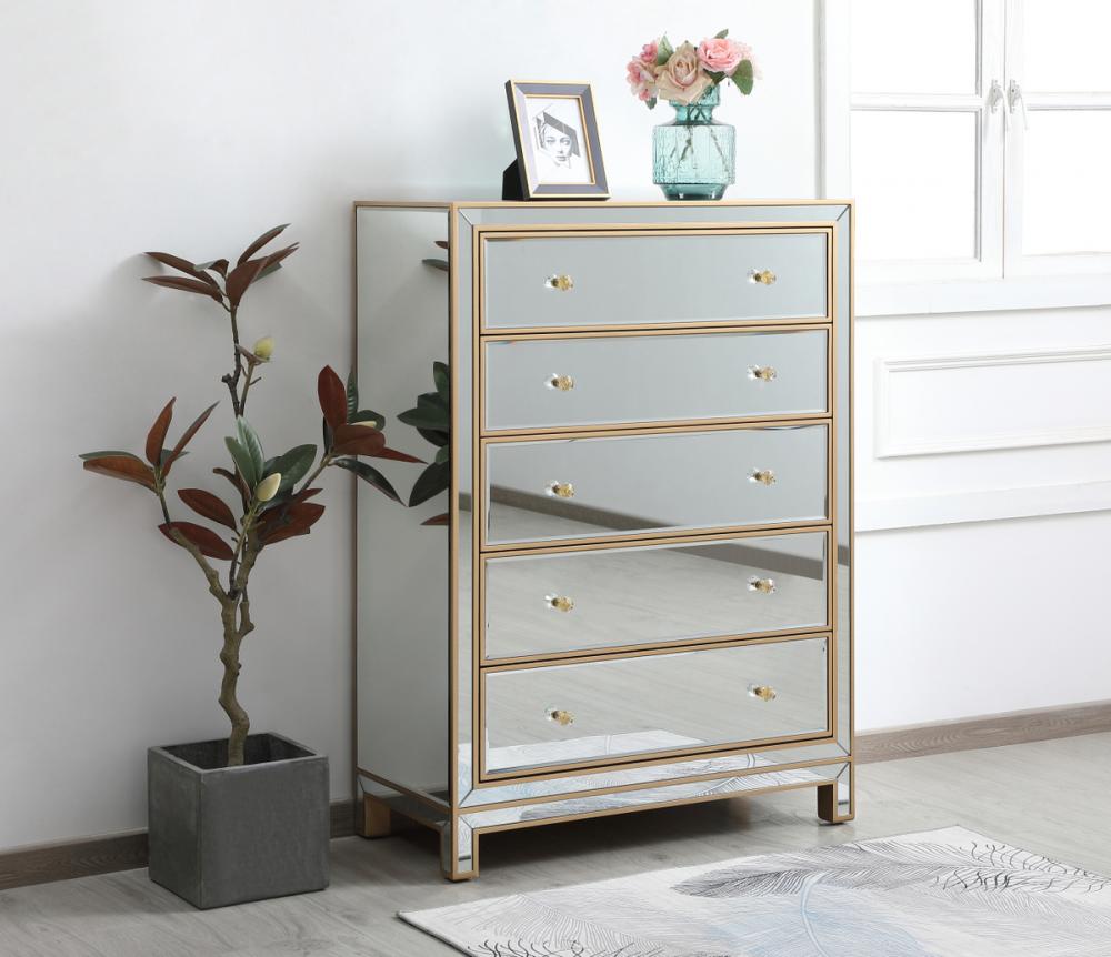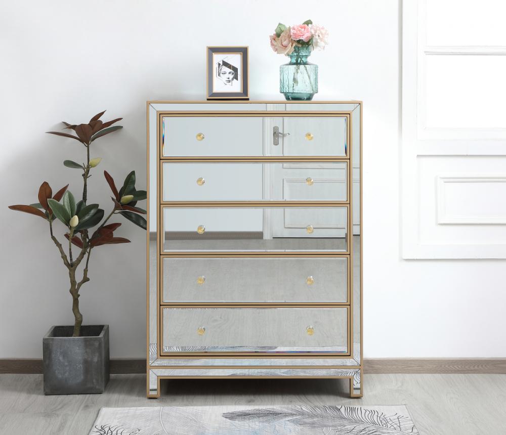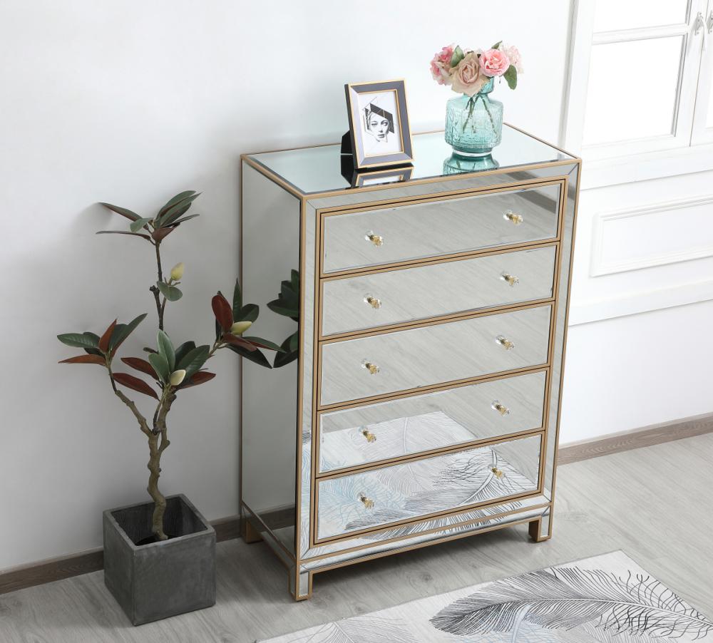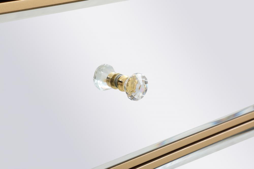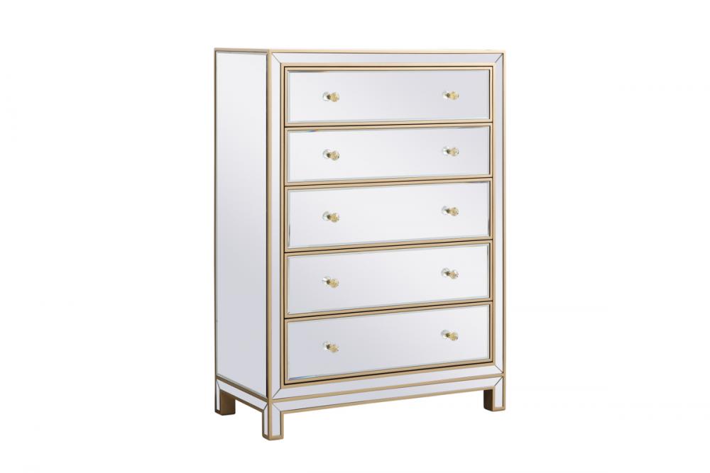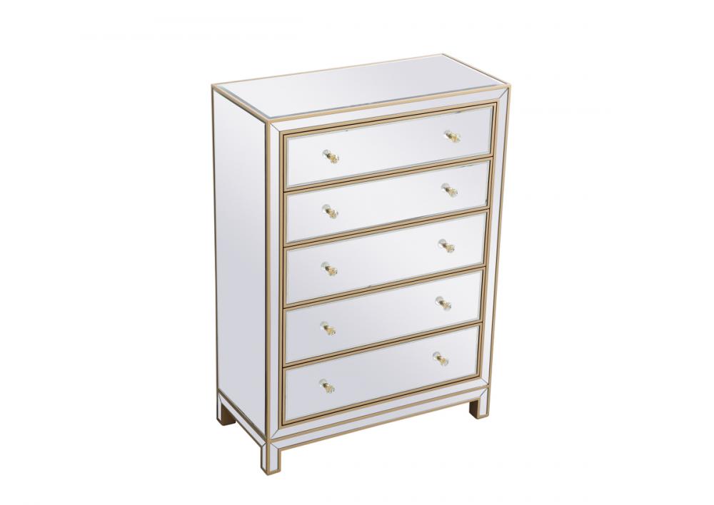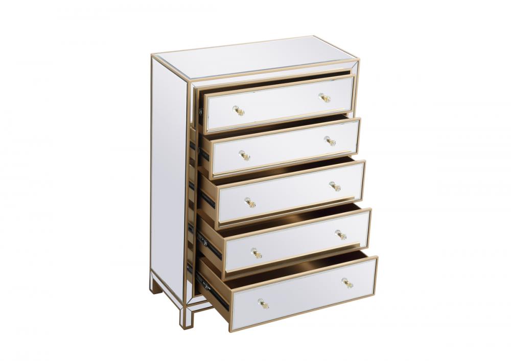 A perfect combination of style and functionality, this five drawer dresser provides plenty of storage space. The high quality beveled mirror panels are enhanced with hand painted trims. The crystal knobs, in addition to the distinctive mitered corners, evoke richness and glam.