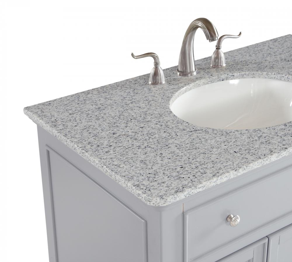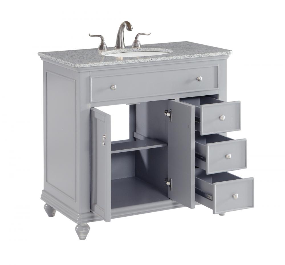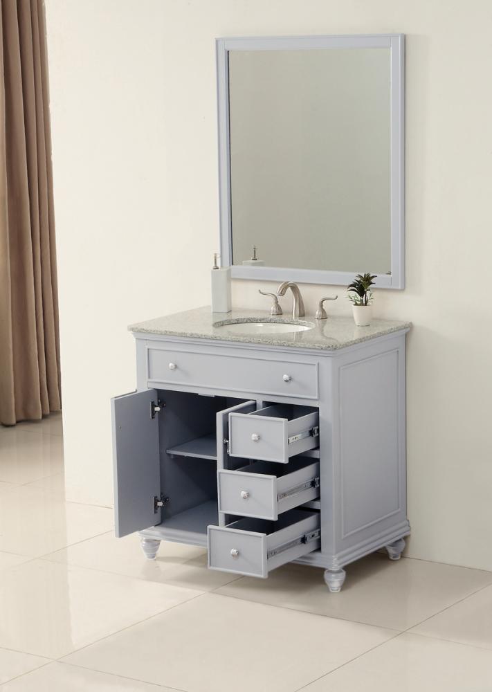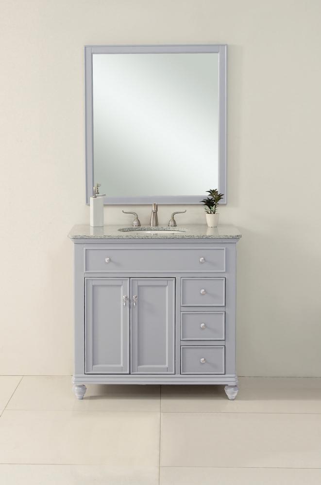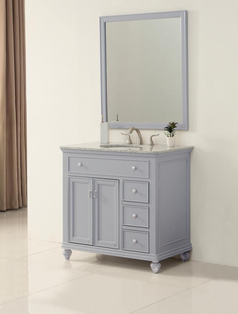 A sleekly styled 2 doors and 3 drawers, granite-topped bathroom vanity like this can only bring a smile of appreciation for its simple beauty and clean lines. With an authentic Kashmir white granite counter top, oval white porcelain sink, hand painted soft grey cabinet, 2 soft-close doors with a shelf inside, 3 deep side drawers, brushed steel hardware and carved bun feet, this elegant, transitional vanity balances form and function. Measurements: W36”xD21”xH35”