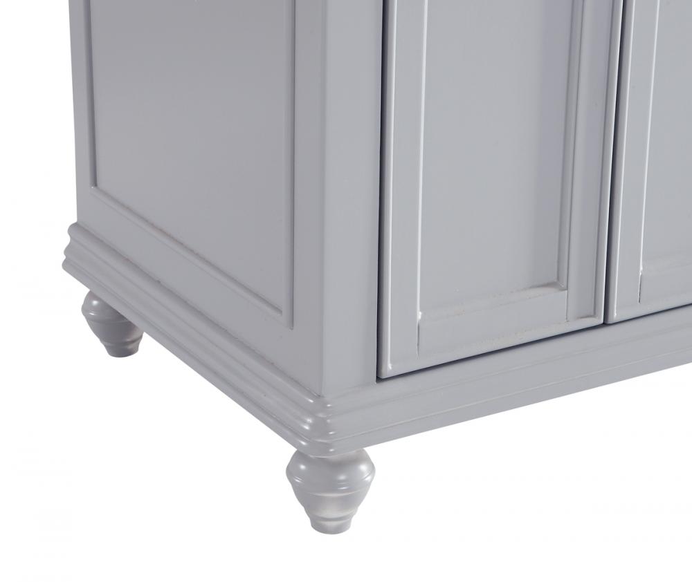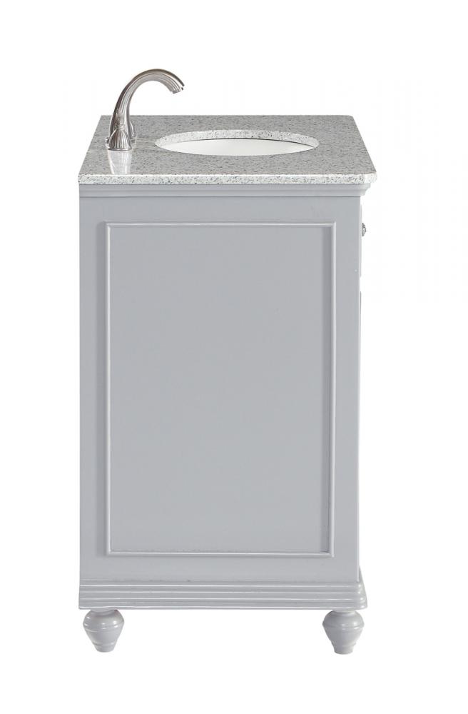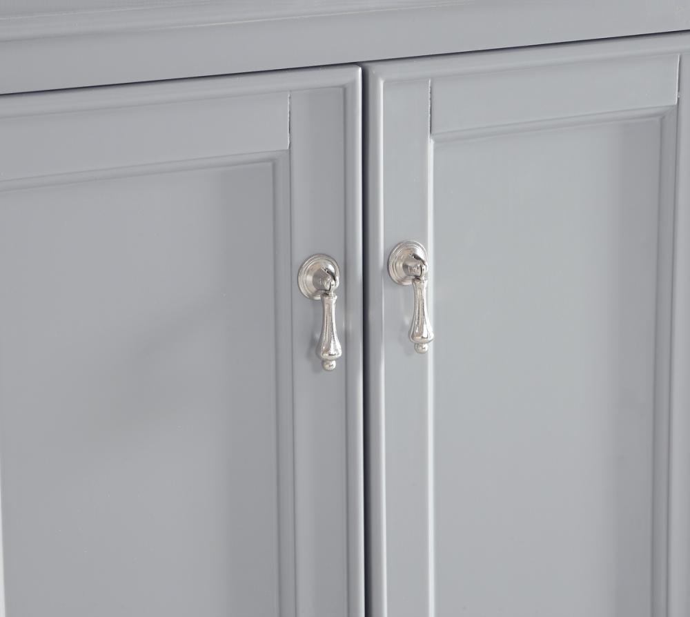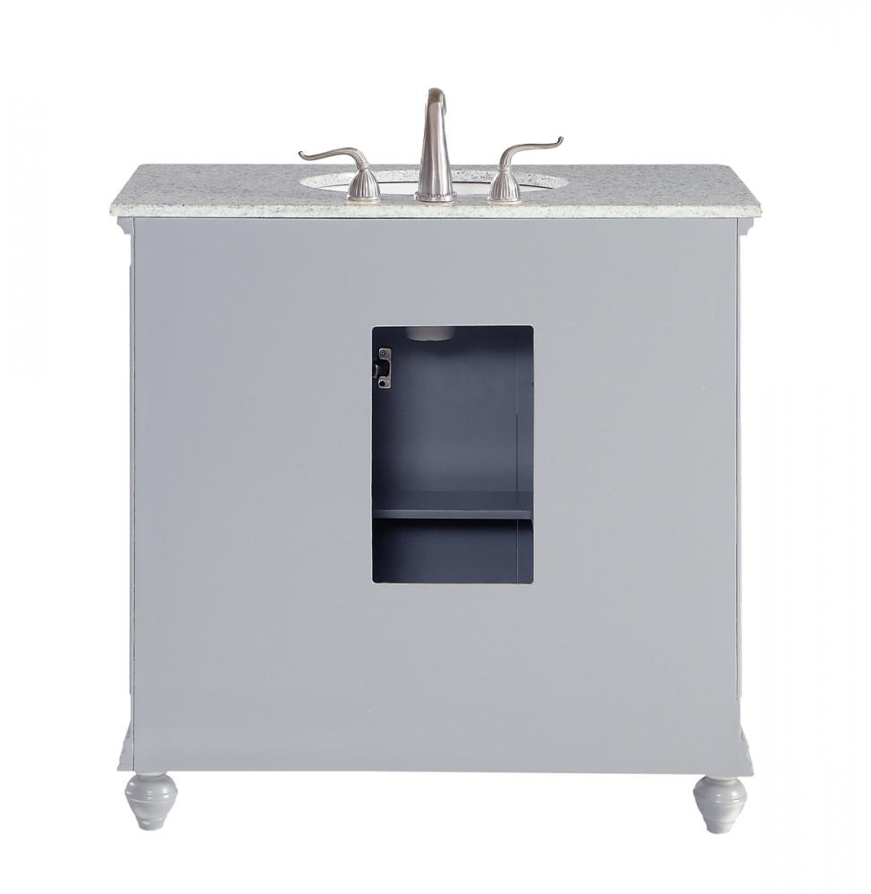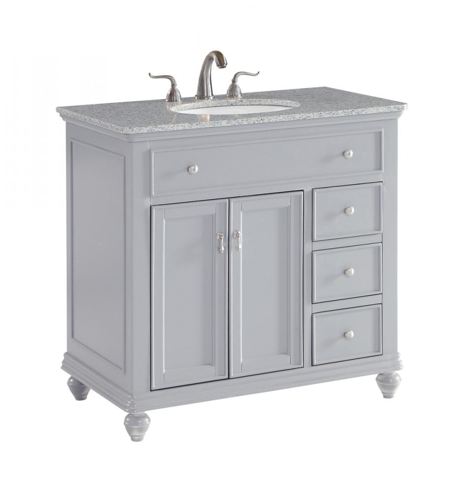 A sleekly styled 2 doors and 3 drawers, granite-topped bathroom vanity like this can only bring a smile of appreciation for its simple beauty and clean lines. With an authentic Kashmir white granite counter top, oval white porcelain sink, hand painted soft grey cabinet, 2 soft-close doors with a shelf inside, 3 deep side drawers, brushed steel hardware and carved bun feet, this elegant, transitional vanity balances form and function. Measurements: W36”xD21”xH35”