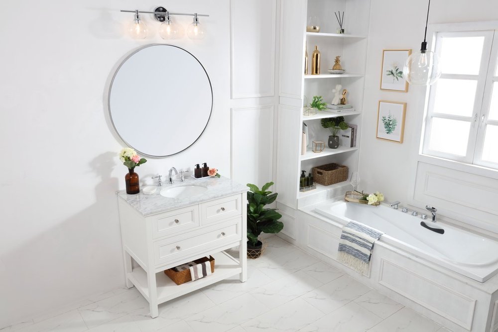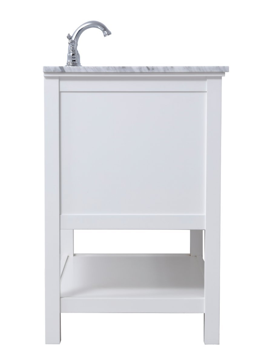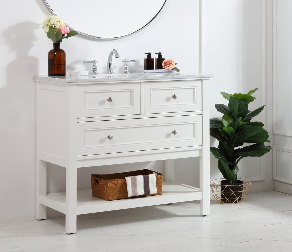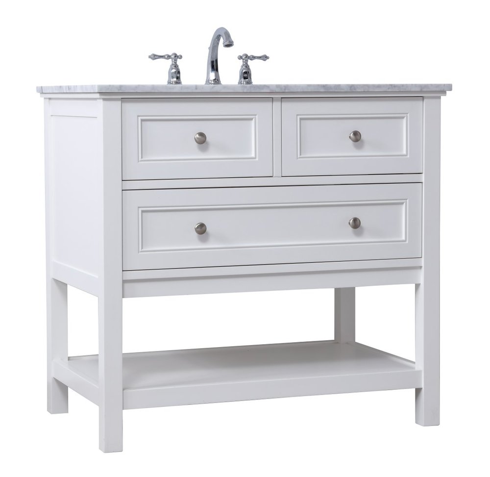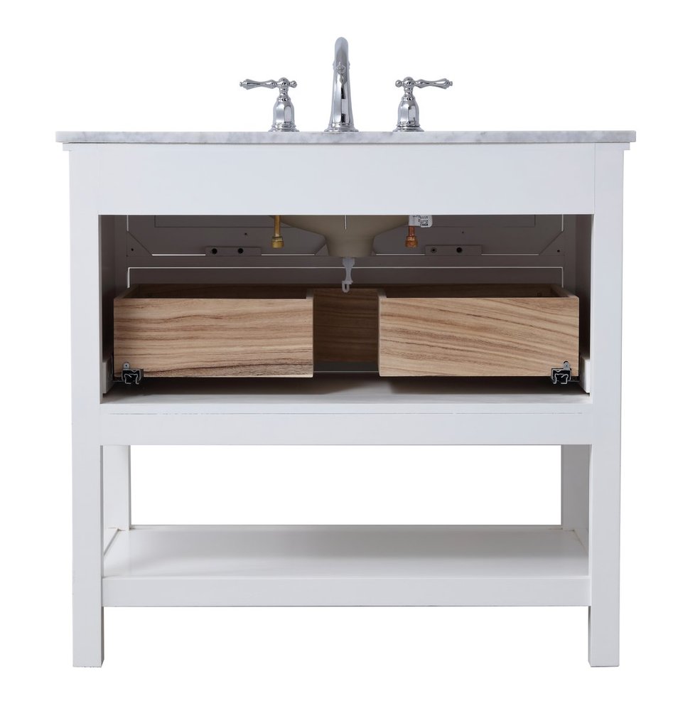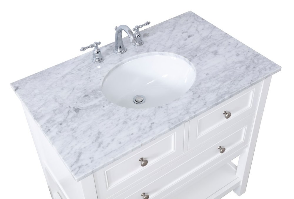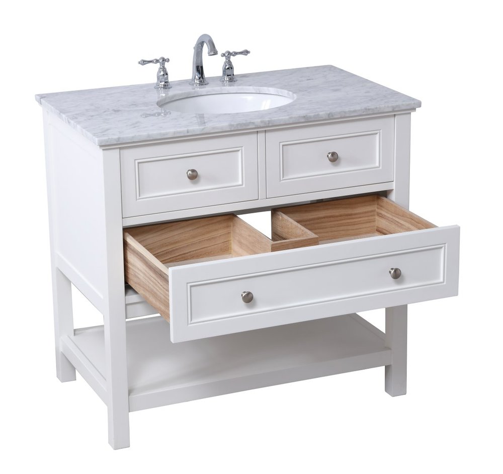 Create a refined and relaxing bath space with this contemporary design vanity, presenting its simplicity and clean straight lines in a minimalist appeal. The 36" white vanity, crafted of solid poplar wood, provides ample storage within its soft-close drawer and open shelf base, accentuated with chrome hardware. Rounding out the design is a luxurious Itallian Carrara white marble with a white porcelain under-mount oval sink.