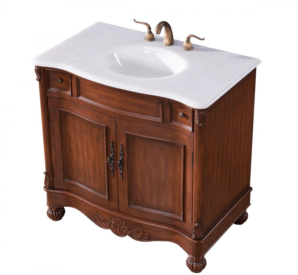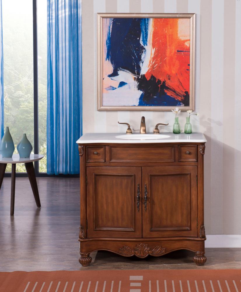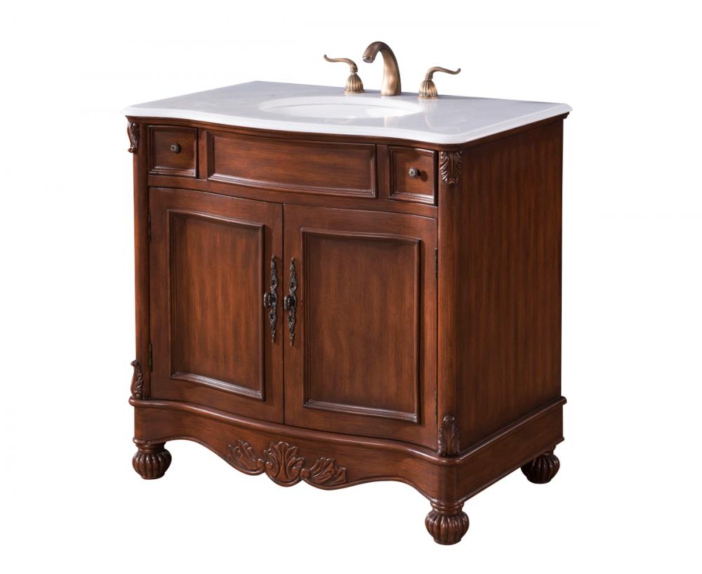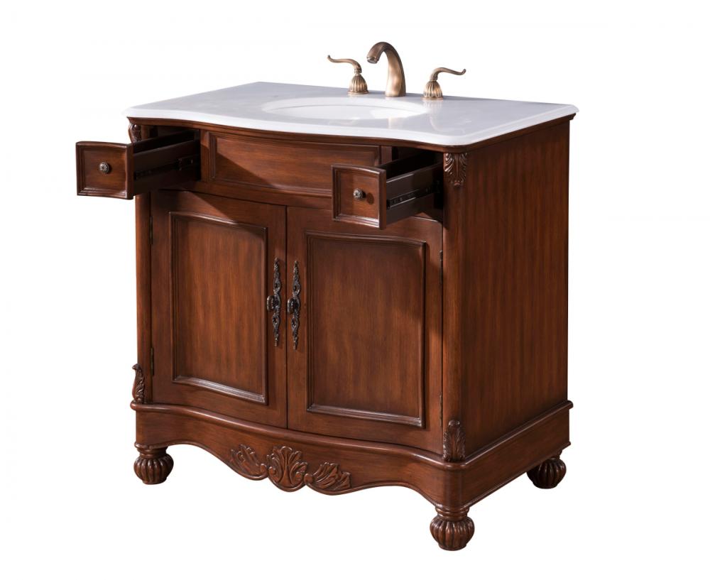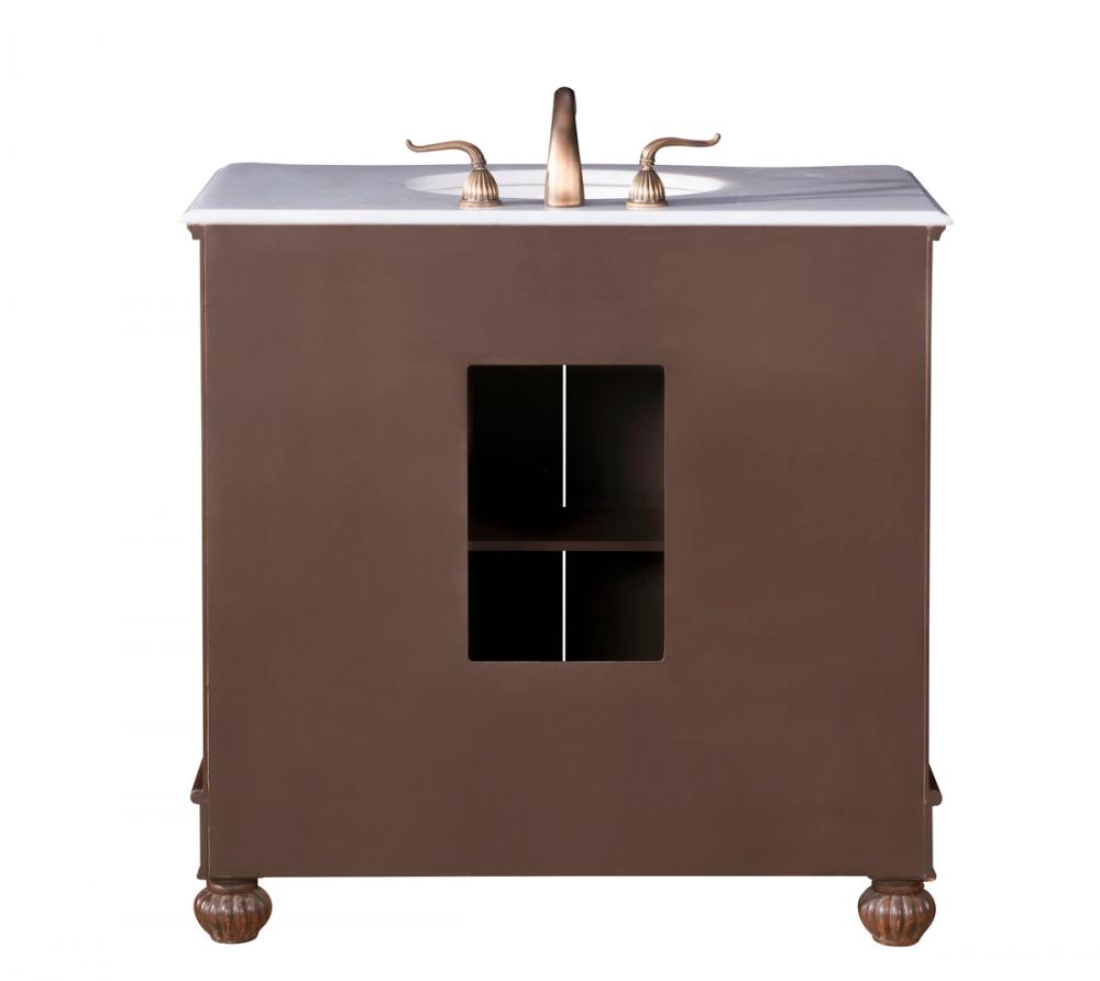 Authentic white marble countertop · Pre-drilled faucet holes, 8” spread · white porcelain undermount sink · Antique bronze finish door knobs and drawer pulls · two door, 1 shelf inside · Constructed of kiln-dried solid wood and MDF·