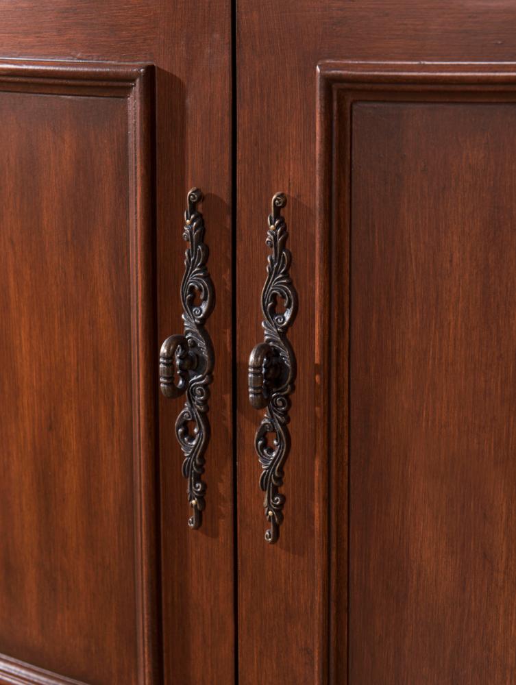 Stylish floral carving and antique bronze finish knobs and drawer pulls. Truly a masterpiece in every way.