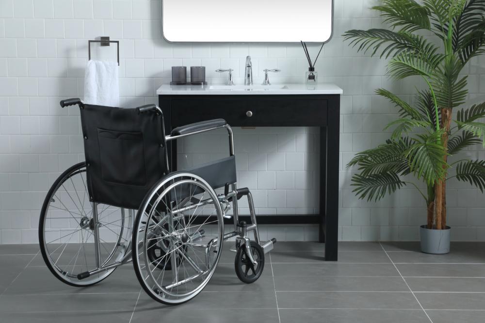 The sink vanity is thoughtfully crafted to accommodate wheelchair access, promoting inclusivity in your bathroom space.