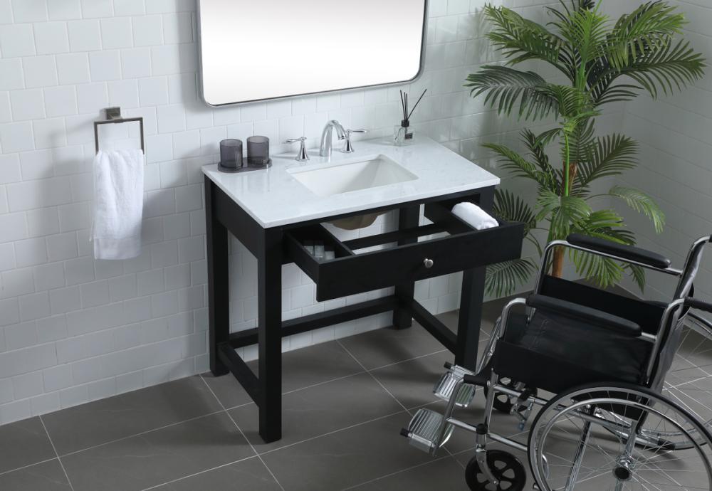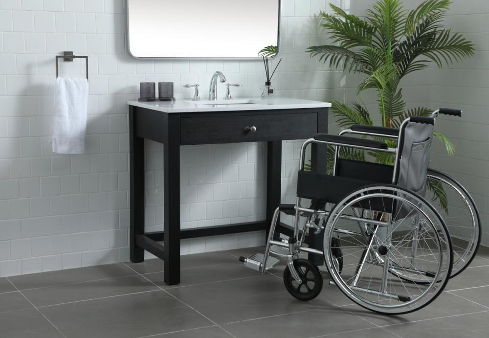 Step into a world of accessibility and sophistication with our Handicap ADA Compliant Bathroom Vanity. Carefully crafted to meet ADA standards, this exceptional piece goes beyond functionality to redefine inclusivity in your bathroom space. The ADA compliant sink cabinet opens doors to unparalleled wheelchair access, ensuring that everyone can navigate their daily routines with ease. The undermount porcelain sink, coupled with a durable Calacatta look engineered marble stone top, adds a touch of timeless luxury to your bathroom while standing up to the demands of everyday use. Versatility meets personalization with predrilled countertops featuring three holes, ready to accommodate a variety of faucets (faucets not included). The thoughtful design extends to the soft closing glides on the drawers, creating a serene and noise-free environment in your bathroom sanctuary.Say goodbye to the complexities of assembly – our vanity ships fully assembled and ready to use, offering you convenience from the moment it arrives. The generous 27-inch knee clearance from the floor ensures optimal comfort and accessibility, catering to the unique needs of individuals using wheelchairs. Every detail has been considered, including a discreetly placed overflow hole in the porcelain sink. This thoughtful touch not only enhances the aesthetic appeal but also adds a practical element, ensuring a seamless and worry-free experience.Elevate your bathroom to new heights with our Handicap ADA Compliant Bathroom Vanity, where accessibility meets elegance, and every feature is designed to enhance your daily rituals. Redefine your space with a commitment to inclusivity without compromising on style.
