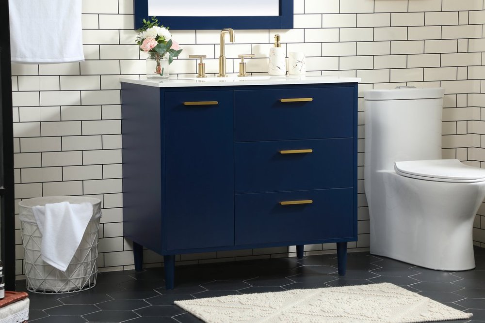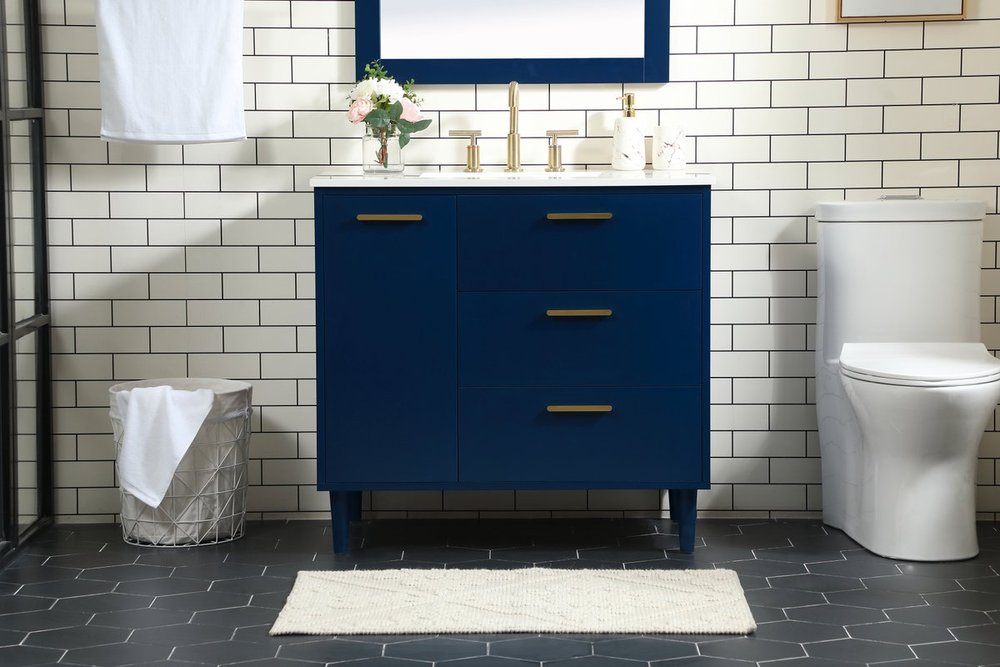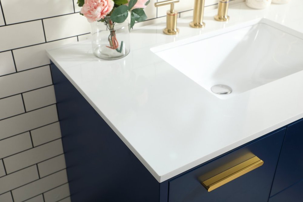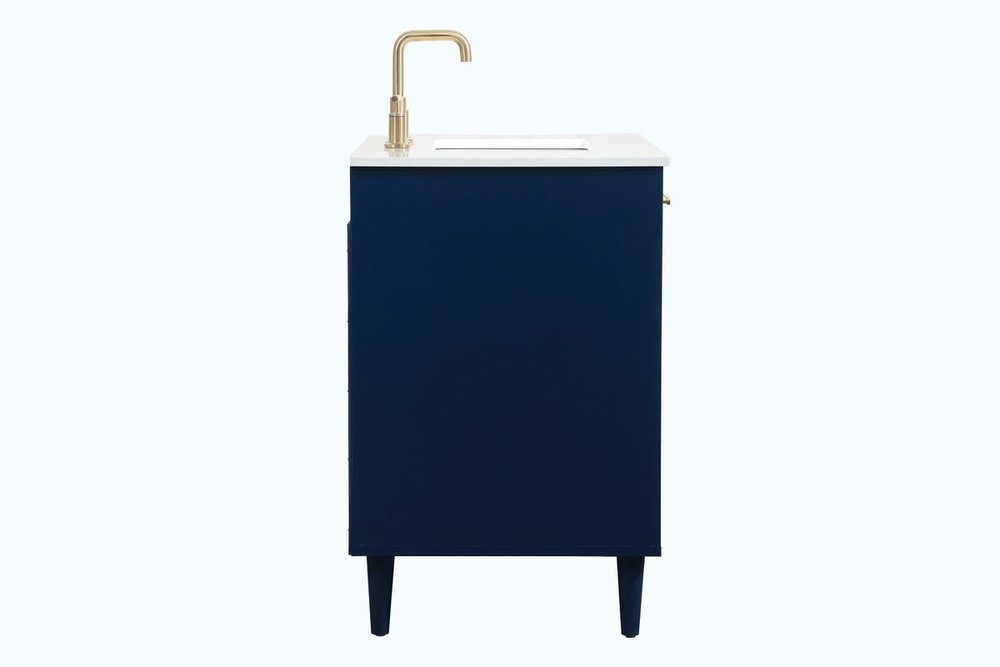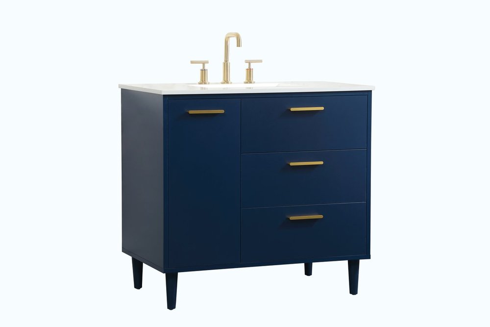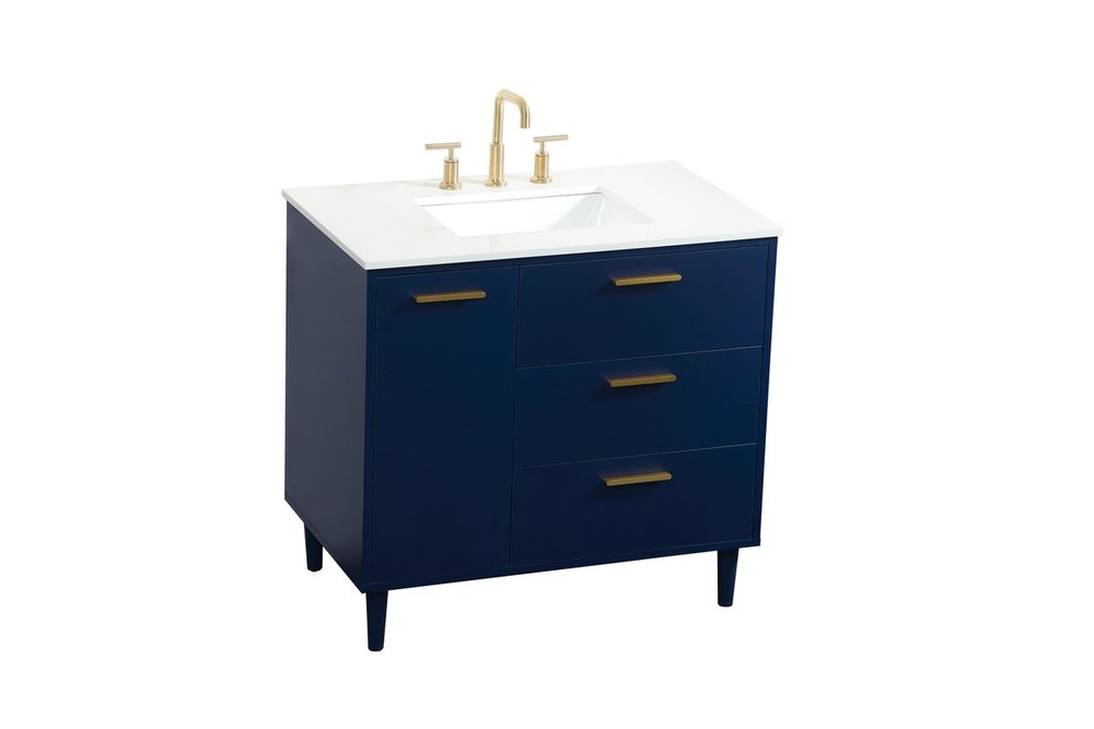 Modern sophistication is defined with the blue finish and gold barpulls of this vanity and slender tapered legs. Its length makes it the perfect addition to any sized home, and saves space with its storage area hidden behind the Single cabinet door and two bottom drawers. Topped with a highly durable engineered stone countertop and a porcelain undermount sink, this modern design will become your focal point of your bathroom or powder room. Equipped with soft-closing drawer and doors adds a quiet functional touch.