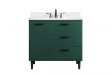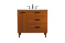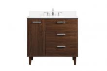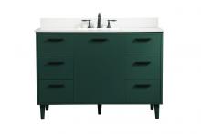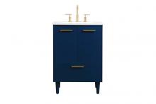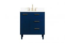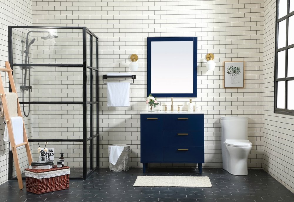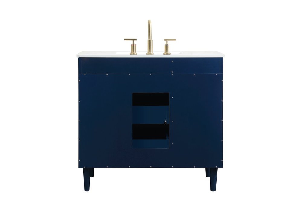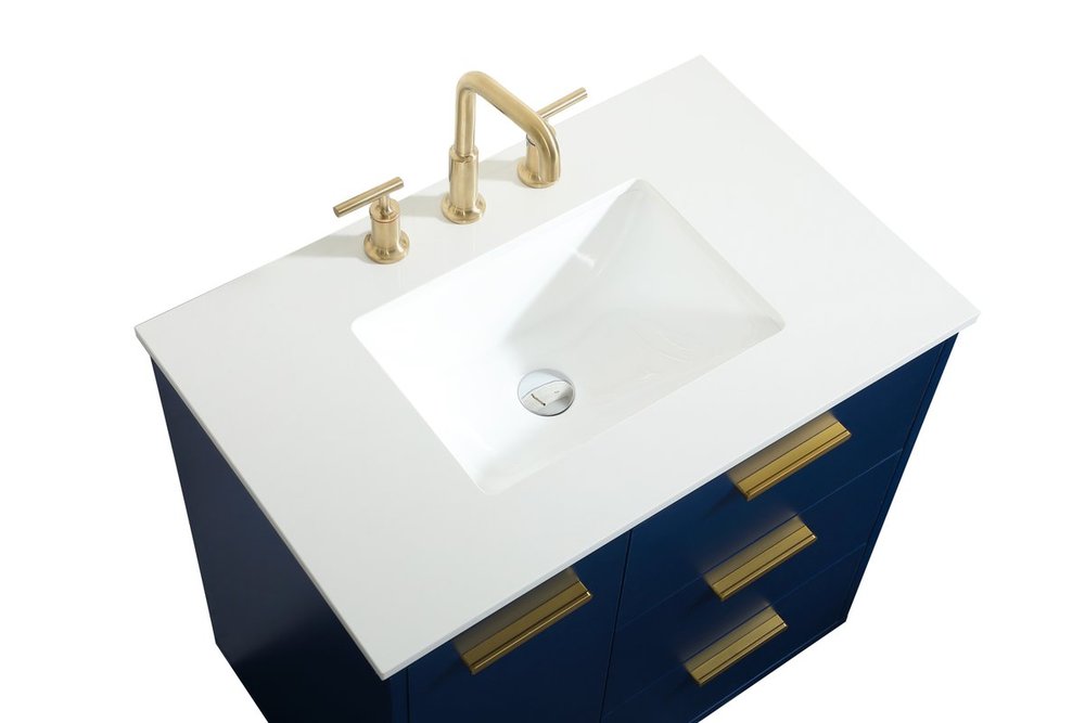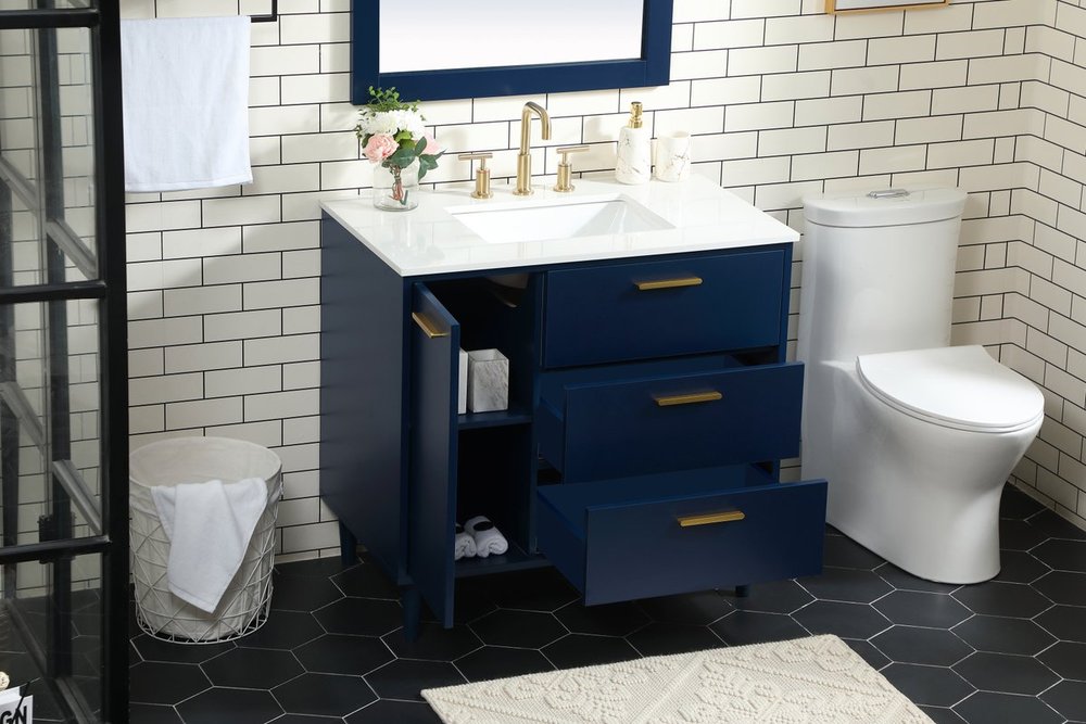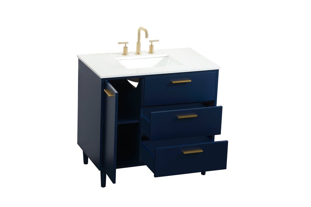 Modern sophistication is defined with the blue finish and gold barpulls of this vanity and slender tapered legs. Its length makes it the perfect addition to any sized home, and saves space with its storage area hidden behind the Single cabinet door and two bottom drawers. Topped with a highly durable engineered stone countertop and a porcelain undermount sink, this modern design will become your focal point of your bathroom or powder room. Equipped with soft-closing drawer and doors adds a quiet functional touch.