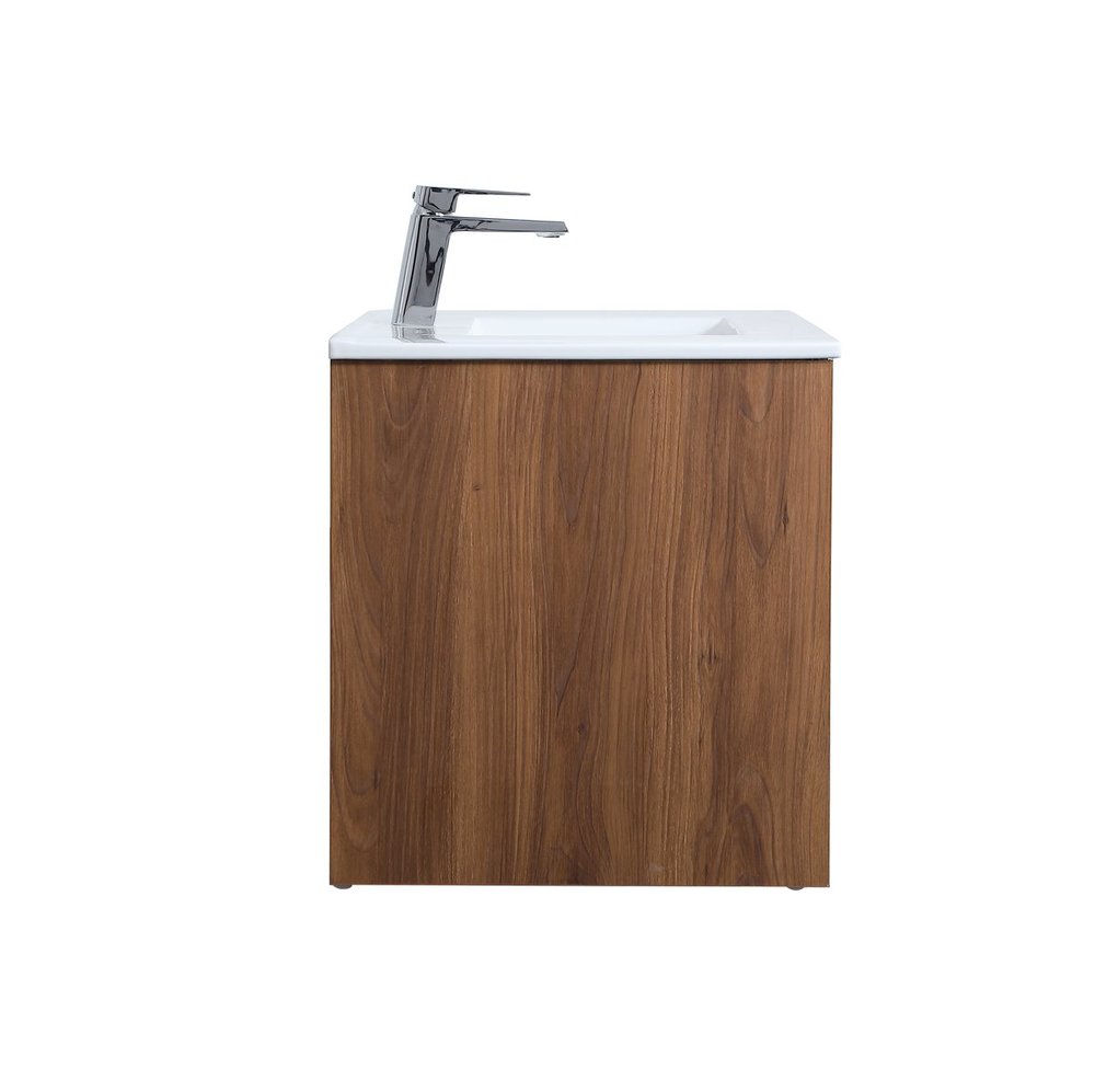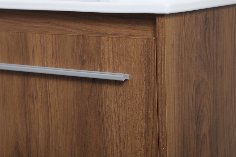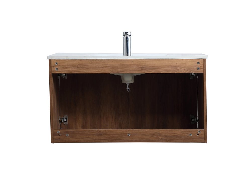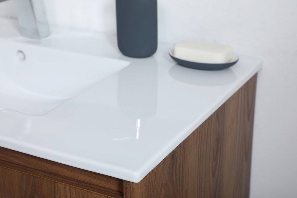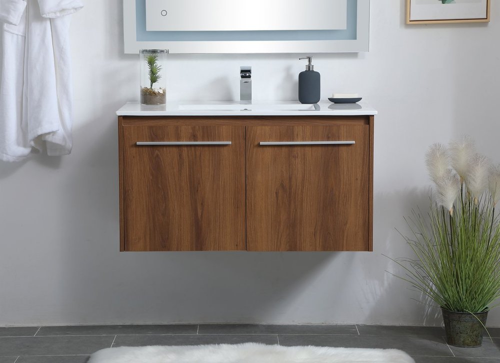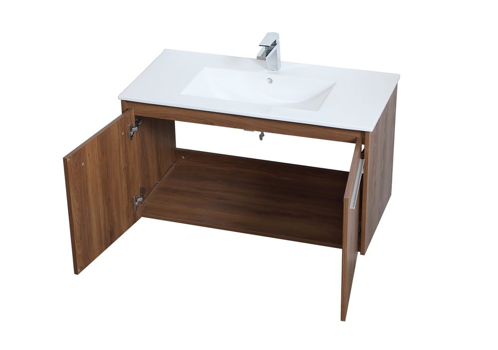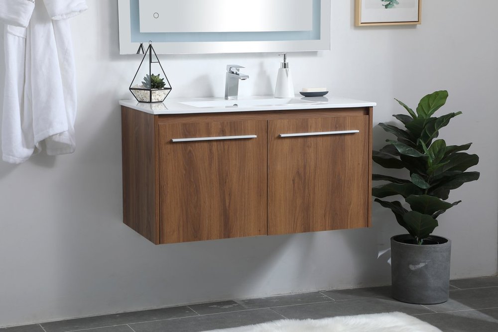 The contemporary simplicity of this 36" floating vanity in a walnut brown finish will help open the space and add stunning modern flair to your bathroom or powder room. The open space below makes it easy to show off your tiles and to clean the floor with ease--it's also the perfect place for a hamper. Double doors open to reveal plentiful of storage pace to store all of your bathroom miscellany. The clean lines that permeate through the design will surely create a fresh look in your home.