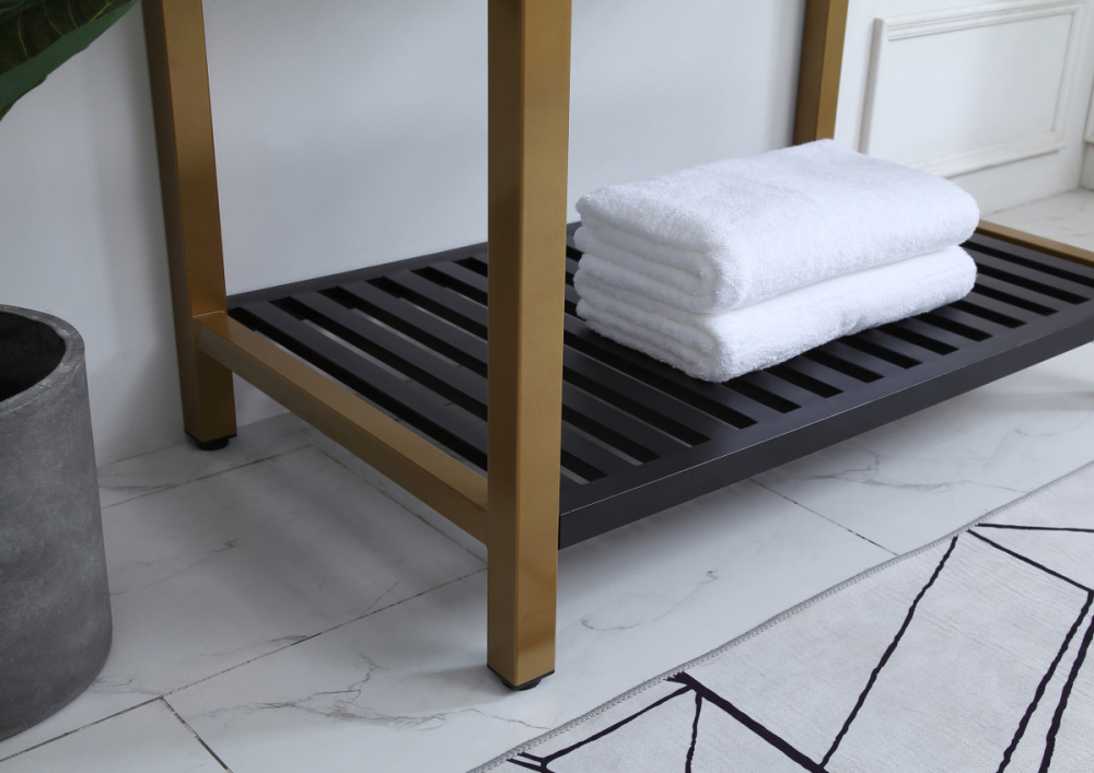In true minimalistic spirit, this 36" vanity shines with pared down elegance. Bold clean lines build up the metal vanity, creating a modern simplicity that adds visual liveliness and complements any bathroom or powder room. The bottom shelf lets you put away any extra towels or bathroom essentials, and its shining white undermount sink creates contrast against the finish. Its bold graphic style will create a contemporary style in your home.