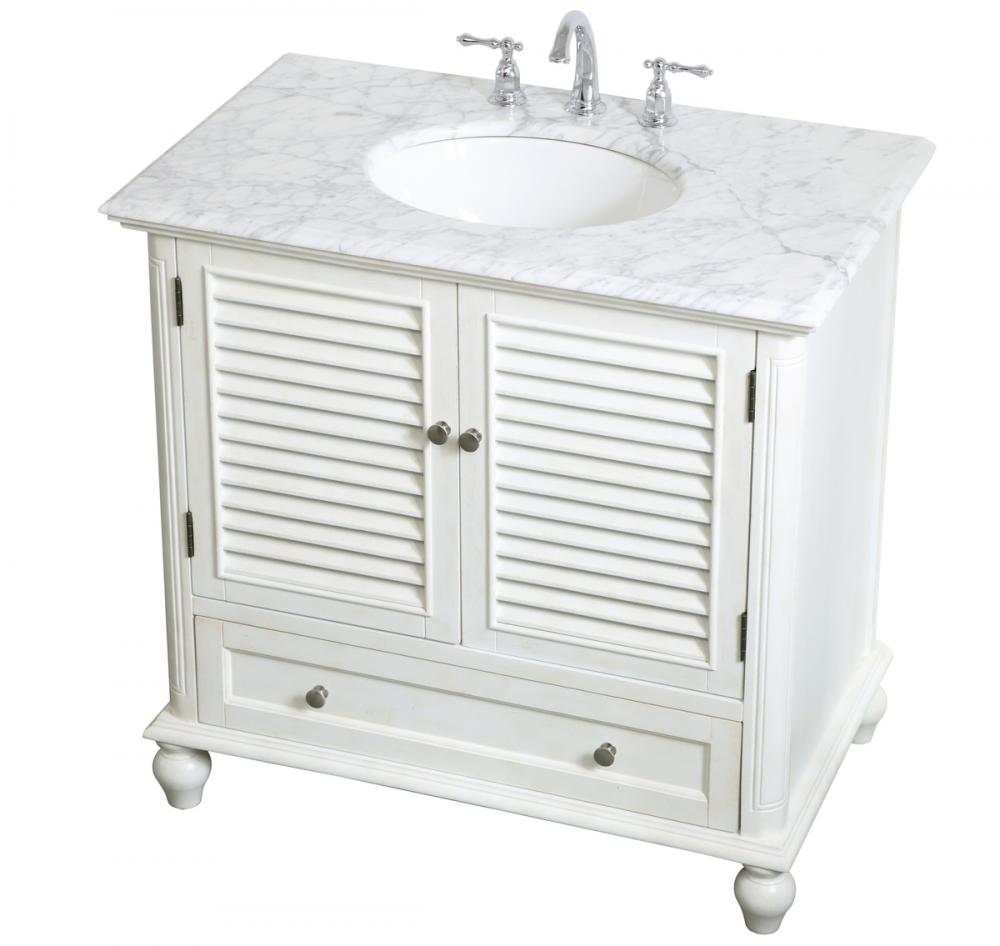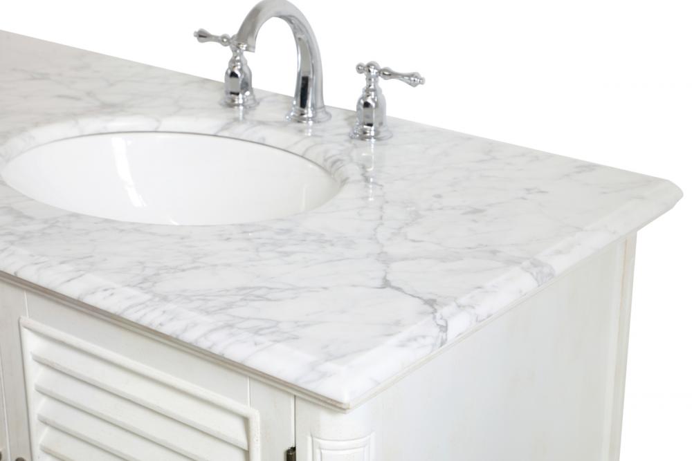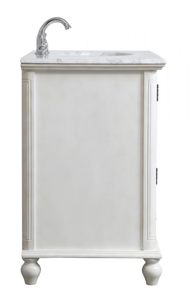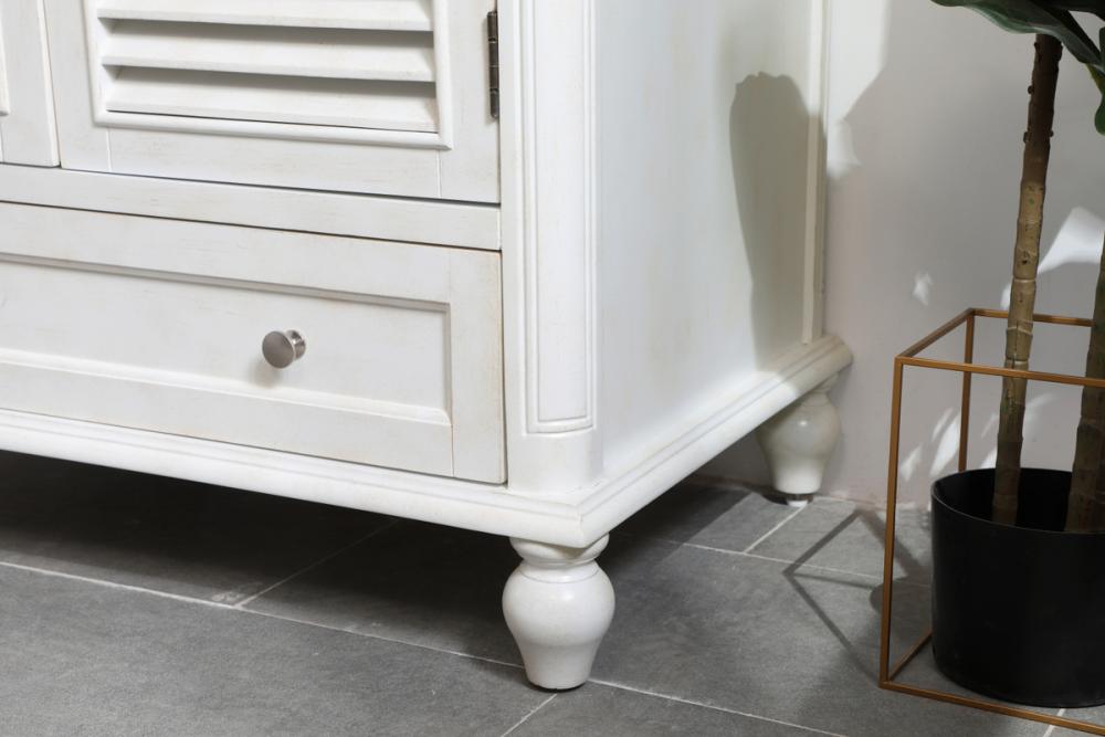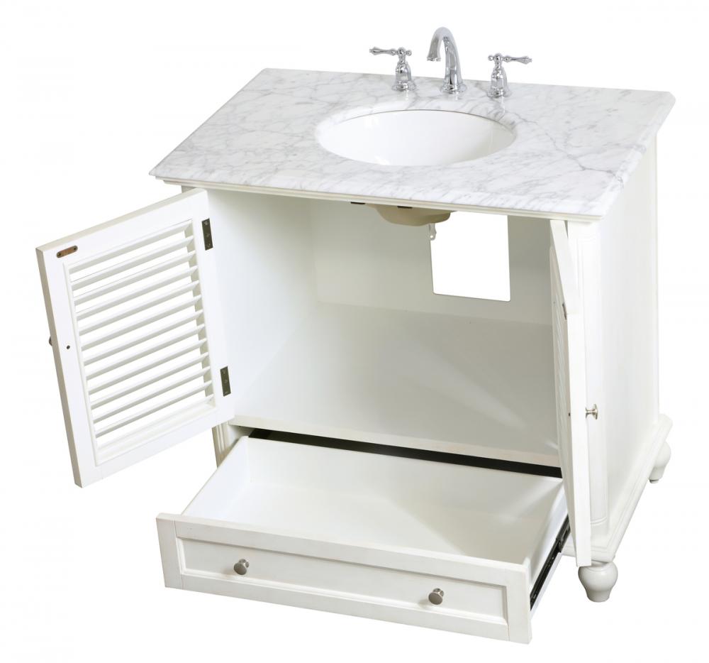 Never compromise beauty--the Rhodes collection stunning vanity in an antique white finish will add lovely sophistication and complement any bathroom or powder room, while utilizing its charm and function to provide you with ample storage spaces. Brushed nickel knobs gently adorn the shuttered cabinet doors and long drawer at the base, allowing for you to store away your bathroom essentials. The Carrara white marble countertop, porcelain undermount sink, dignified subtle engravings on the side edges, and rounded legs all come together to create contemporary beauty. Work with your space, and design a beautiful room, no matter the size.