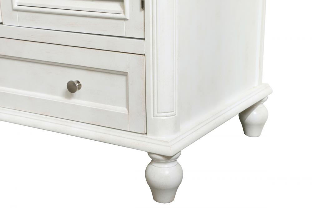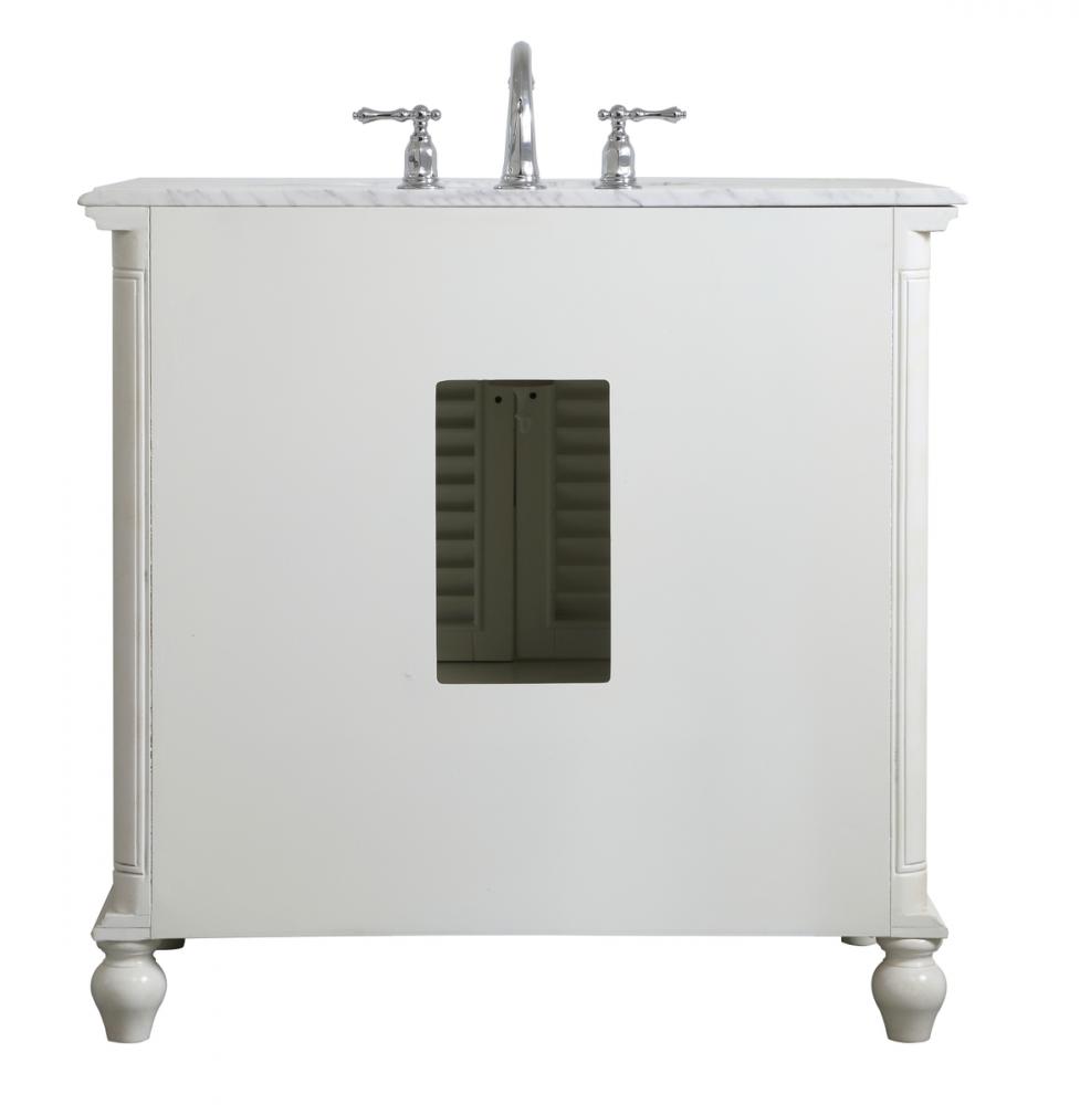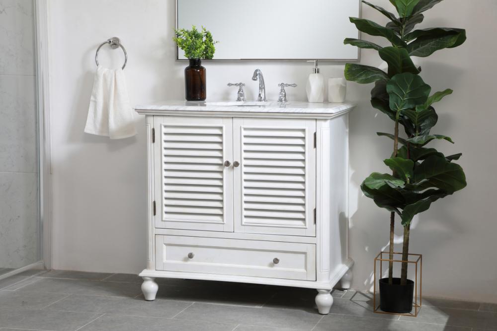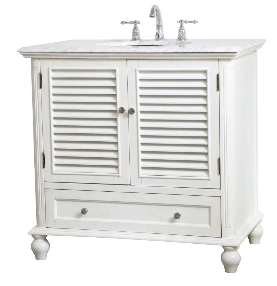 Never compromise beauty--the Rhodes collection stunning vanity in an antique white finish will add lovely sophistication and complement any bathroom or powder room, while utilizing its charm and function to provide you with ample storage spaces. Brushed nickel knobs gently adorn the shuttered cabinet doors and long drawer at the base, allowing for you to store away your bathroom essentials. The Carrara white marble countertop, porcelain undermount sink, dignified subtle engravings on the side edges, and rounded legs all come together to create contemporary beauty. Work with your space, and design a beautiful room, no matter the size.