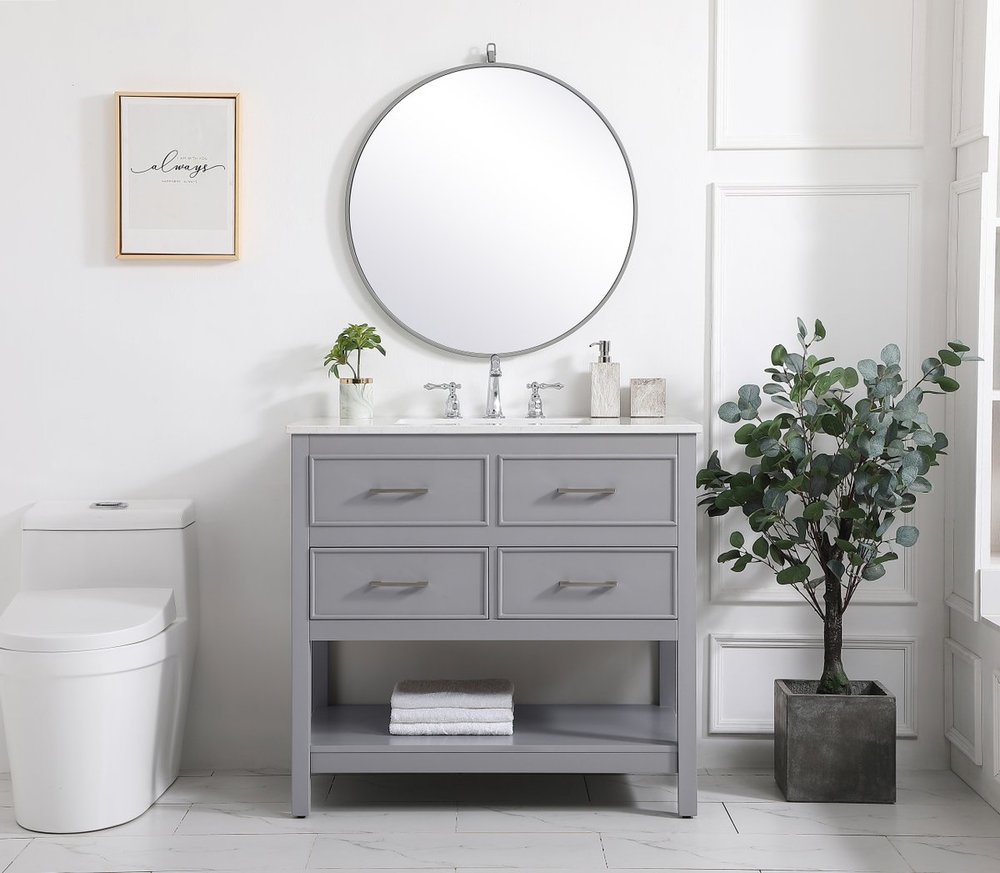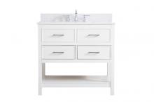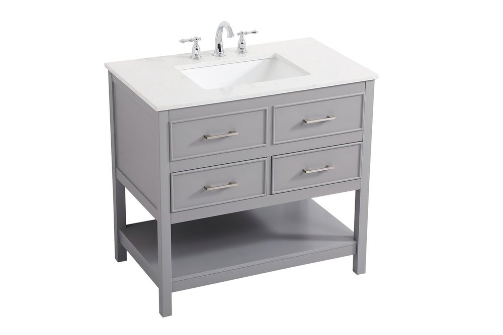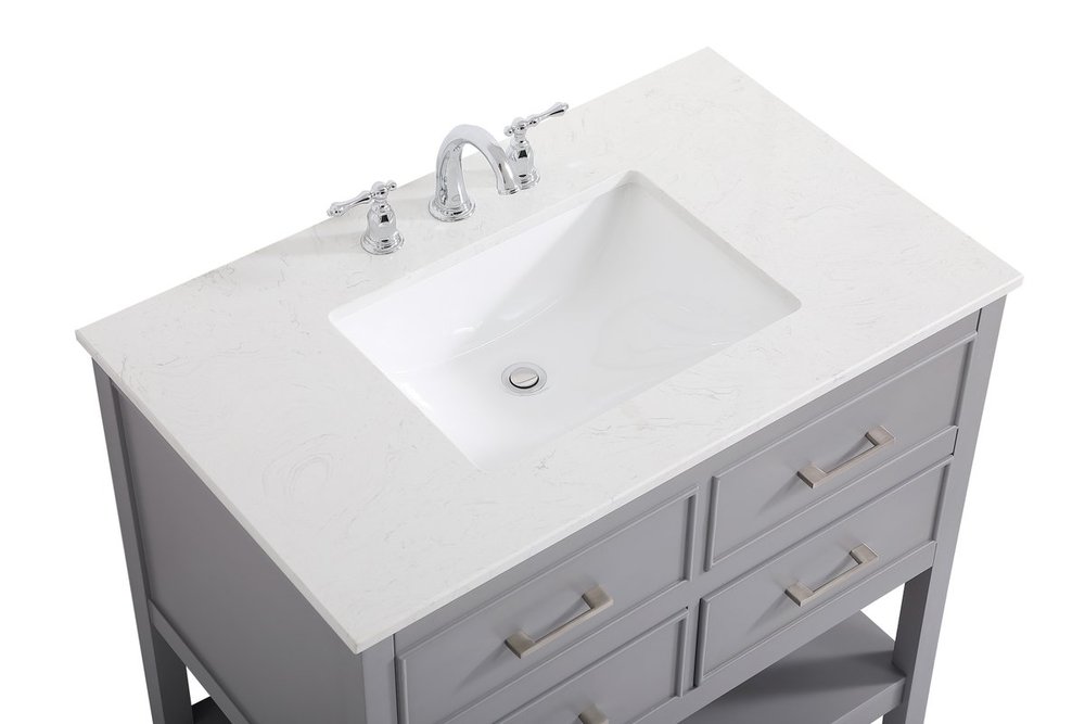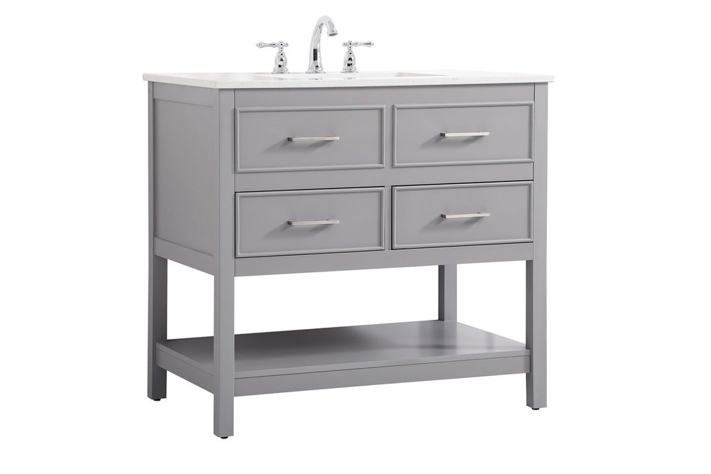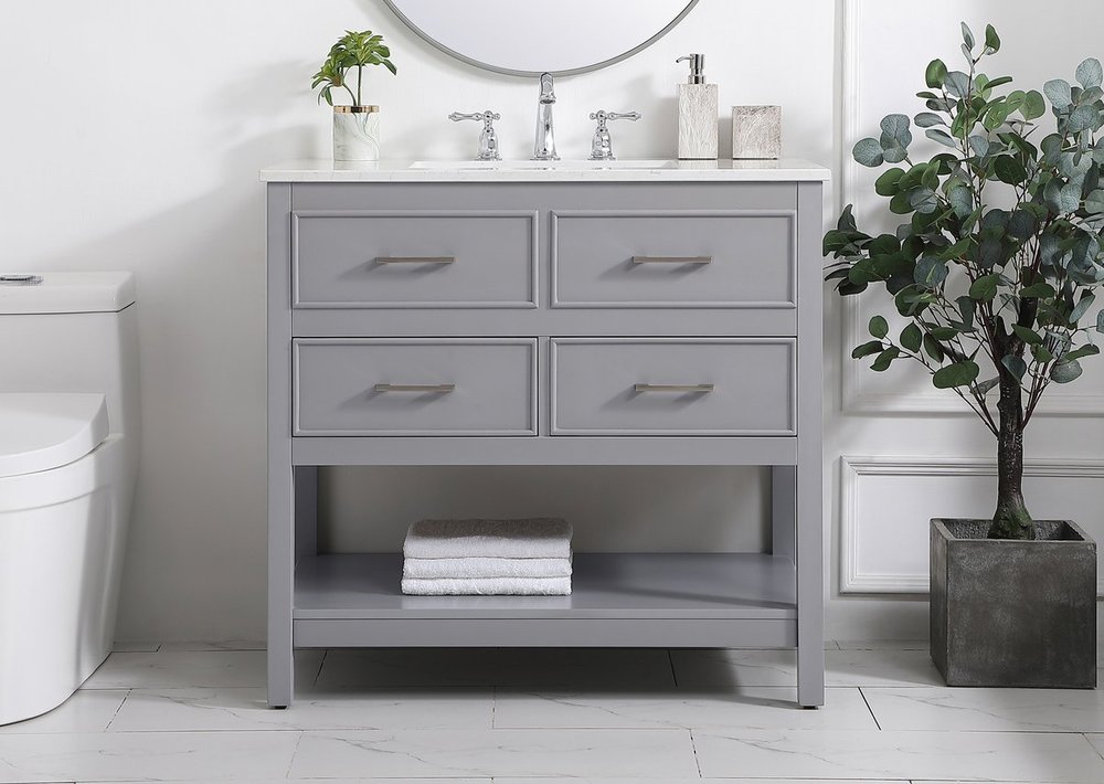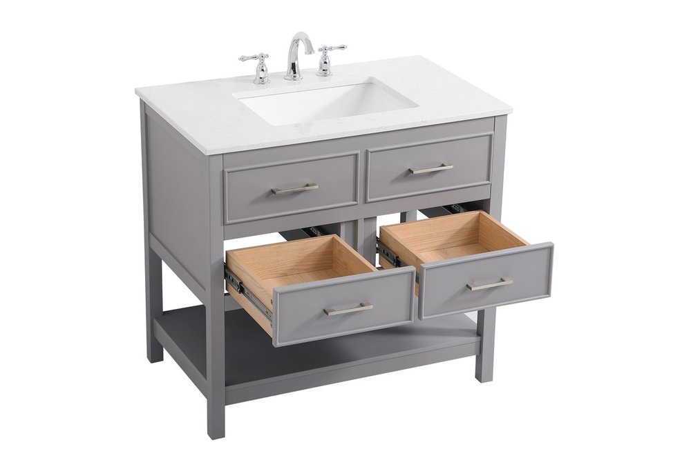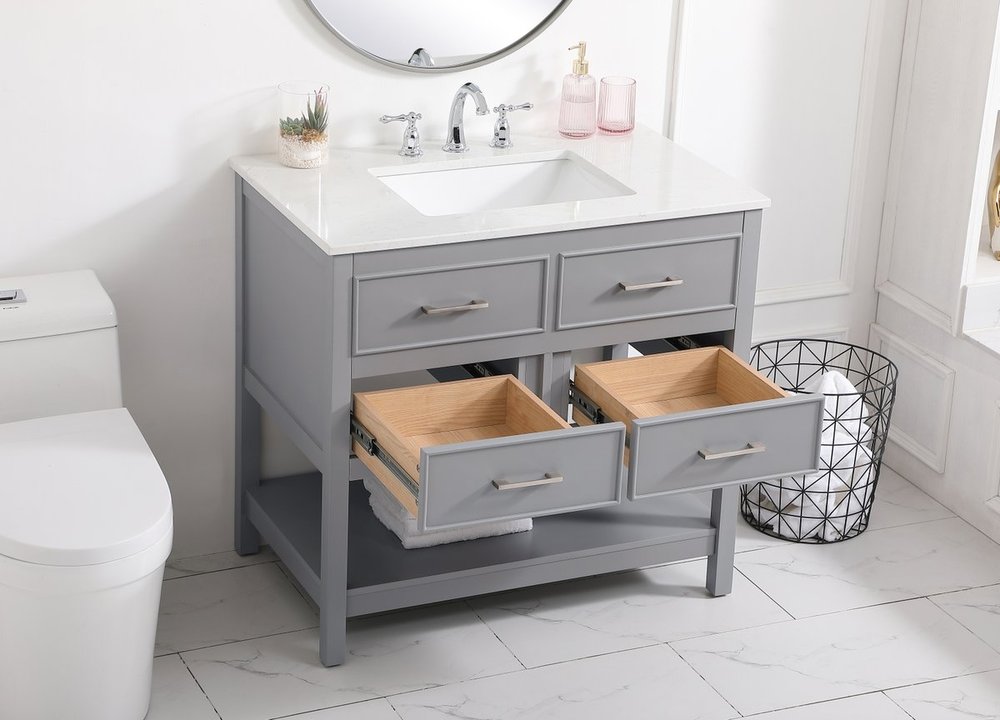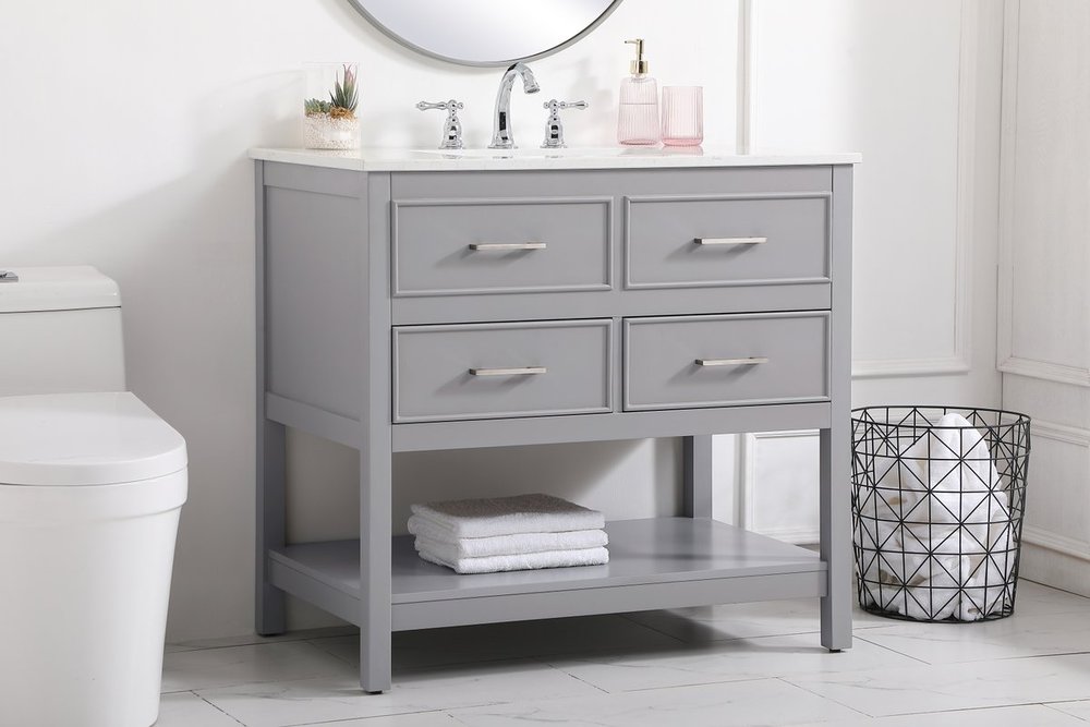 Make the most of your space with this traditional style bathroom vanity. Complements well with many aesthetics with its beautiful finish, calacatta engineered marble countertop, and the contemporary slender handle bar that sits on two upper false drawer and two lower u-shaped drawer, allowing you to store an assortment of bathroom essentials. The lower shelf makes it the perfect space to hold new towels for your guests. This compact vanity ensures both form and function in your bathroom or powder room for you and your guests.