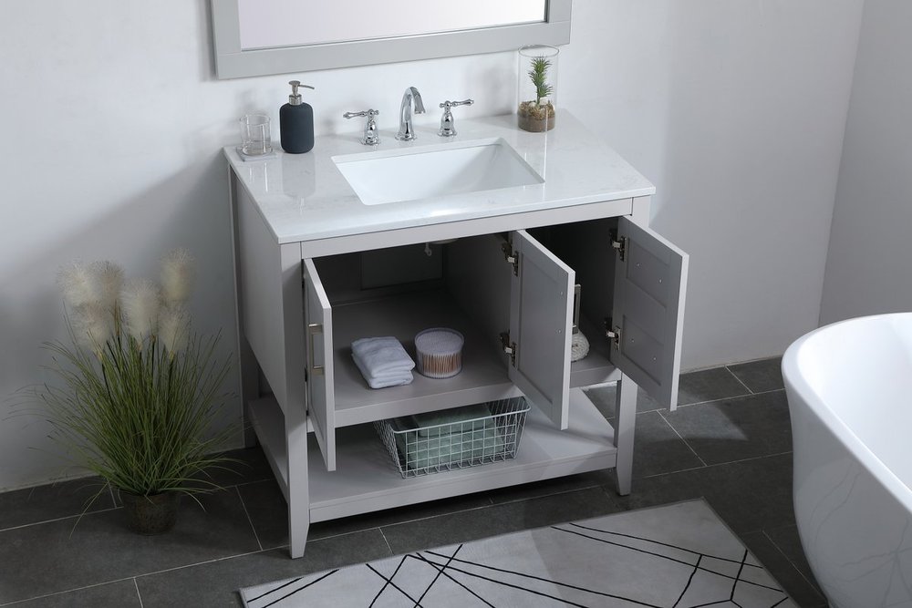 The nonchalant attitude of this 36" traditional grey finish vanity will have you wanting more. The slender brushed nickel handle bars open the 3 cabinet doors to reveal ample storage space to put away and store bathroom essentials, and the open space below allows for you to place clean towels on the rack. Topped with a Calacatta engineered marble countertop, you and your guests will enjoy this easy going vanity.