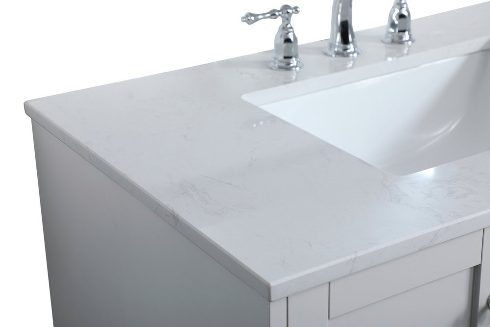 While unassuming, this 36" vanity in a grey finish sure knows how to redefine luxury. The sleek brushed nickel knobs adorn the double cabinet doors and 3 drawers which allow you to store your bathroom toiletries and necessities. Standing strong on oblique legs and dressed with a Calacatta engineered marble countertop, this vanity will surely create beauty and casual elegance in your bathroom or powder room.