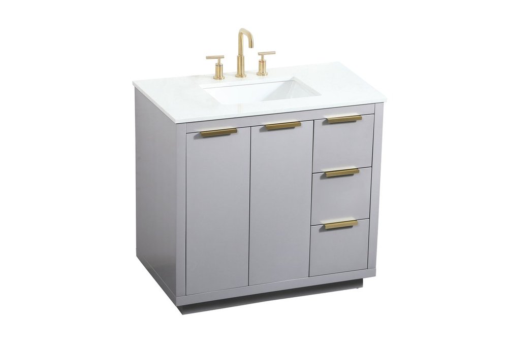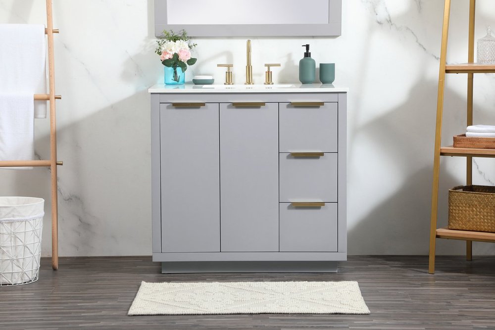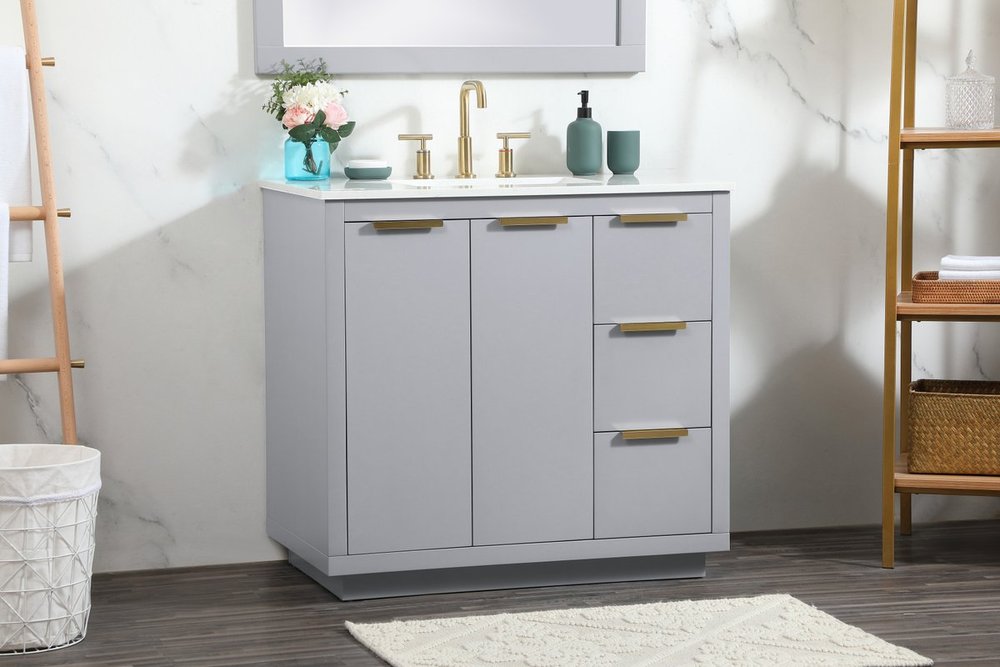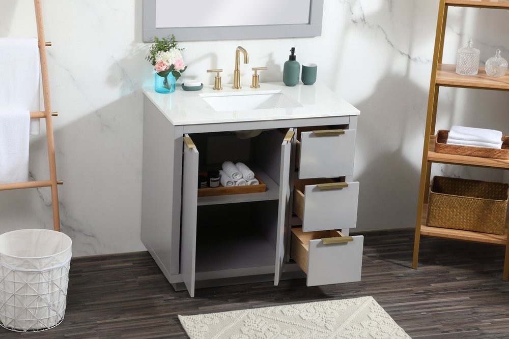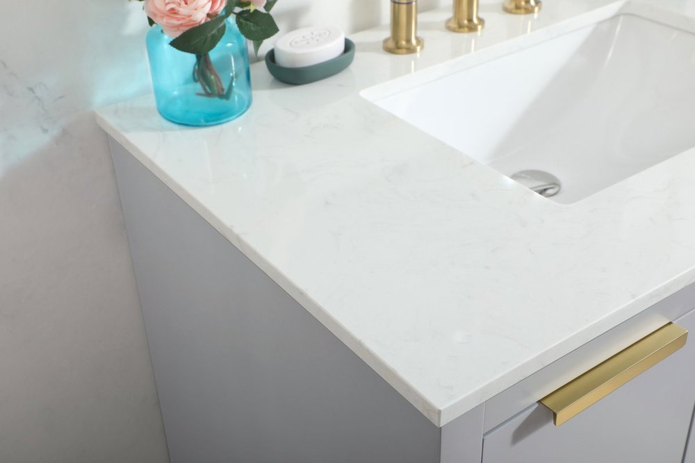 The Blake collection vanity cabinet will be a modern furniture statement piece in your bathroom. Our color combination creates a calming atmosphere in the room. The gold handles bring a vibrant touch to balance the vanity. With the simplistic clean lines, the cabinet catches eyes with its beautiful smooth surface. Open the cabinet doors to store what you desire and make use of the spacious area. Gently close the door and the soft closing glides will quietly closes the door. To top it off, the calacatta engineered marble adds a luxury and modern finish to the durable stonetop.