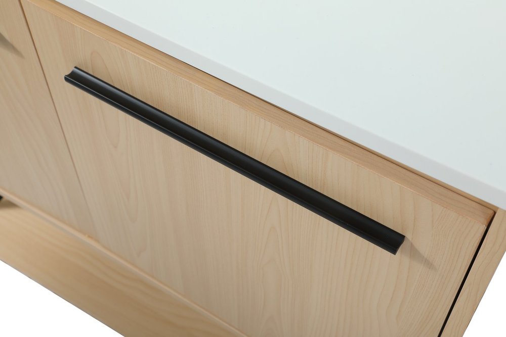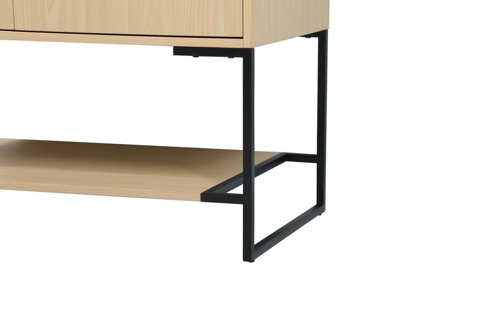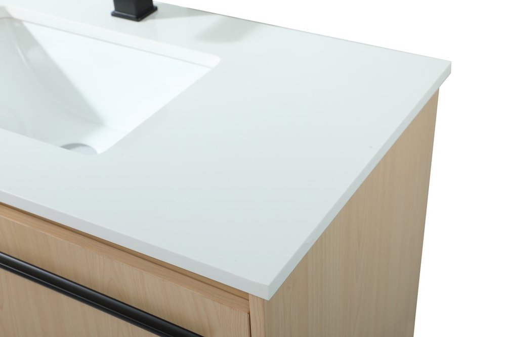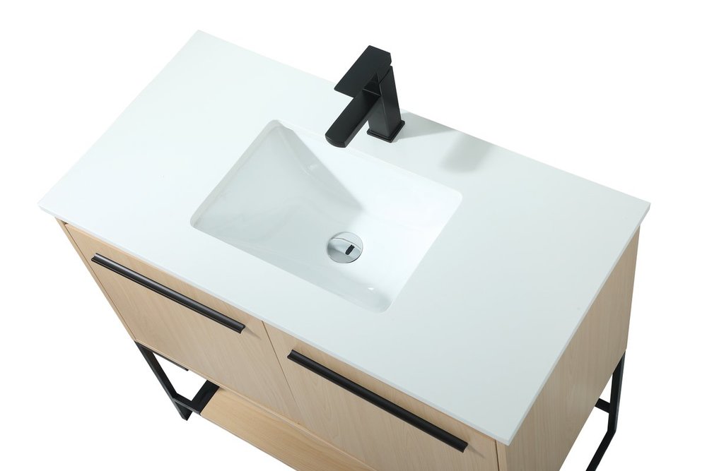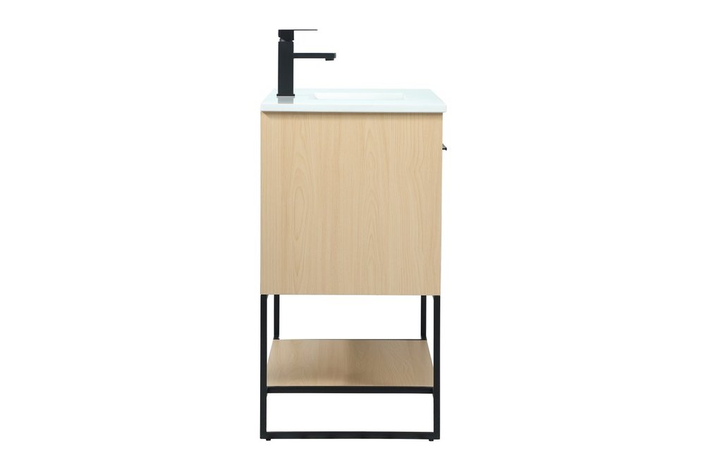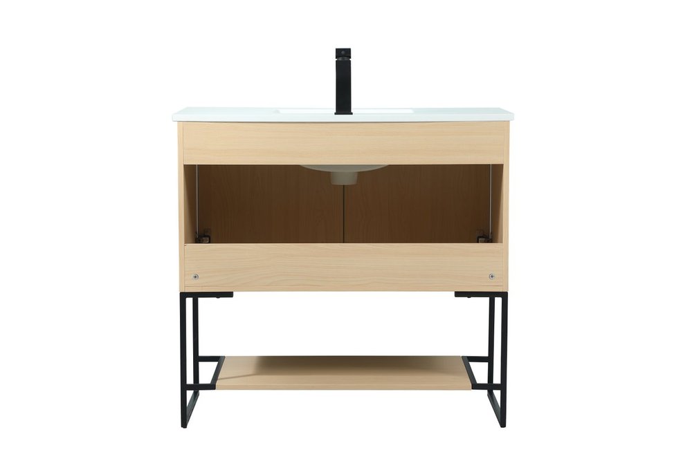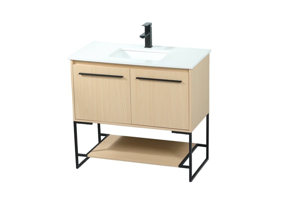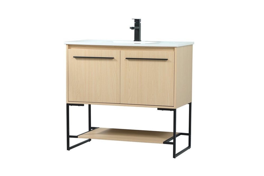 Live in modern comfort with this 36" maple finish vanity. Dressed in a maple and sleek black metal hardware, its contemporary style will have your bathroom or powder room elevated in industrial sophistication. The open shelf at the base and two doors reveal ample storage space for your bathroom essentials and miscellany. Clean lines create its own visual interest, adding trendy looks to your already chic room.