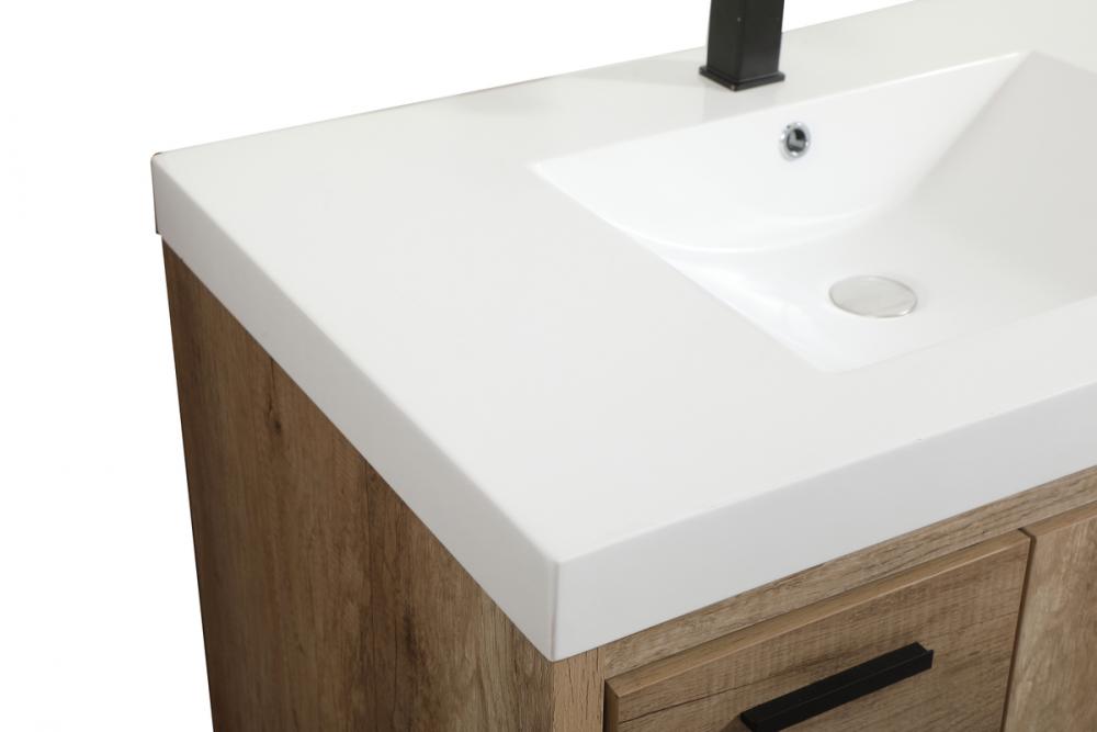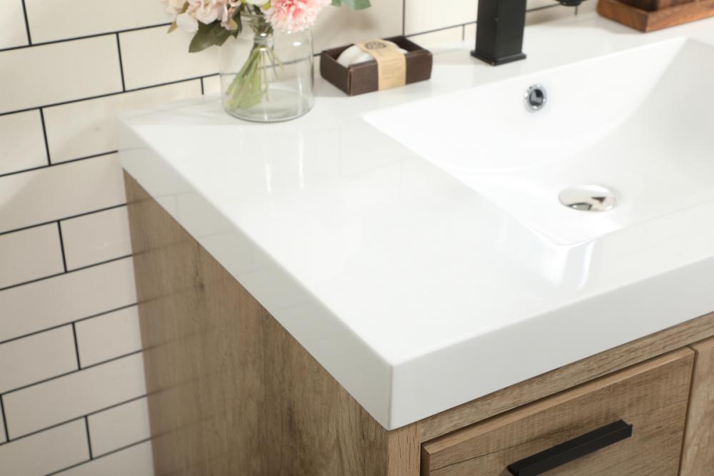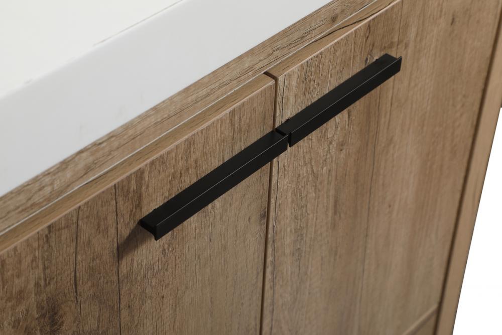Modern sophistication is defined within the wood finish look and black barpulls of this vanity. Its length makes it the perfect addition to any sized home, and saves space with its storage area hidden behind the double cabinet doors and one bottom drawers. Topped with a highly durable thick resin white counter top and an integrated sink, this modern design will add everlasting class to your bathroom and powder room.