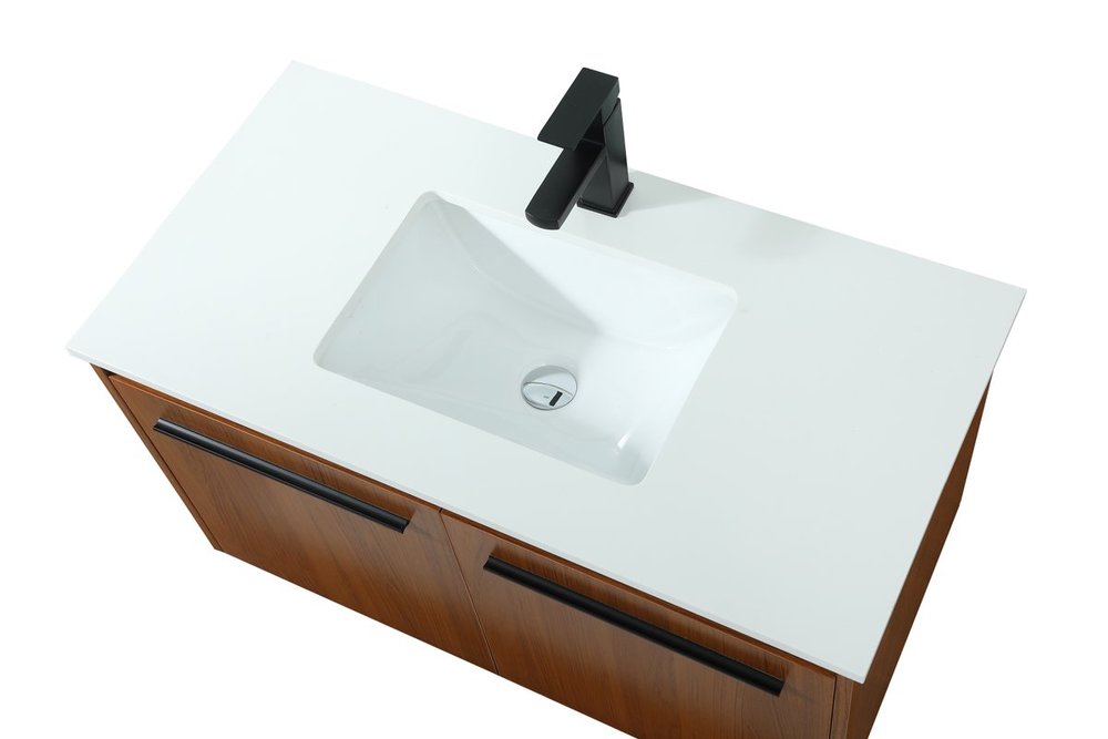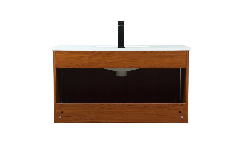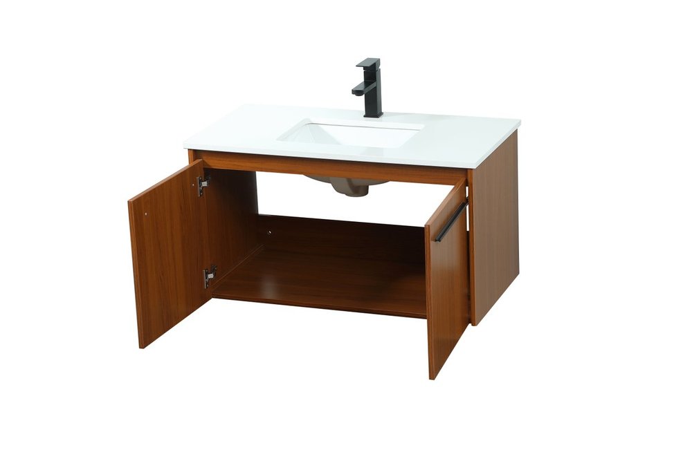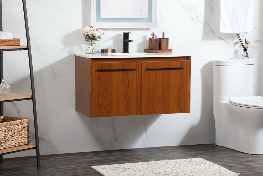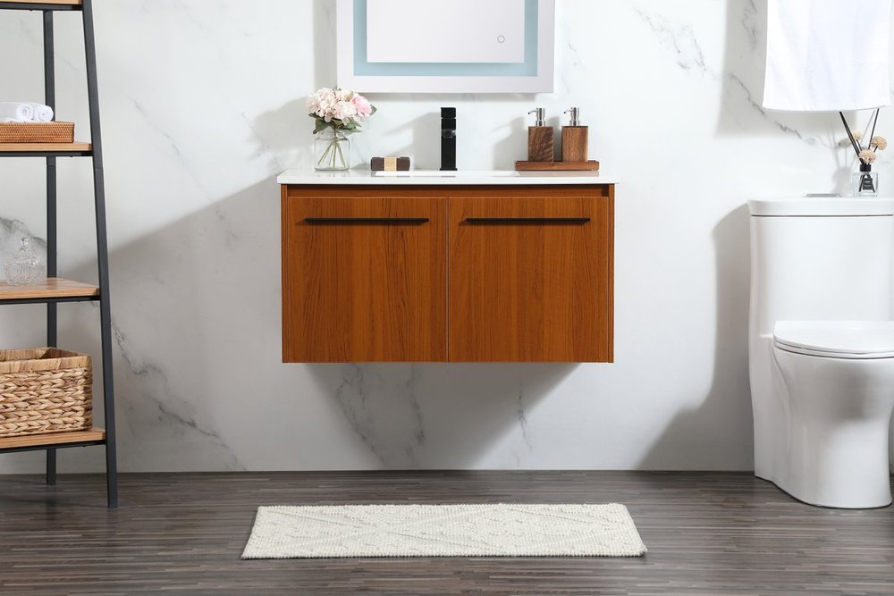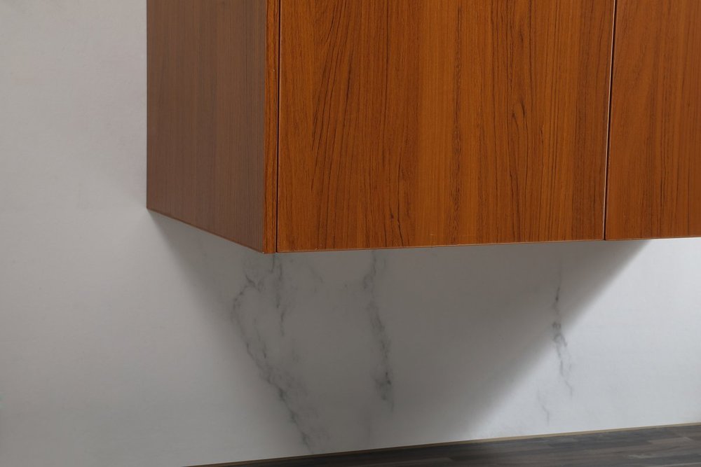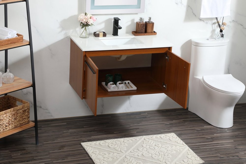 Save space and make your bathroom appear bigger with this floating vanity that comes in several finishes. Its minimal design will have you in awe, while its clean lines will leave your room feeling fresh and uncluttered. The Single cabinet opens with soft closing doors that allows for storage to place extra towels or various other essentials. Its low maintenance and durable engineered marble top will surely last through many washes.