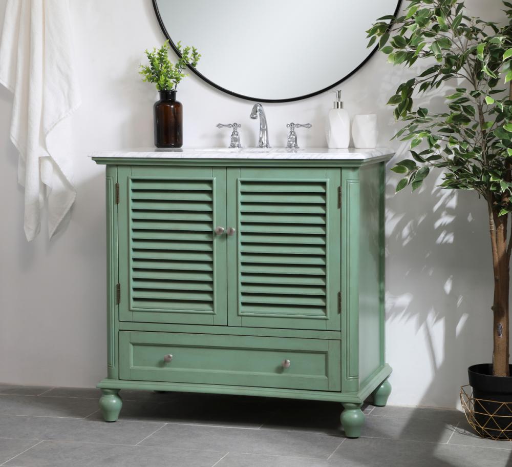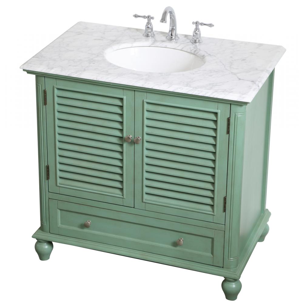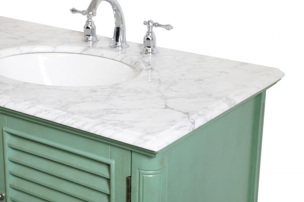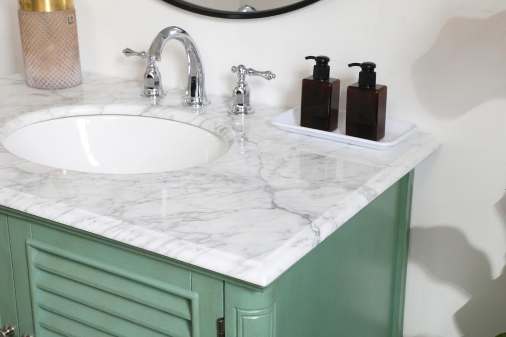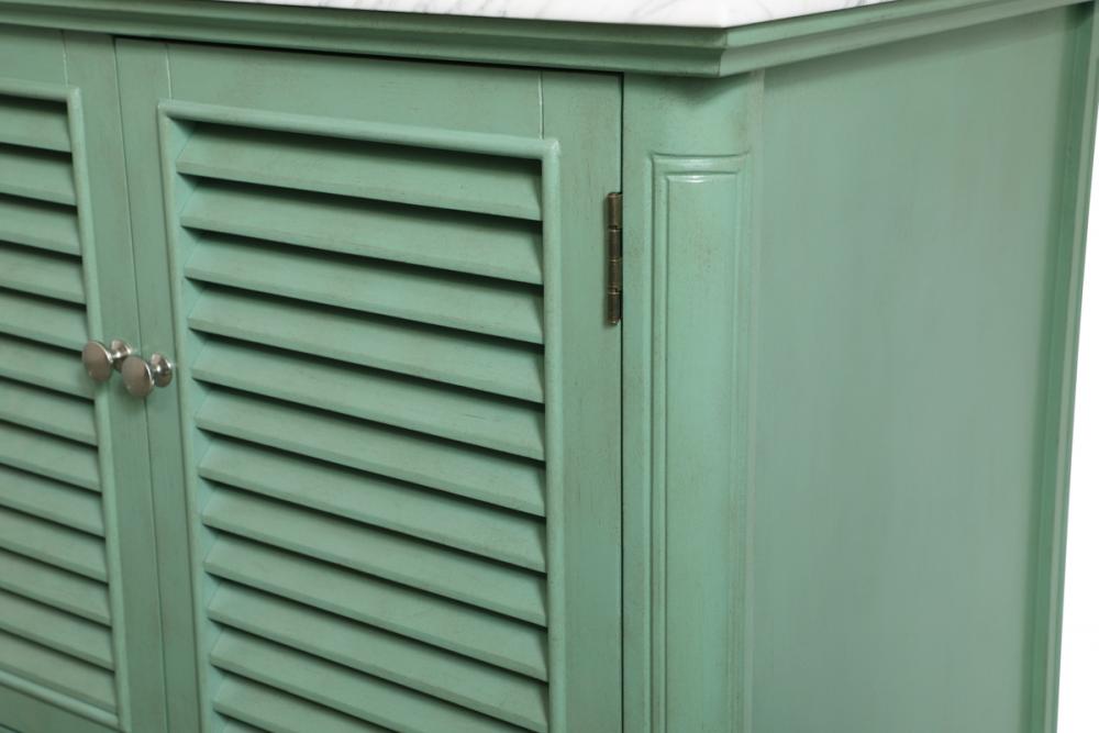 Never compromise beauty--the Rhodes collection stunning vanity in a vintage mint finish will add a lovely splash of color and complement any bathroom or powder room, while utilizing its charm and function to provide you with ample storage spaces. Brushed nickel knobs gently adorn the shuttered cabinet doors and long drawer at the base, allowing for you to store away your bathroom essentials. The Carrara white marble countertop, porcelain undermount sink, dignified subtle engravings on the side edges, and rounded legs all come together to create contemporary beauty. Work with your space, and design a beautiful room, no matter the size.