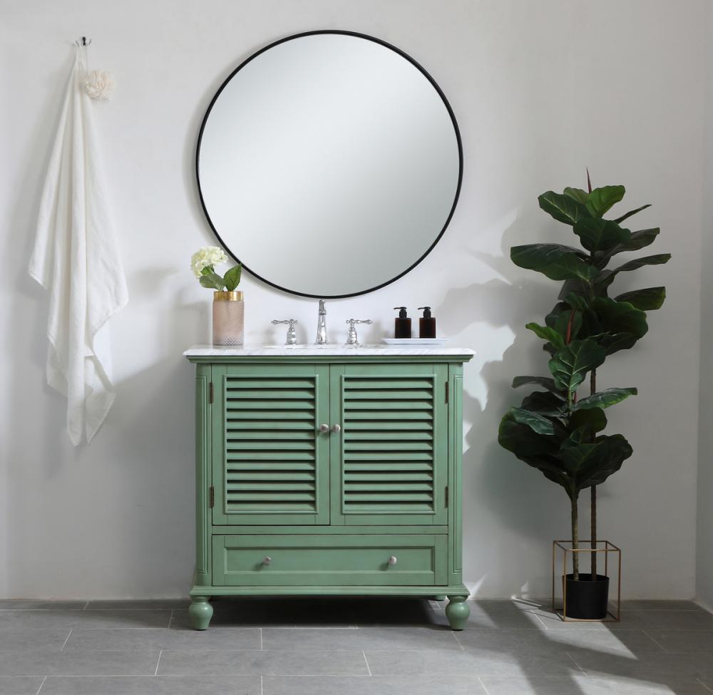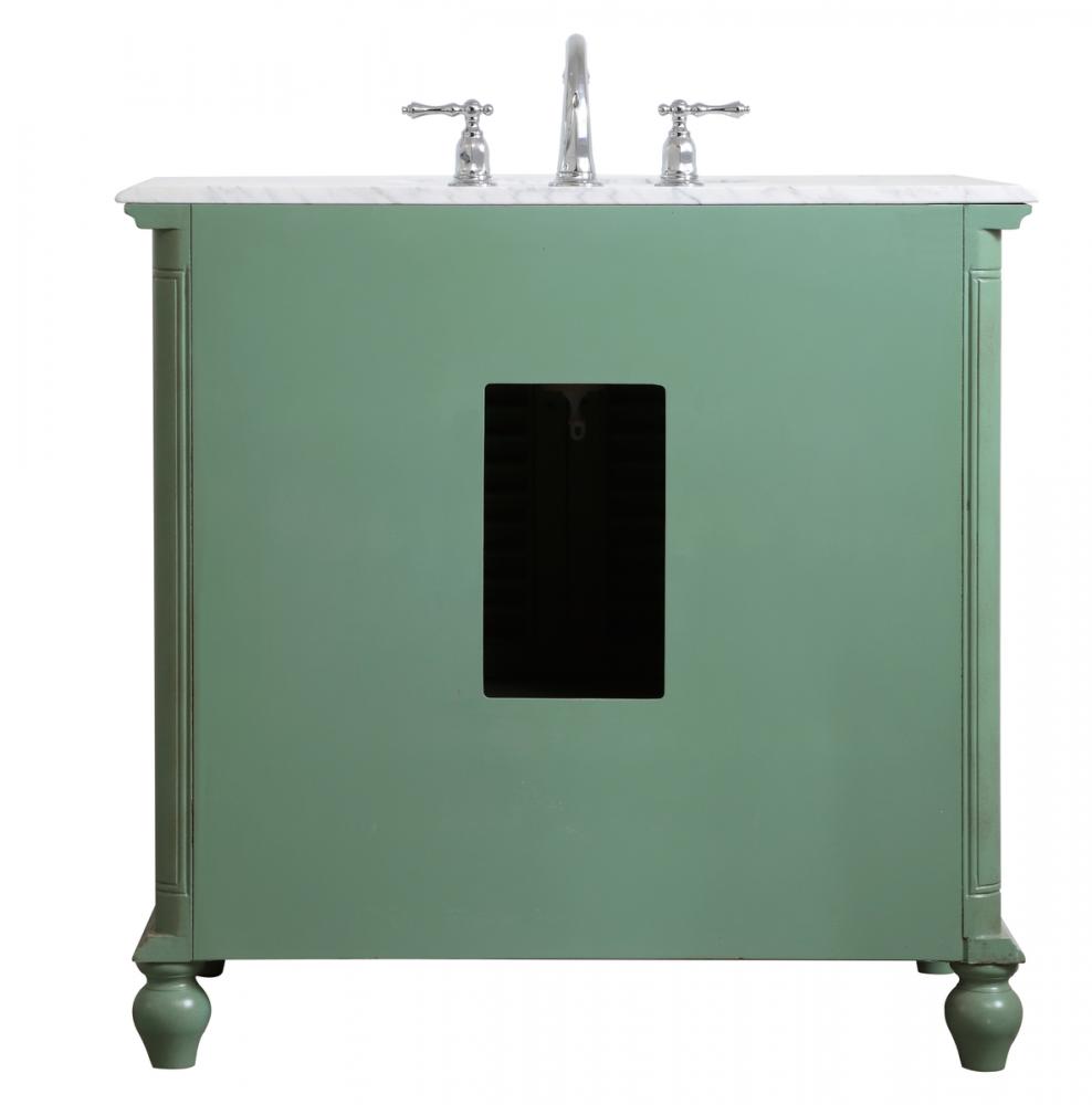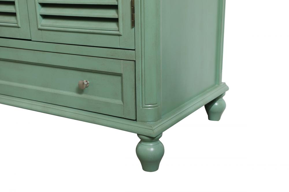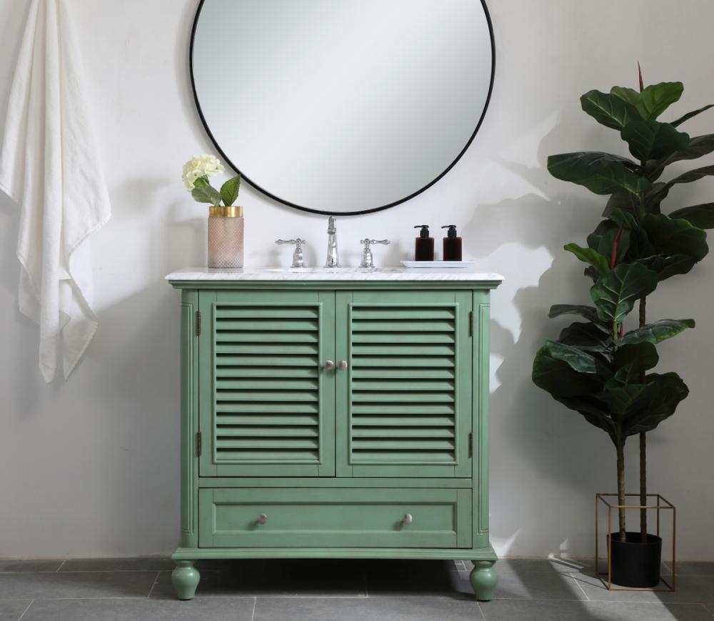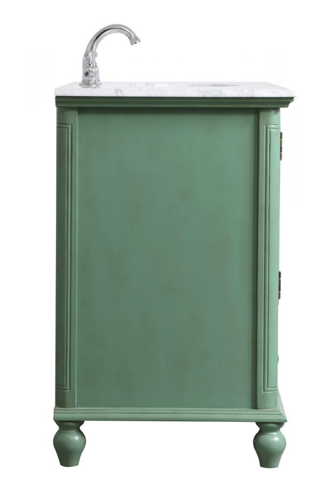 Never compromise beauty--the Rhodes collection stunning vanity in a vintage mint finish will add a lovely splash of color and complement any bathroom or powder room, while utilizing its charm and function to provide you with ample storage spaces. Brushed nickel knobs gently adorn the shuttered cabinet doors and long drawer at the base, allowing for you to store away your bathroom essentials. The Carrara white marble countertop, porcelain undermount sink, dignified subtle engravings on the side edges, and rounded legs all come together to create contemporary beauty. Work with your space, and design a beautiful room, no matter the size.
