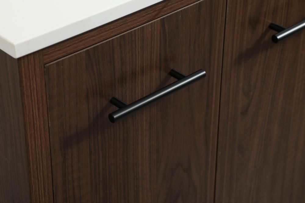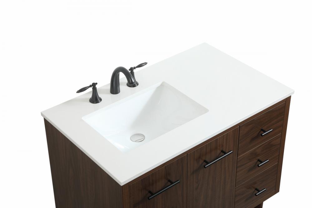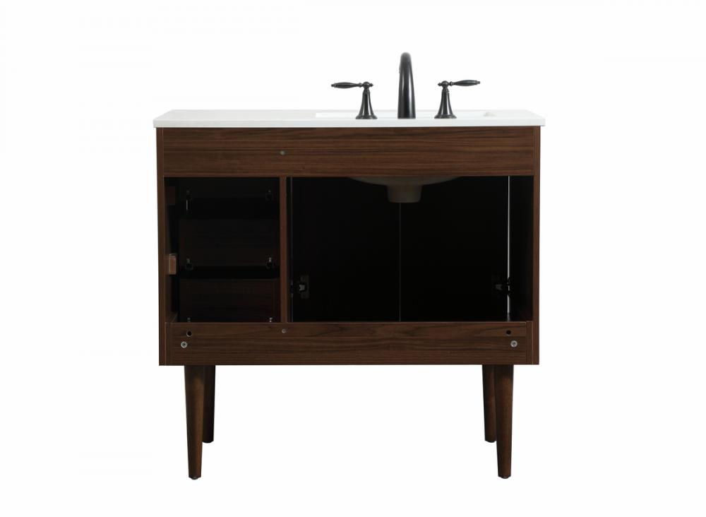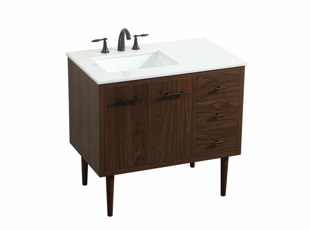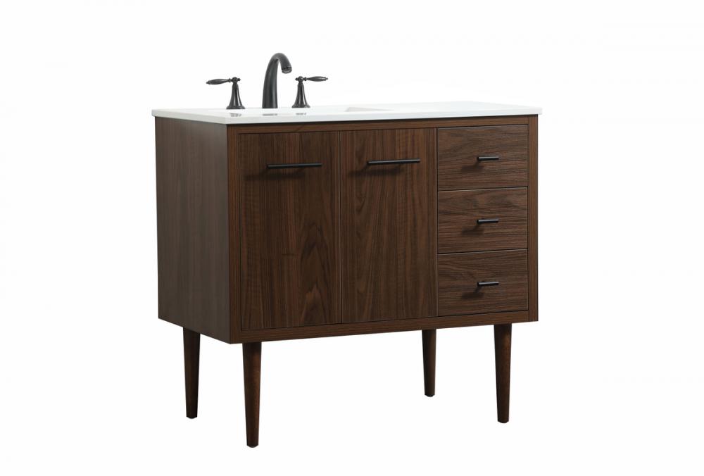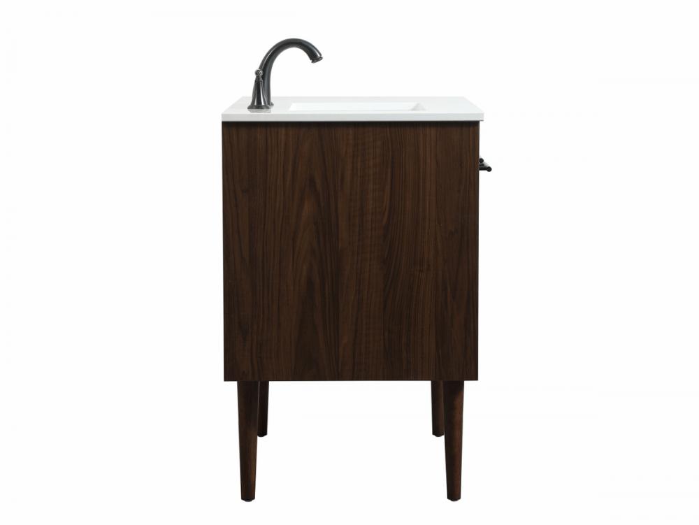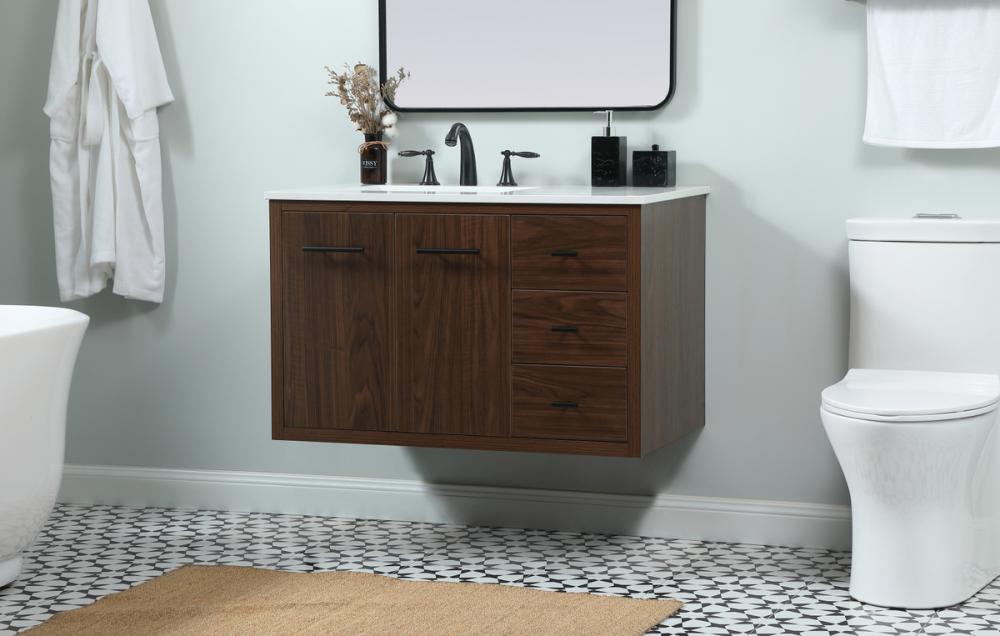 Delve into a world of minimalistic fashion and contemporary styling with this midcentury modern vanity. The clean lines anchors the design, while the straight tapered cylinder legs add subtle interest. Bar pull handle adorns the soft closing door hiding the base of the rectangular porcelain sink and letting you store your bathroom necessities and toiletries. Three soft closing drawers add plenty of storage option. Whether you want to use this as a floating vanity or a freestanding vanity, the choice is yours. The durable ivory white engineered marble countertop complements the manufactured wood base vanity and is built to last.