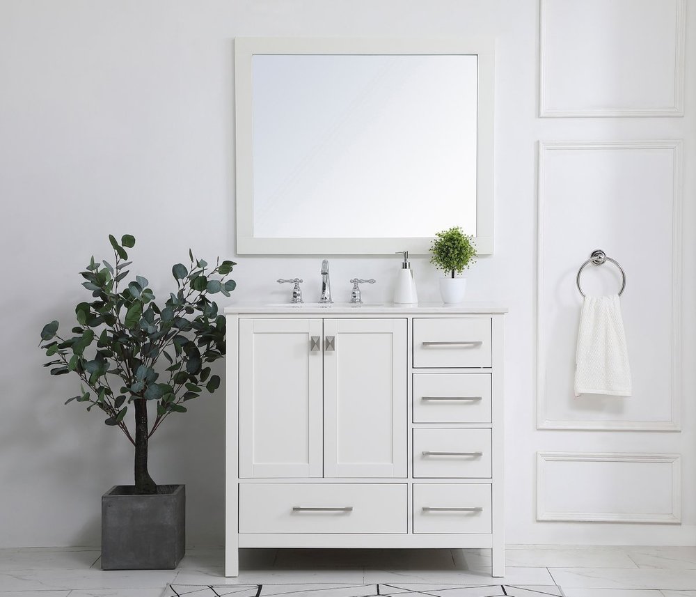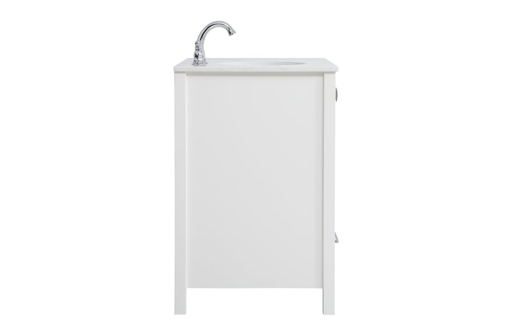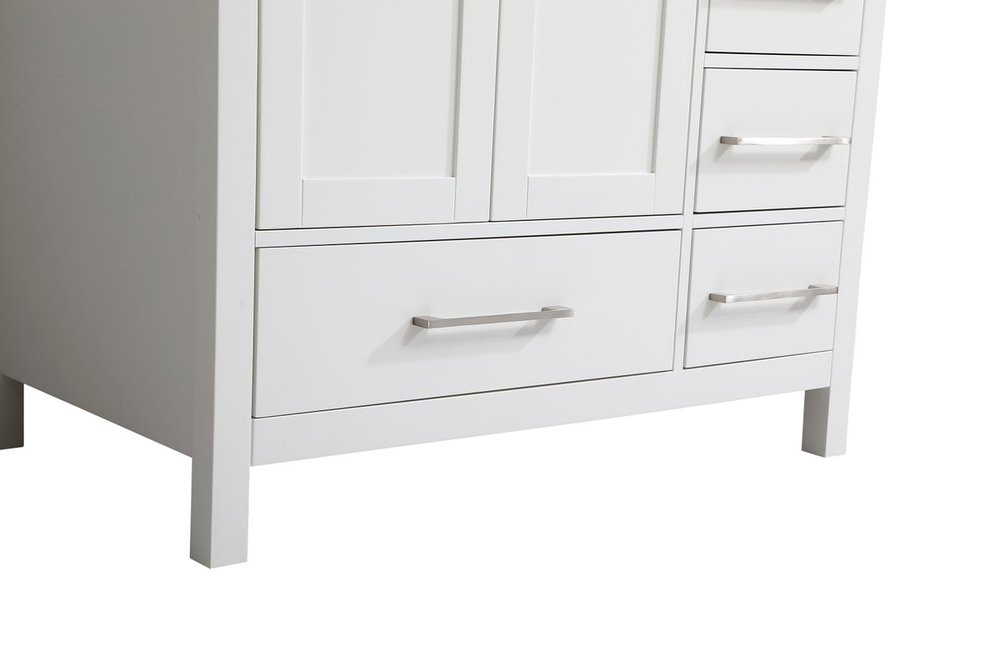 Never compromise beauty--the Irene collection stunning vanity in a white finish will add lovely sophistication and complement any bathroom or powder room, while utilizing its charm and function to provide you with ample storage spaces. Brushed nickel pulls gently adorn the minimalist cabinet doors and drawers at the base, allowing for you to store away your bathroom essentials. The calacatta engineered marble countertop, porcelain undermount sink, dignified subtle engravings on the side edges, and squared legs all come together to create contemporary beauty. Work with your space, and design a beautiful room, no matter the size.