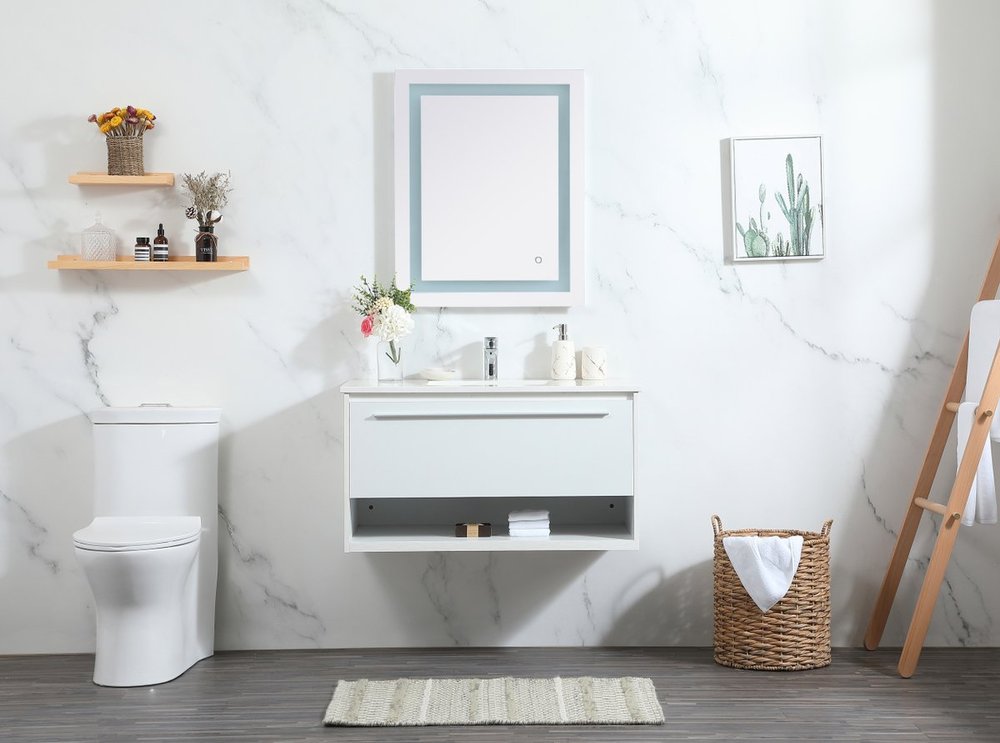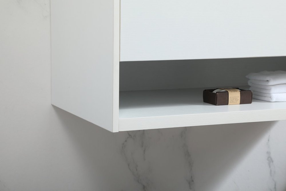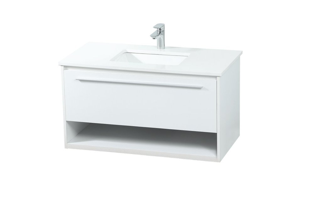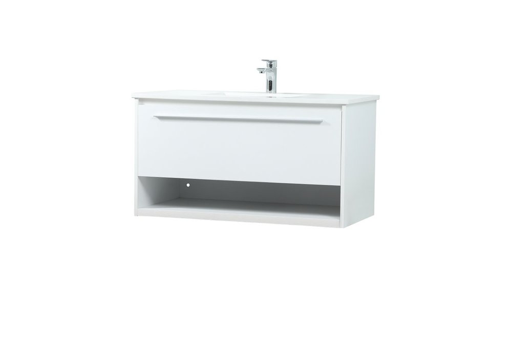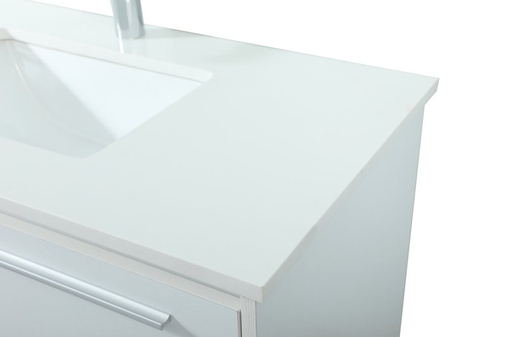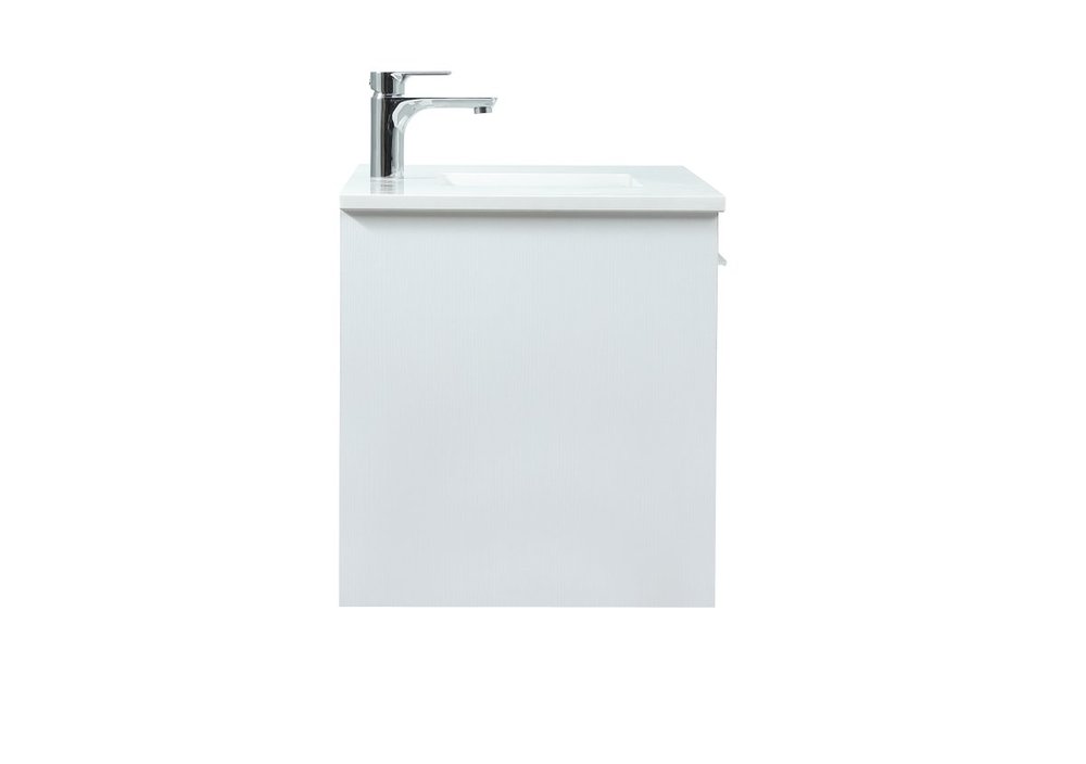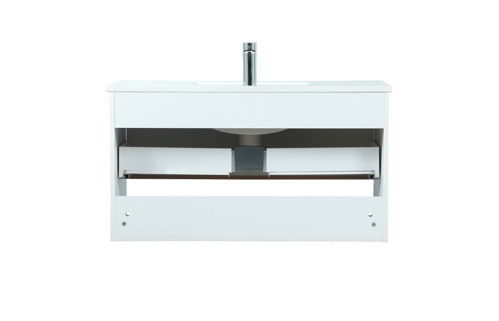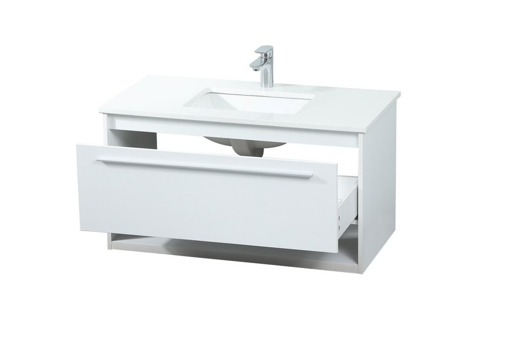 Save space and make your bathroom appear bigger with this floating vanity. Its minimal design will have you in awe, while its clean lines will leave your room feeling fresh and uncluttered. The Single u-drawer pulls out for storage while the open space below allows you to place extra towels or various other essentials. The ivory white engineered marble counter top with porcelain sink adds refined luxe while the aluminum barpull style handle adorn the vanity face.