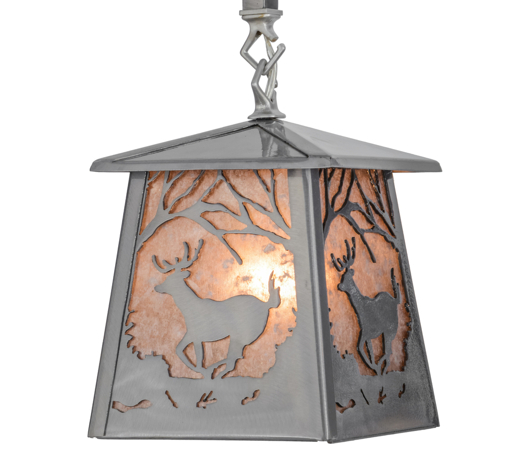 A stunning design depicts a Deer gracefully leaping through the lakeside woods as soft ambient illumination shines through Silver Mica in these three shades. Hardware and accents are featured in a Steel finish by Meyda artisans in our facility at the foothills of the Adirondack Mountains.