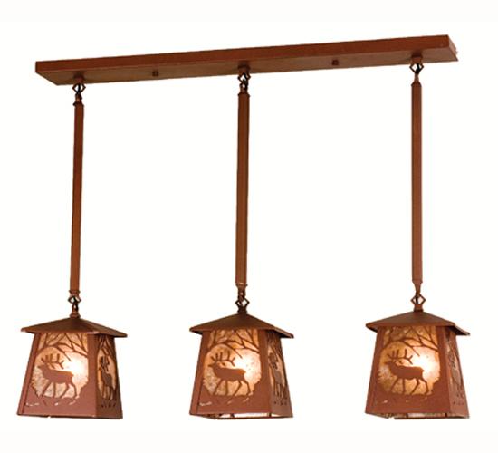 An Elk in the forest is depicted on each side of this lantern shades of this three light lantern pendant handcrafted in the USA by Meyda artisans. The wildlife inspired fixture is finished in Rust and has Silver mica panels.