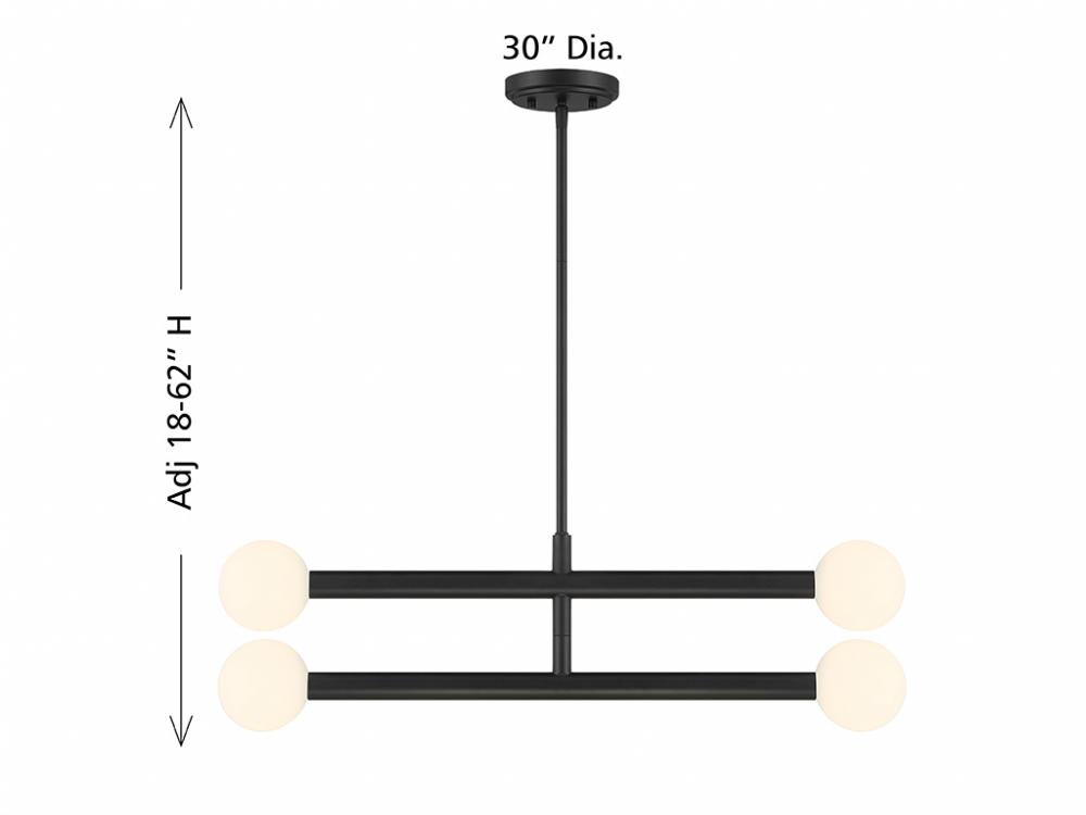 This perky, peppy 4-light chandelier has an understated style that makes a big impact! The light shines from inside orbs of white opal glass and the Matte Black finish works beautifully with any decor. You can even rotate the arms for a customized look! This chandelier is 30" in width and has an adjustable height ranging from 8" to 62". It comes with four 12" downrods and one 6" downrod. Uses four G9 LED bulbs of up to 3.5 watts per bulb. Bulbs not included.