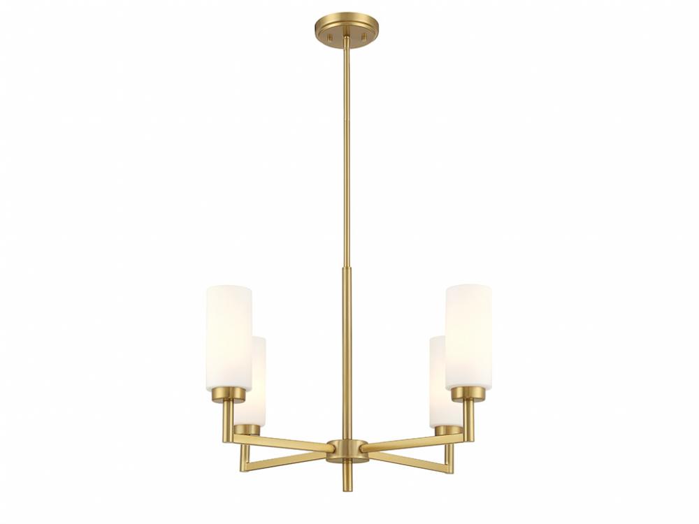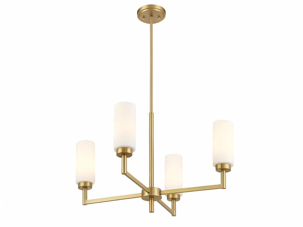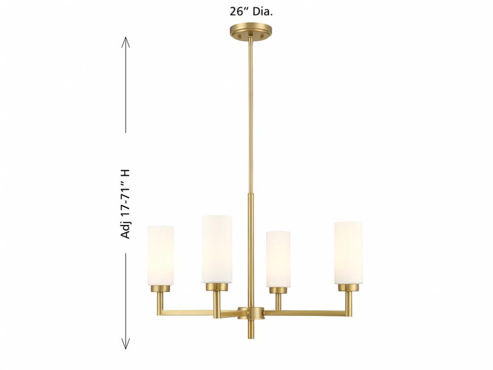 Get glowing with this angular, stylish 4-light chandelier. Each arm is finished in Natural Brass and holds a tall, sleek cylinder of white opal glass for bright yet flattering light. This chandelier is 26" in width and has an adjustable height ranging from 17" to 71". It comes with four 12" downrods and one 6" downrod. Uses 4 candelabra size bulbs of up to 60 watts per bulb. Bulbs not included.