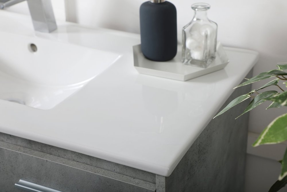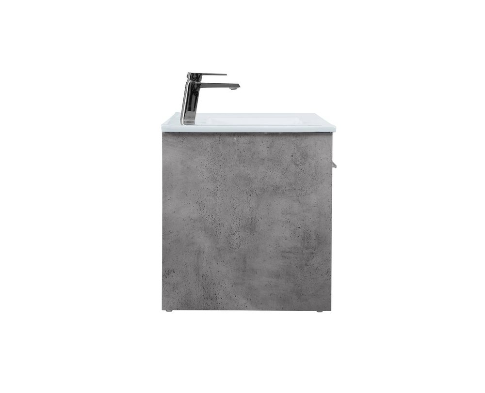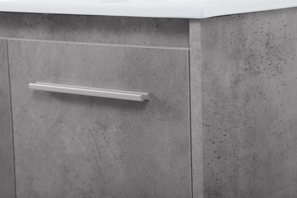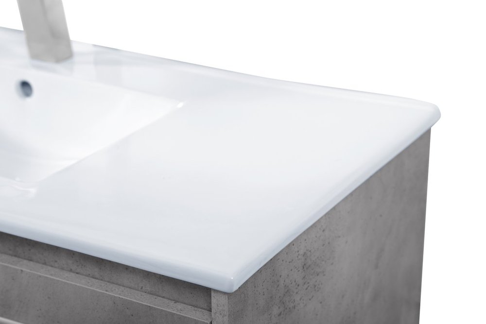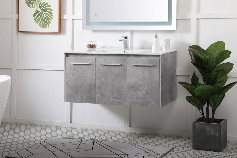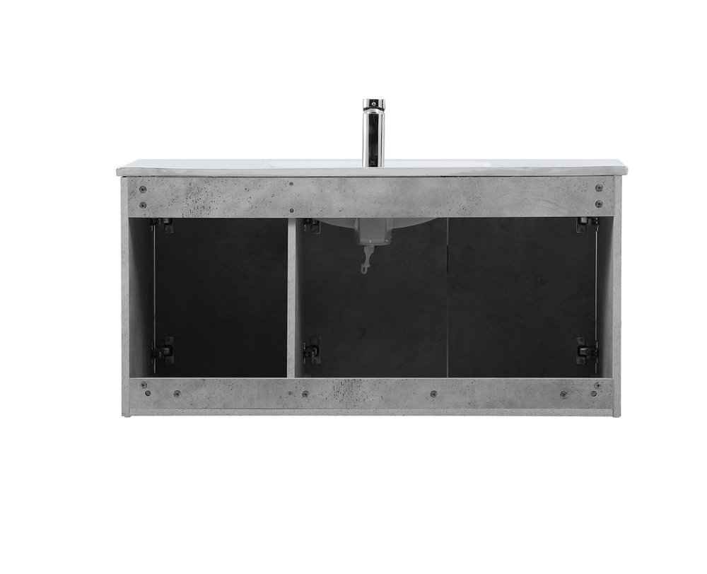 The contemporary simplicity of this 40" floating vanity in a concrete grey finish will help open the space and add stunning modern flair to your bathroom or powder room. The open space below makes it easy to show off your tiles and to clean the floor with ease--it's also the perfect place for a hamper. 3 doors open to reveal plentiful of storage pace to store all of your bathroom miscellany. The clean lines that permeate through the design will surely create a fresh look in your home.
