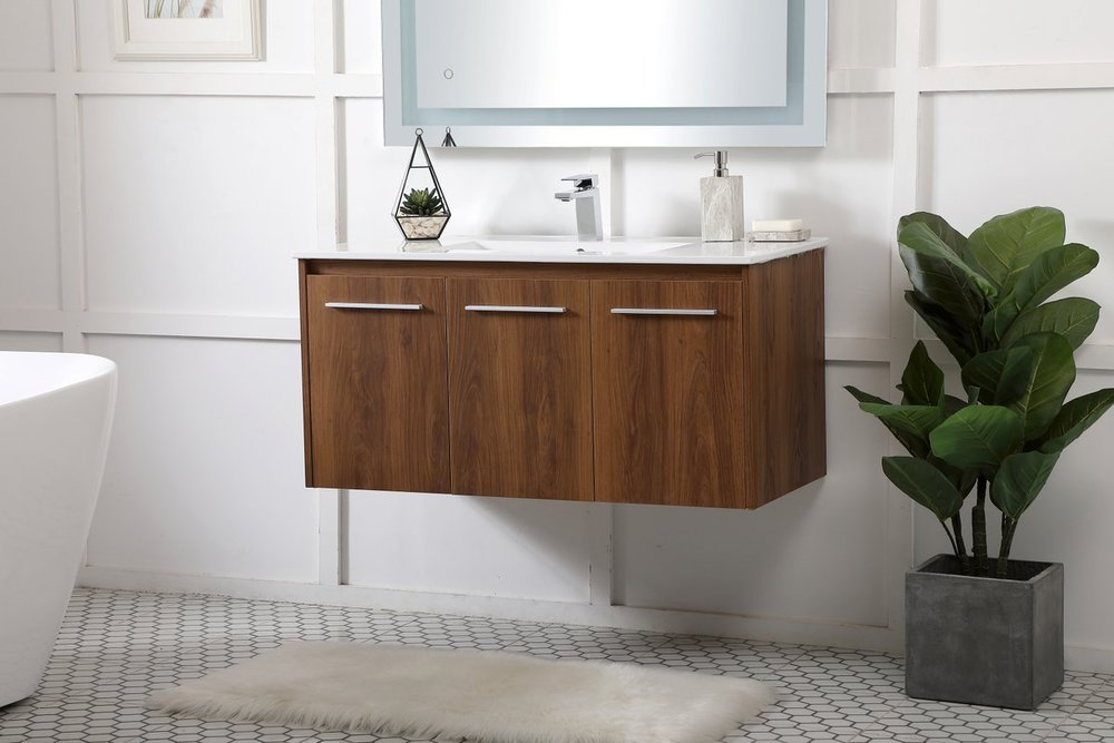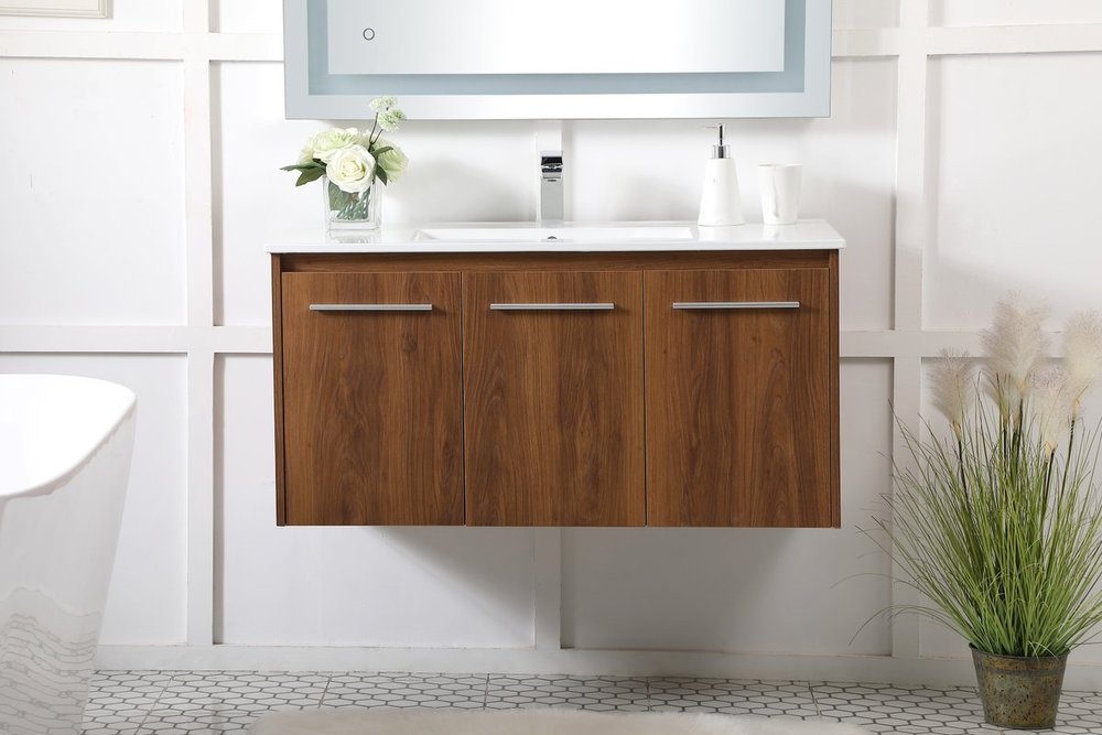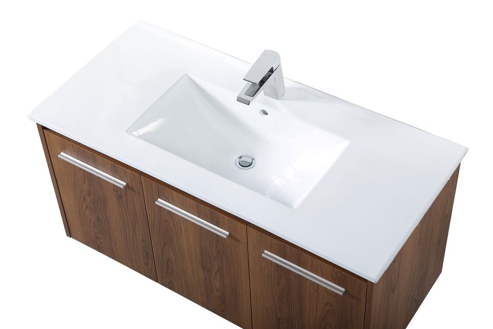 The contemporary simplicity of this 40" floating vanity in a walnut brown finish will help open the space and add stunning modern flair to your bathroom or powder room. The open space below makes it easy to show off your tiles and to clean the floor with ease--it's also the perfect place for a hamper. 3 doors open to reveal plentiful of storage pace to store all of your bathroom miscellany. The clean lines that permeate through the design will surely create a fresh look in your home.
