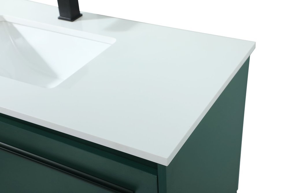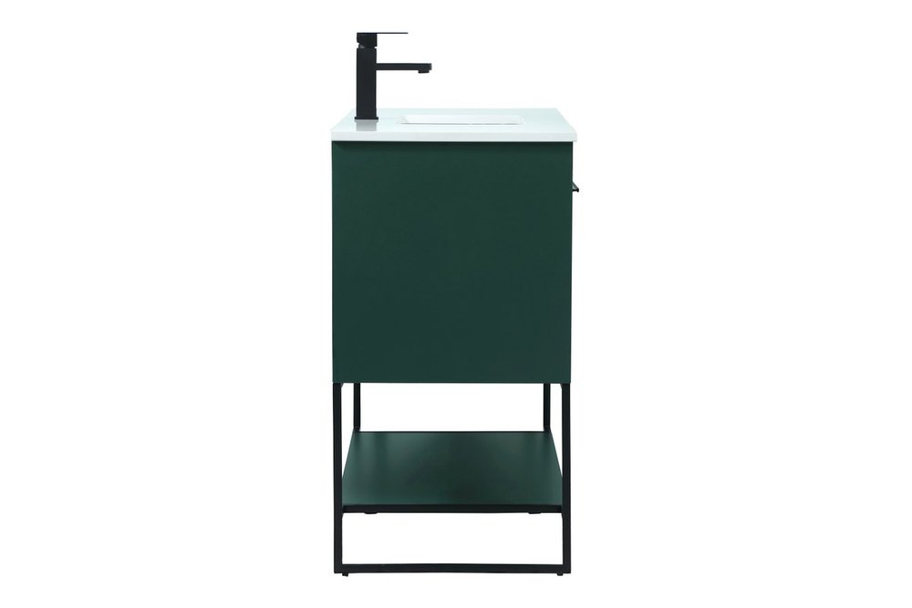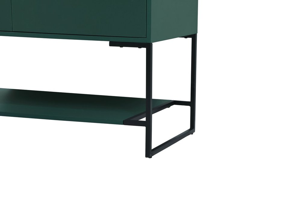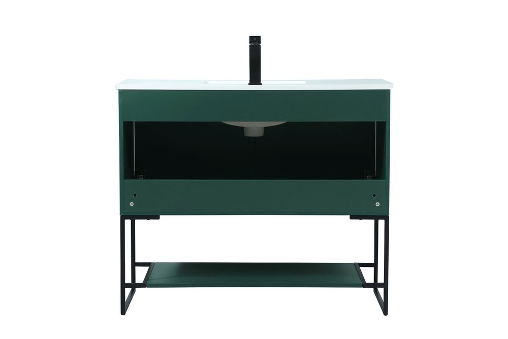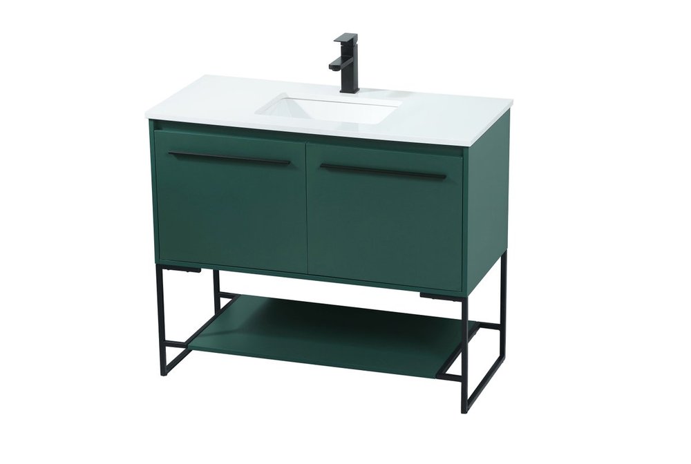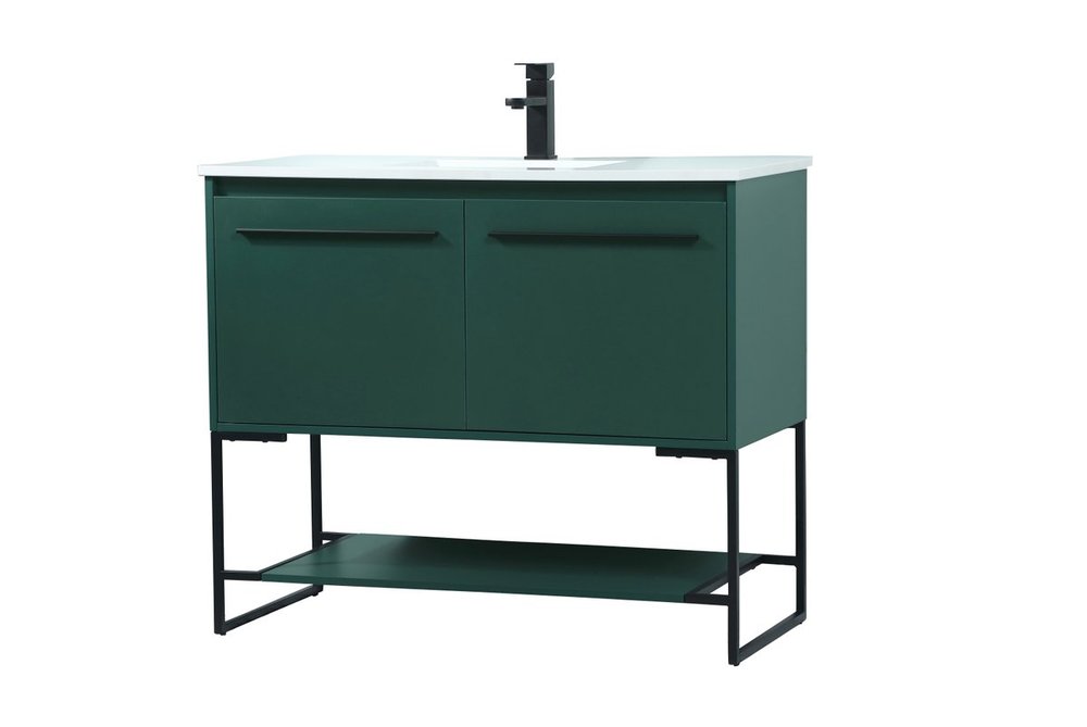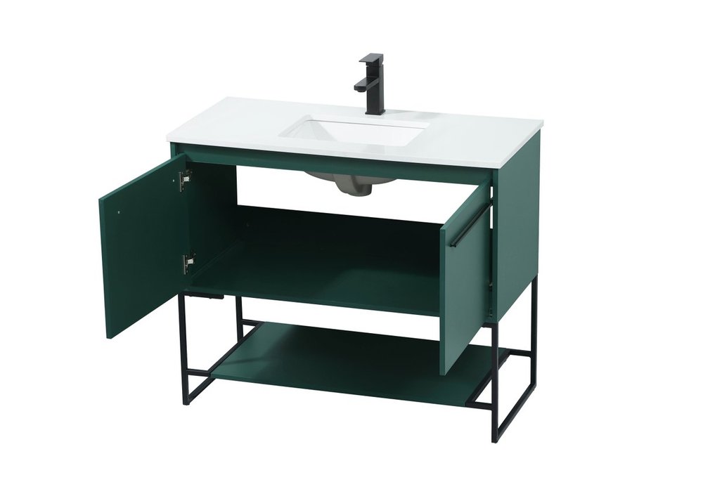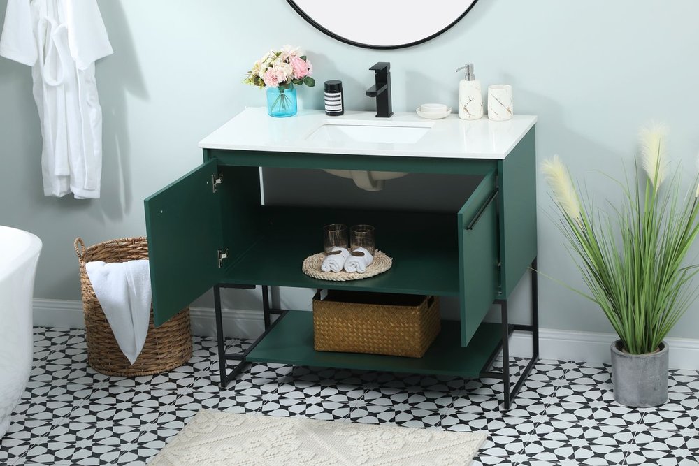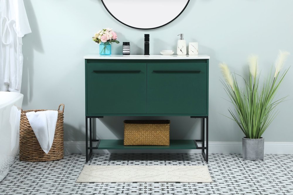 Live in modern comfort with this 40" green finish vanity. Dressed in a green and sleek black metal hardware, its contemporary style will have your bathroom or powder room elevated in industrial sophistication. The open shelf at the base and two doors reveal ample storage space for your bathroom essentials and miscellany. Clean lines create its own visual interest, adding trendy looks to your already chic room.