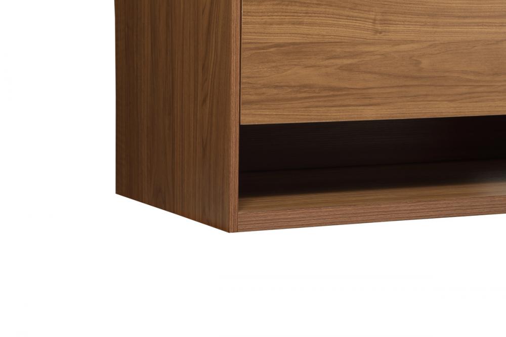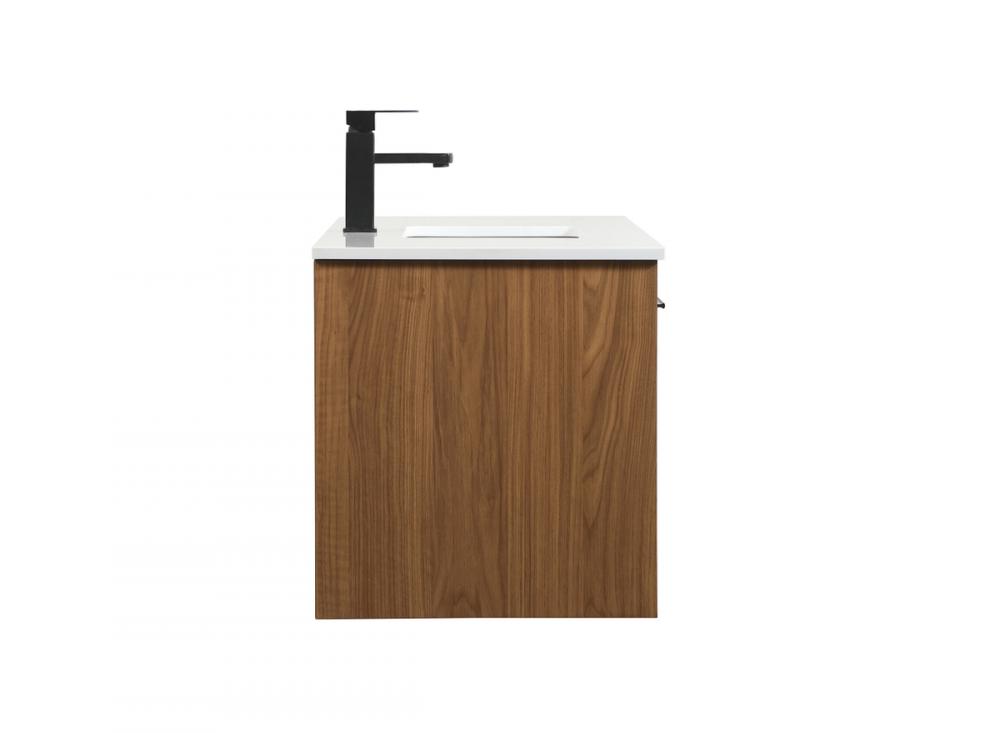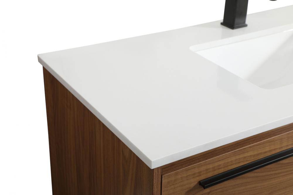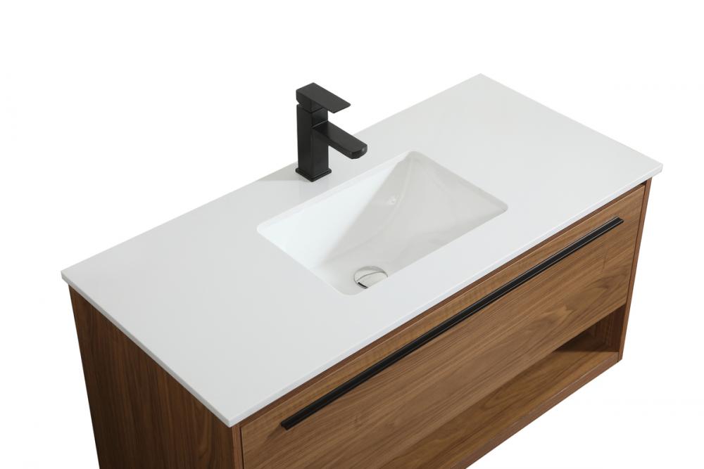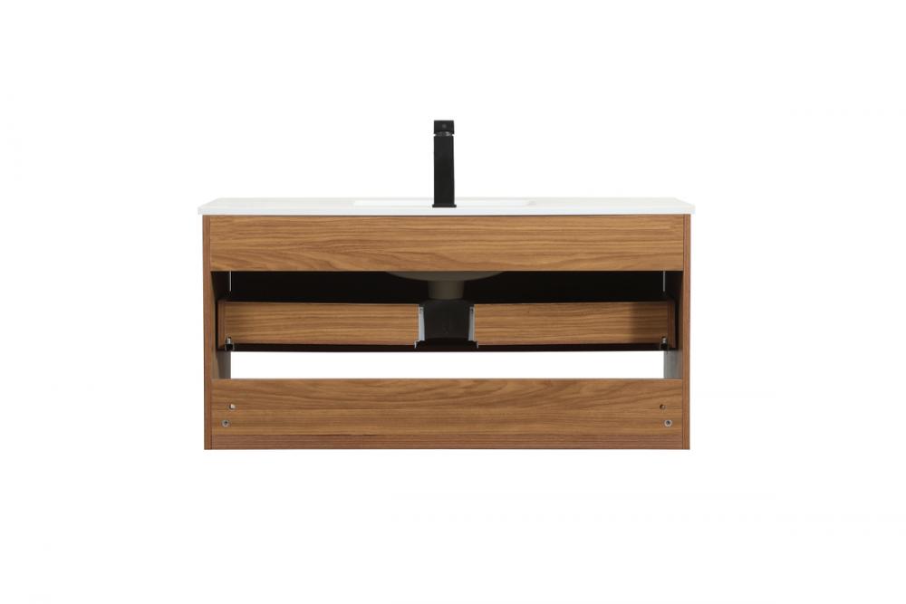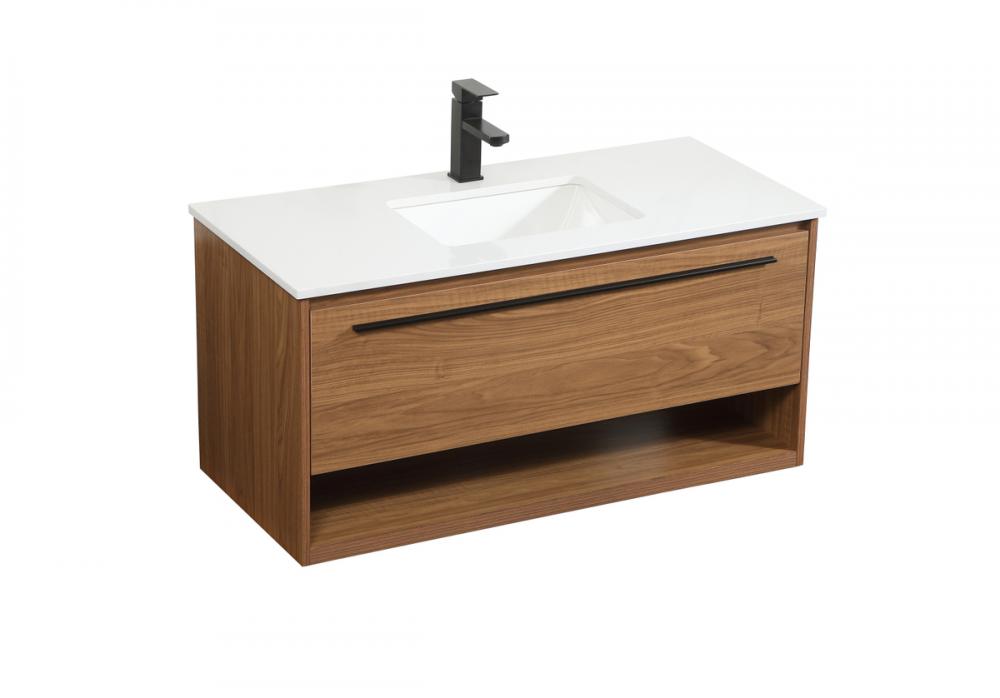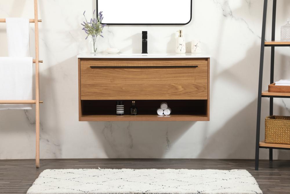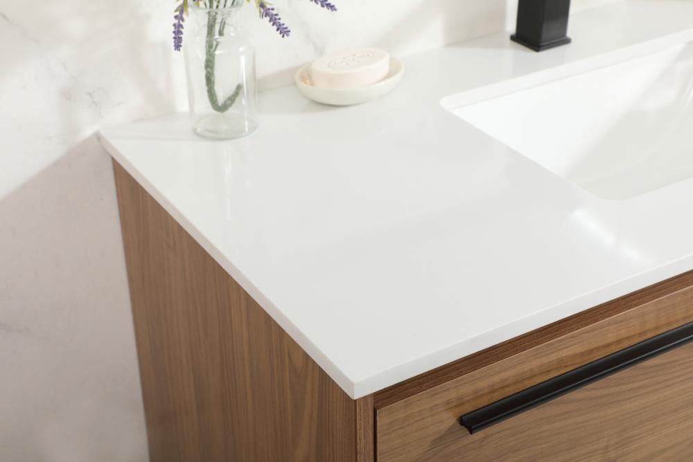 Save space and make your bathroom appear bigger with this floating vanity. Its minimal design will have you in awe, while its clean lines will leave your room feeling fresh and uncluttered. The Single u-drawer pulls out for storage while the open space below allows you to place extra towels or various other essentials. The ivory white engineered marble counter top with porcelain sink adds refined luxe while the aluminum barpull style handle adorn the vanity face.