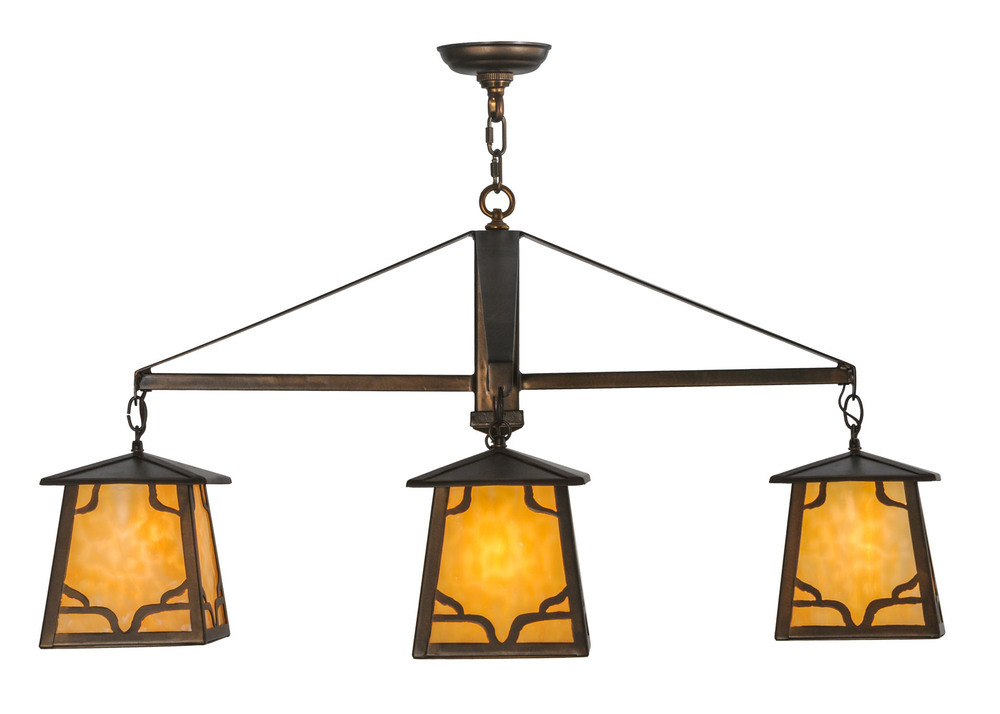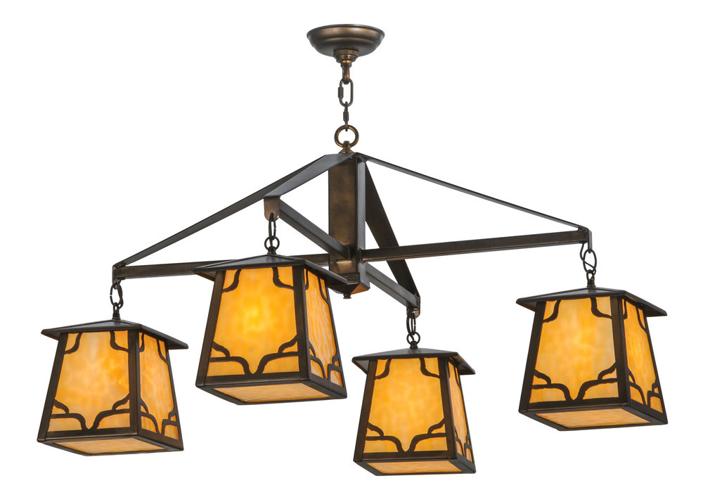 Inspired by European architecture; the distinctive Kirkpatrick features an abstract design found on historical monuments across the globe. Four Mission styled lanterns reveal stunning Beige art glass with complementary bottom diffusers. The classic frame; decorative accents; and hardware are featured in an Antique Copper finish. The overall height of this chandelier ranges from 24 to 53 inches and the chain length can be easily adjusted in the field to accommodate your specific lighting application needs. Handcrafted in our 180;000 square foot manufacturing facility in the USA. Custom finishes; colors; sizes and dimmable energy efficient lamping options such as LED are available. UL and cUL listed for dry and damp locations.