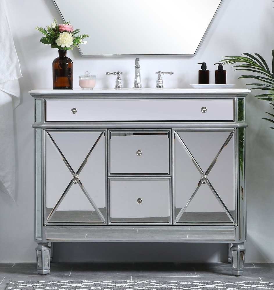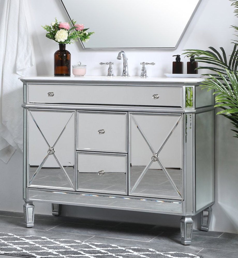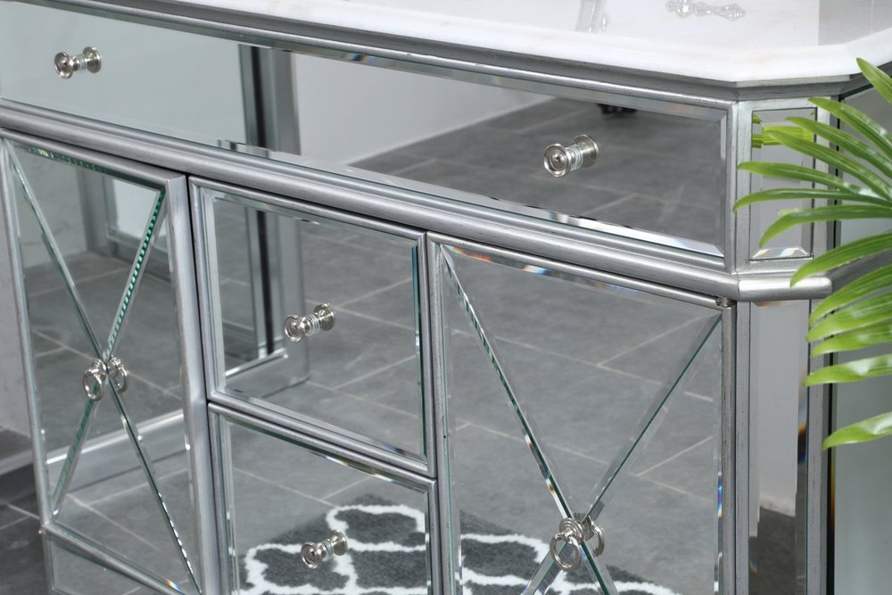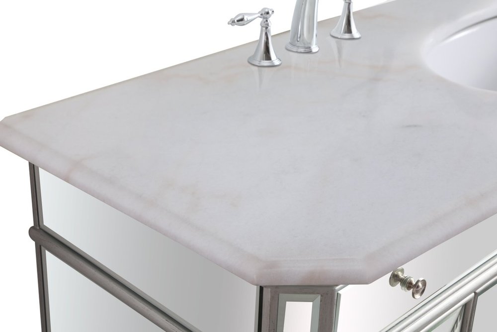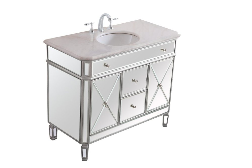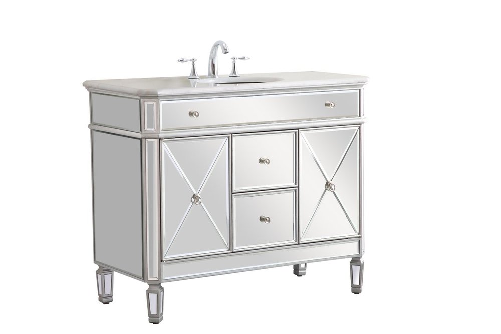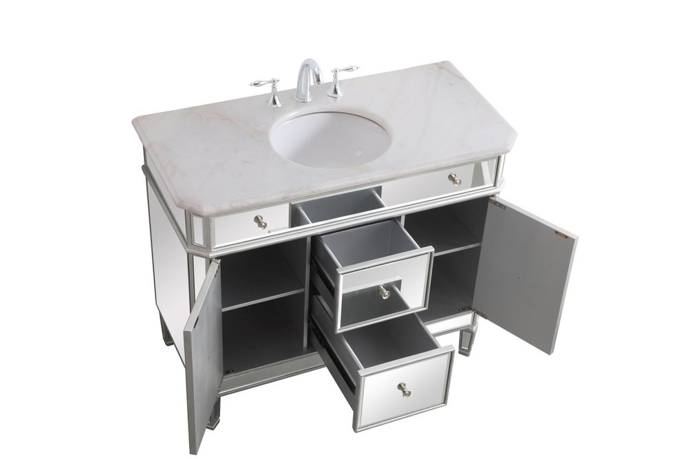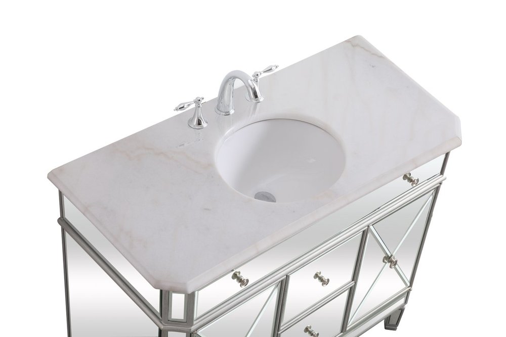 Radiance and opulence, the 42” camille collection vanity brings a tasteful statement to any home and office bathroom. Topping with a lustrous white marble, 2 center drawers and 2 side doors with shelving inside, in clear bevel-edged mirror, hand rubbed silver finish, brushed steel knobs, this contemporary vanity will add a clean, sharp contemporary look and destine to please. Measurements: W42”xD21”xH35”. White marble, due to the nature of natural stone, no two slabs of marble are the same.