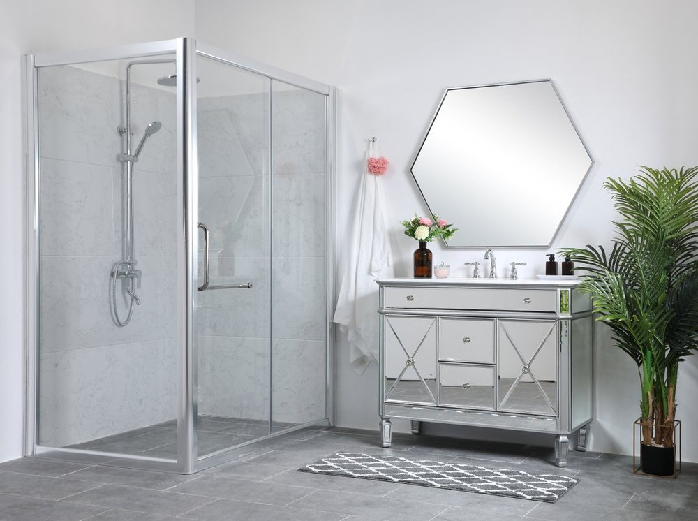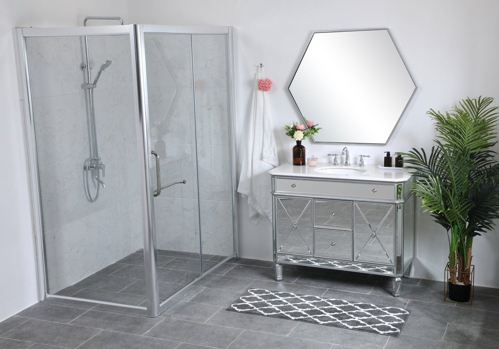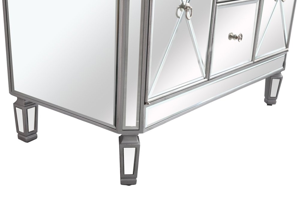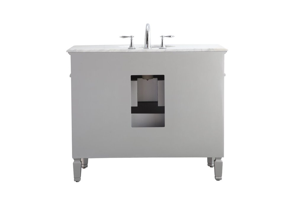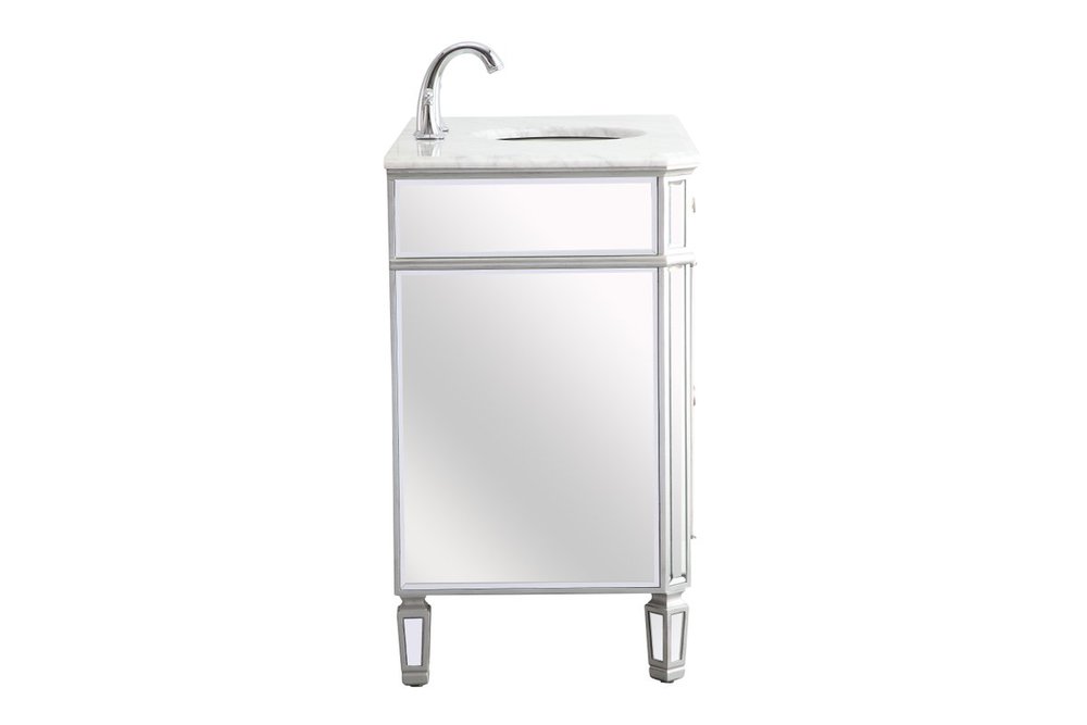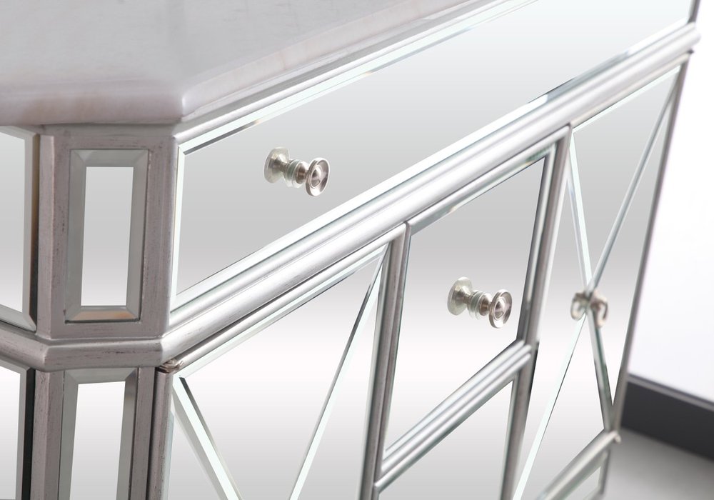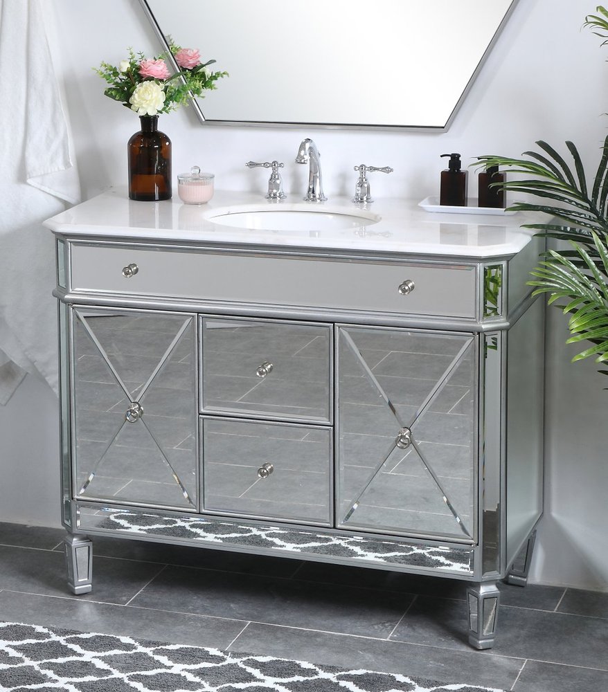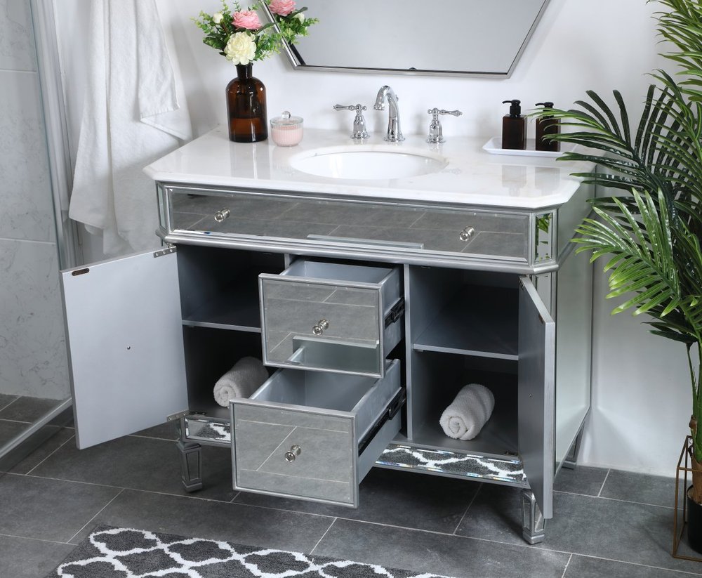 Radiance and opulence, the 42” camille collection vanity brings a tasteful statement to any home and office bathroom. Topping with a lustrous white marble, 2 center drawers and 2 side doors with shelving inside, in clear bevel-edged mirror, hand rubbed silver finish, brushed steel knobs, this contemporary vanity will add a clean, sharp contemporary look and destine to please. Measurements: W42”xD21”xH35”. White marble, due to the nature of natural stone, no two slabs of marble are the same.
