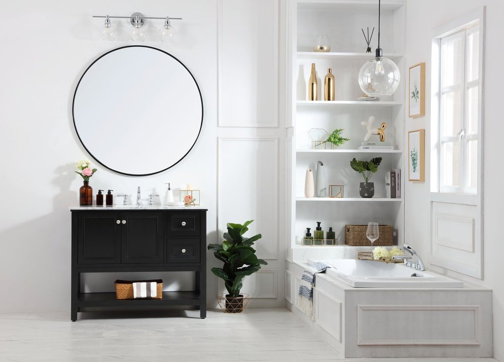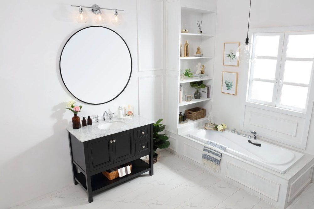 Create a refined and relaxing bath space with this contemporary design vanity, presenting its simplicity and clean straight lines in a minimalist appeal. The 42" black vanity, crafted of solid poplar wood, provides ample storage within its 2 soft-close drawers and double doors, all equipped with soft-closing mechanism and accentuated with gleaming chrome hardware. Rounding out the design is a luxurious Itallian Carrara white marble counter top and a white porcelain under-mount oval sink