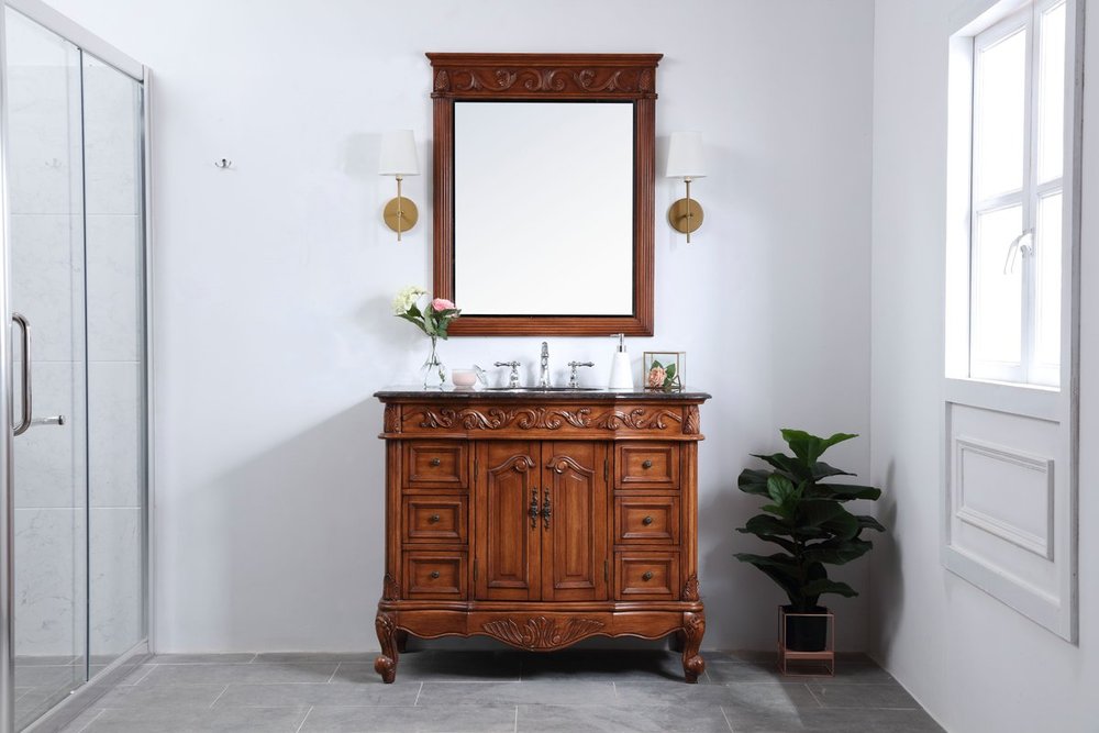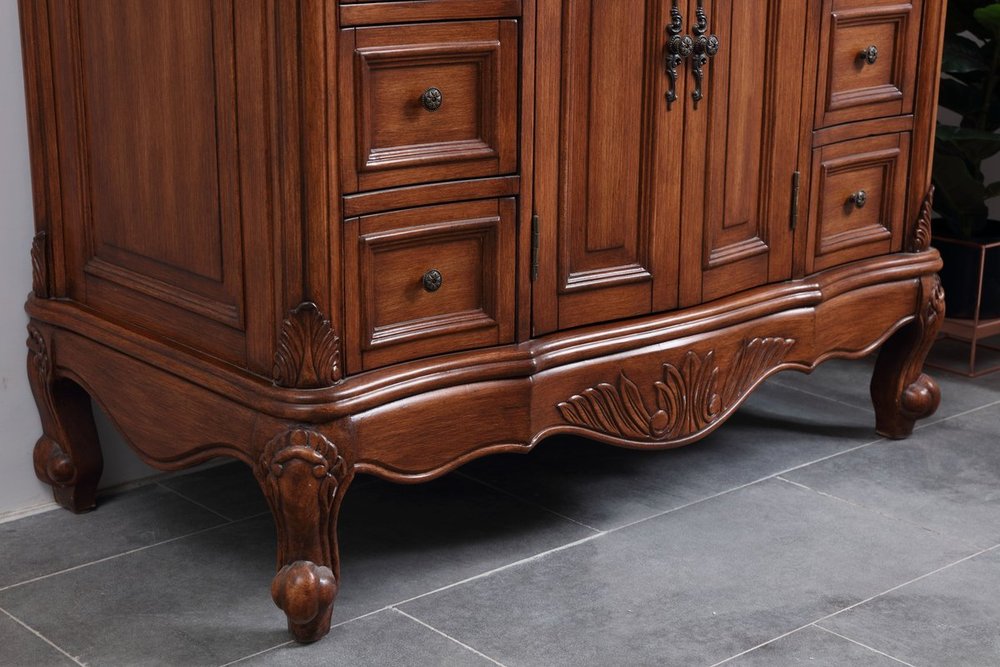 This superb balance of timeless tradition and opulent beauty in a granite-topped vanity will certainly enhance the aesthetics of any home or office bathroom! Featuring an exotic English cream granite countertop, complimenting the hand painted teak cabinet. With 2 doors and 6 drawers, as well as antique bronze finish door knobs, this superbly carved floral design, stands on stylishly carved solid wood French scroll feet made this a truly rich statement of luxury! Measurements: W42” x D22” x H35”, fully assembled.