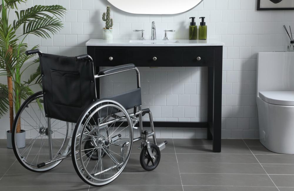 The sink vanity is thoughtfully crafted to accommodate wheelchair access, promoting inclusivity in your bathroom space.