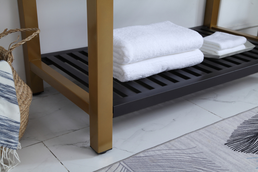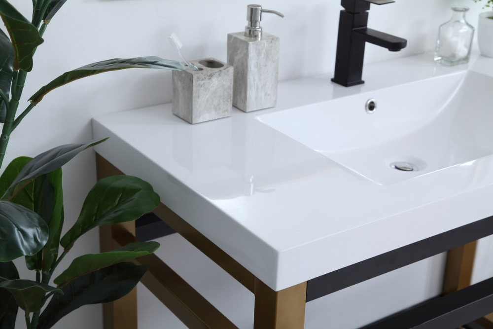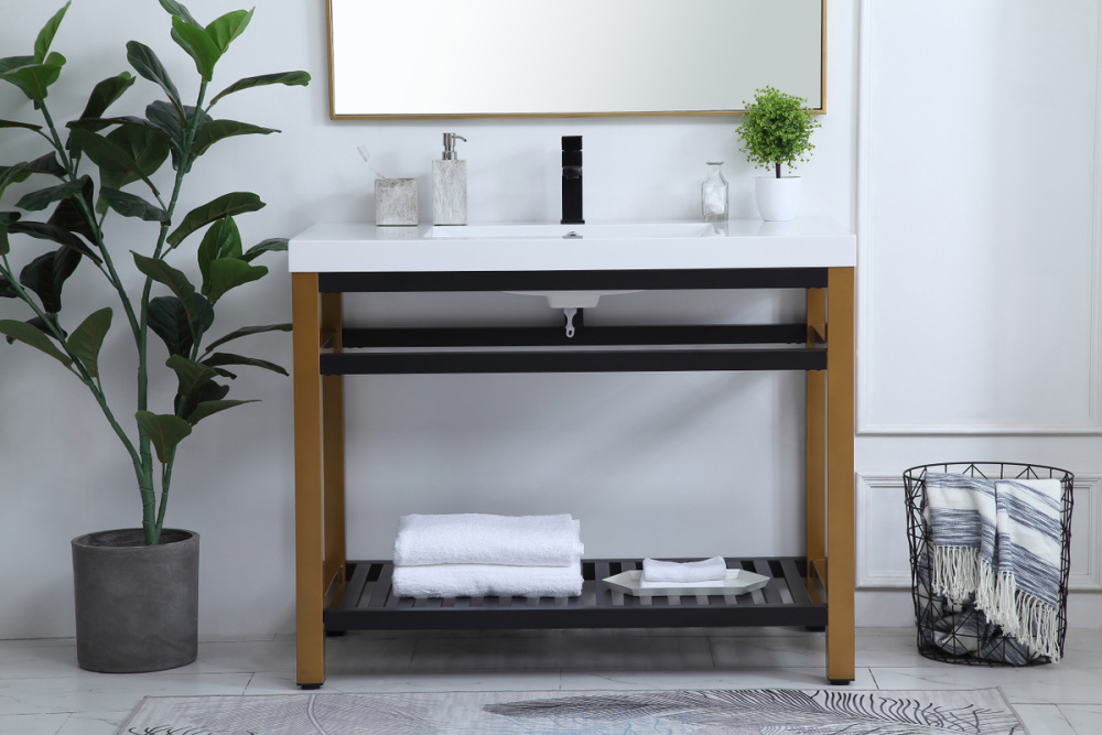 In true minimalistic spirit, this 42" vanity shines with pared down elegance. Bold clean lines build up the metal vanity, creating a modern simplicity that adds visual liveliness and complements any bathroom or powder room. The bottom shelf lets you put away any extra towels or bathroom essentials, and its shining white undermount sink creates contrast against the finish. Its bold graphic style will create a contemporary style in your home.