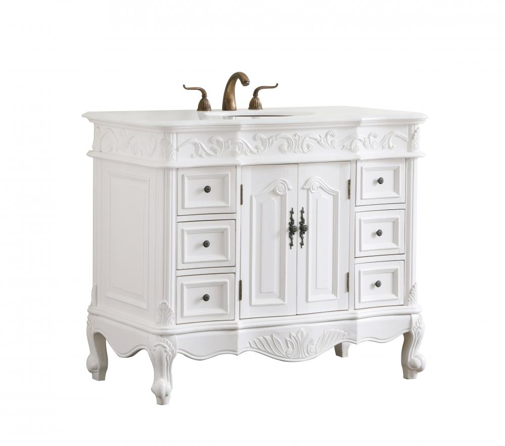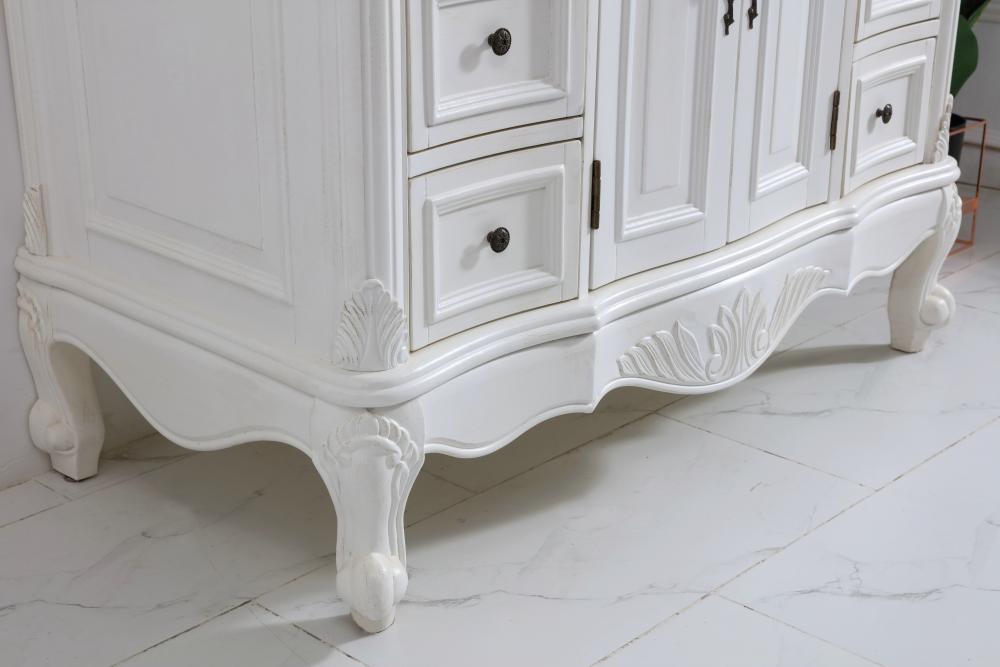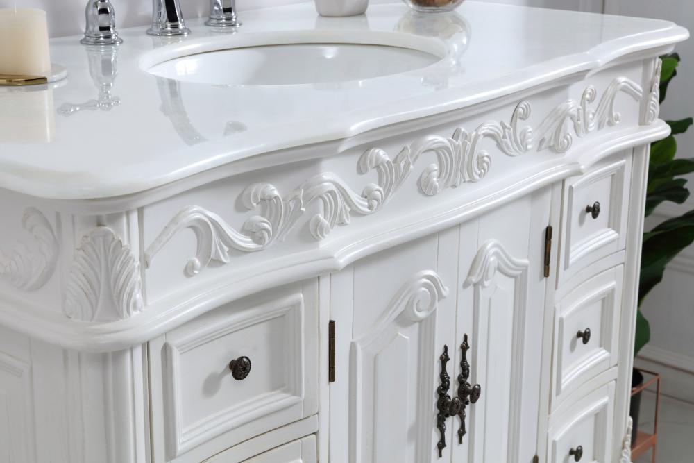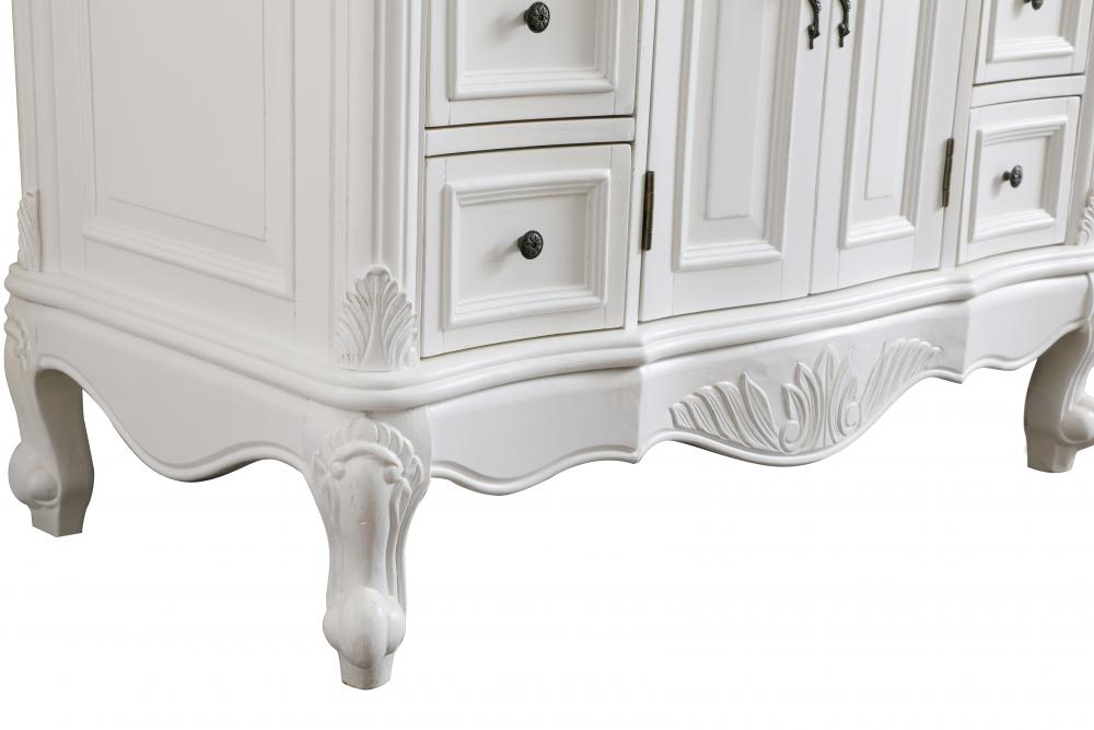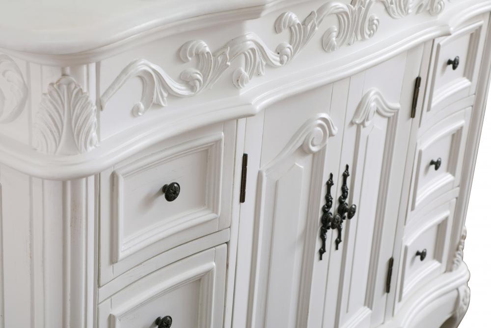 This superb balance of timeless tradition and opulent beauty in a traditional vanity will certainly enhance the aesthetics of any home or office bathroom! Featuring an ivory white engineered marble countertop complimenting the hand painted cabinet. With two doors and six drawers, as well as antique bronze finish door knobs, this superbly carved floral design, stands on stylishly carved solid wood French scroll feet. The vanity ships fully assembled with a convenient open access plumbing panel.