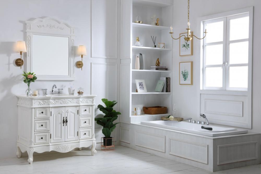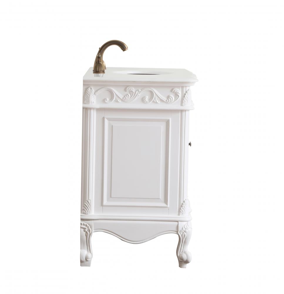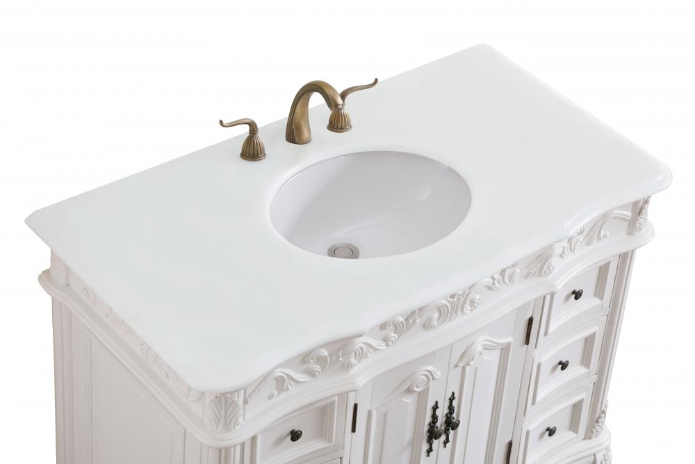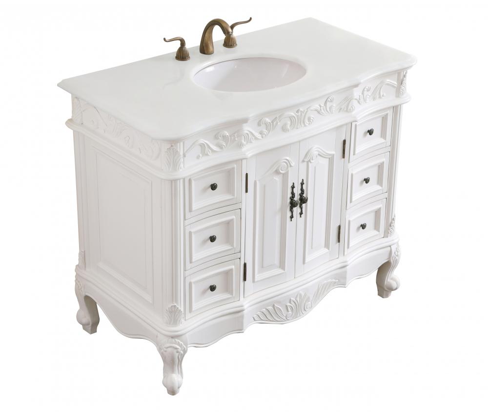 This superb balance of timeless tradition and opulent beauty in a traditional vanity will certainly enhance the aesthetics of any home or office bathroom! Featuring an ivory white engineered marble countertop complimenting the hand painted cabinet. With two doors and six drawers, as well as antique bronze finish door knobs, this superbly carved floral design, stands on stylishly carved solid wood French scroll feet. The vanity ships fully assembled with a convenient open access plumbing panel.