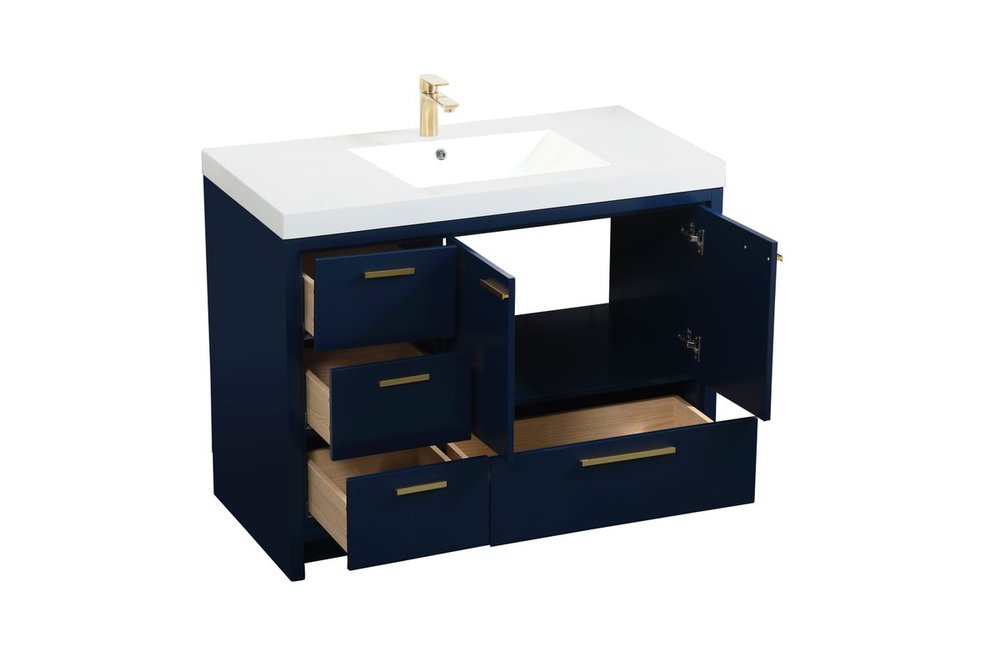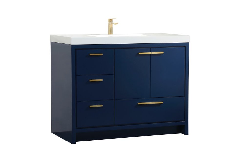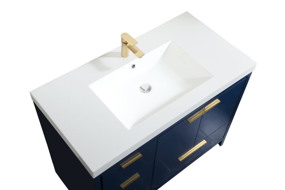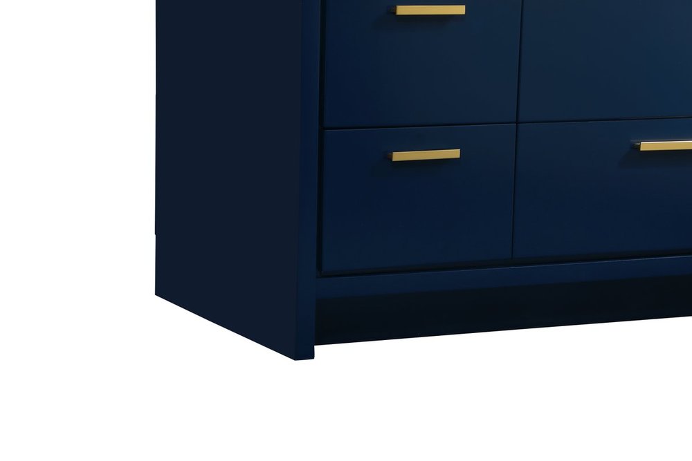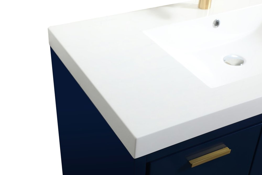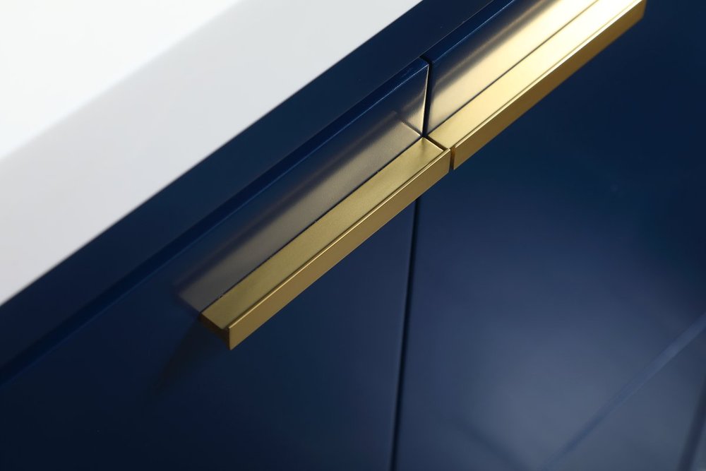 Modern sophistication is defined within the urbane blue finish and gold barpulls of this vanity. Its length makes it the perfect addition to any sized home, and saves space with its storage area hidden behind the double cabinet doors and one bottom drawers. Topped with a highly durable resin white counter top and an integrated sink, this modern design will add everlasting class to your bathroom and powder room.