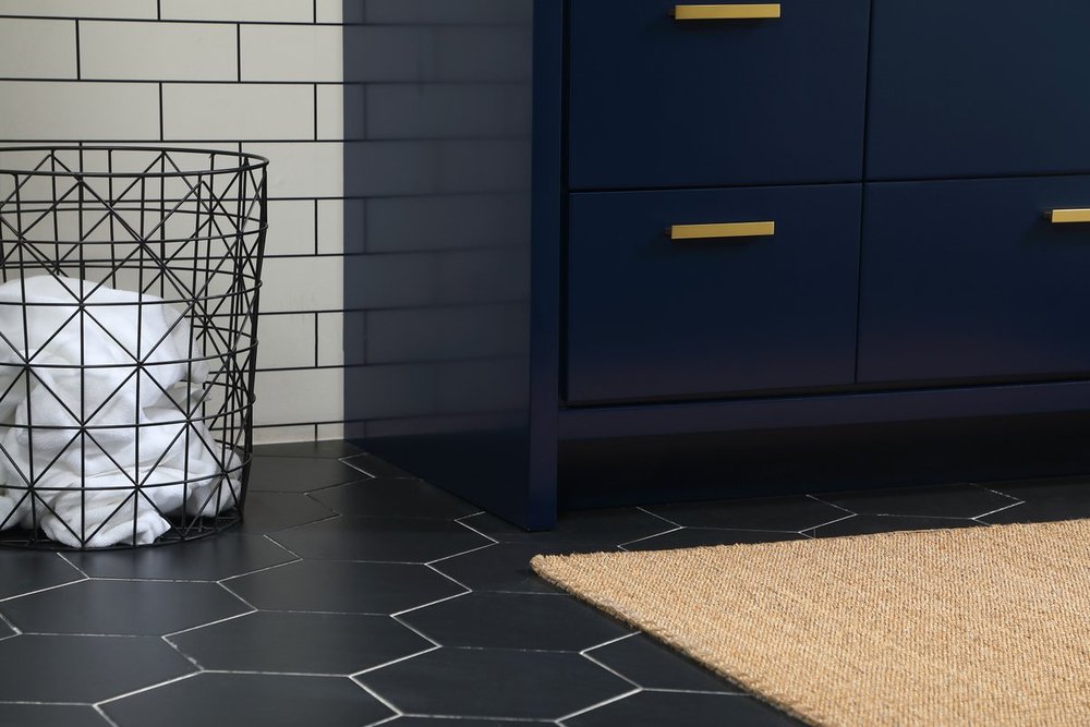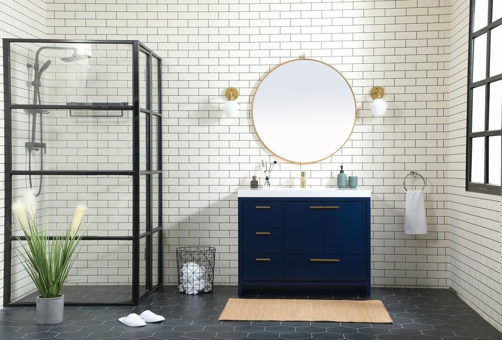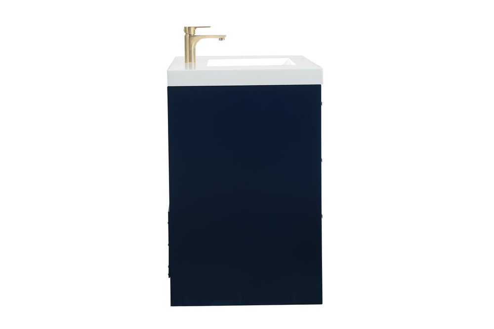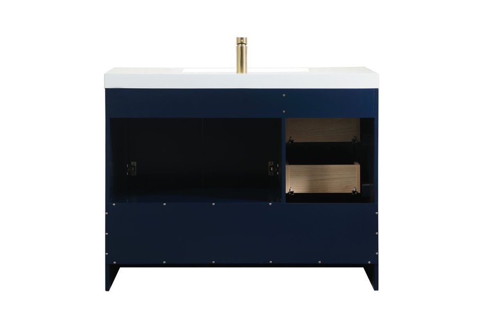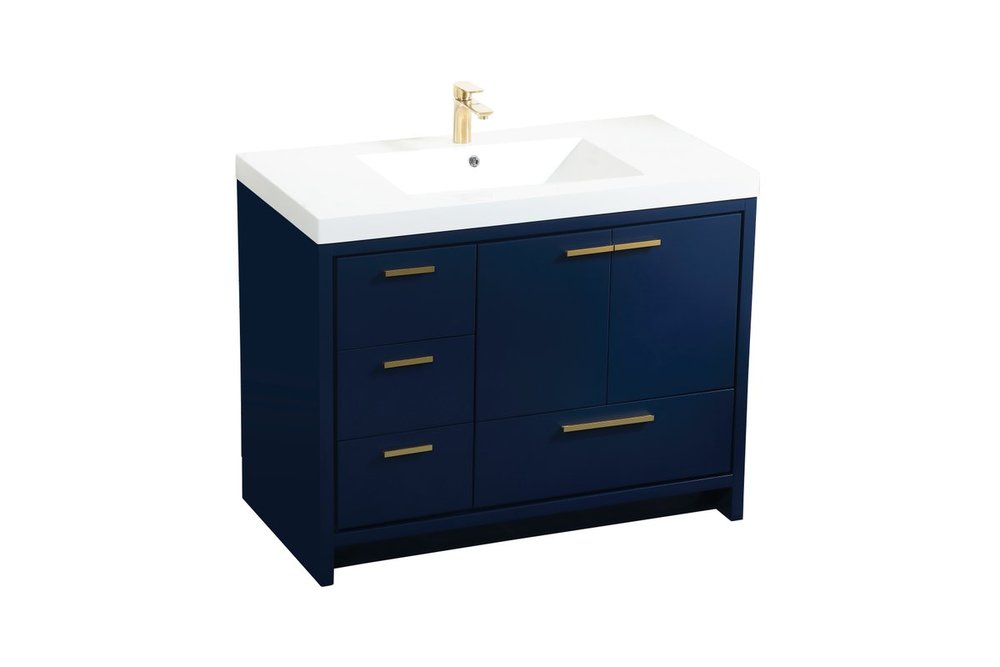 Modern sophistication is defined within the urbane blue finish and gold barpulls of this vanity. Its length makes it the perfect addition to any sized home, and saves space with its storage area hidden behind the double cabinet doors and one bottom drawers. Topped with a highly durable resin white counter top and an integrated sink, this modern design will add everlasting class to your bathroom and powder room.