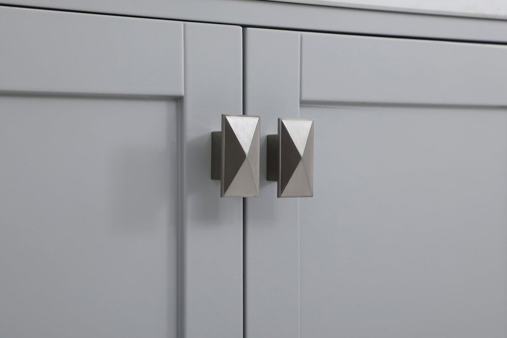 Never compromise beauty--the Irene collection stunning vanity in a gray finish will add lovely sophistication and complement any bathroom or powder room, while utilizing its charm and function to provide you with ample storage spaces. Brushed nickel pulls gently adorn the minimalist cabinet doors and drawers at the base, allowing for you to store away your bathroom essentials. The calacatta engineered marble countertop, porcelain undermount sink, dignified subtle engravings on the side edges, and squared legs all come together to create contemporary beauty. Work with your space, and design a beautiful room, no matter the size. Comes with a matching backsplash to complete the look and protects your wall.
