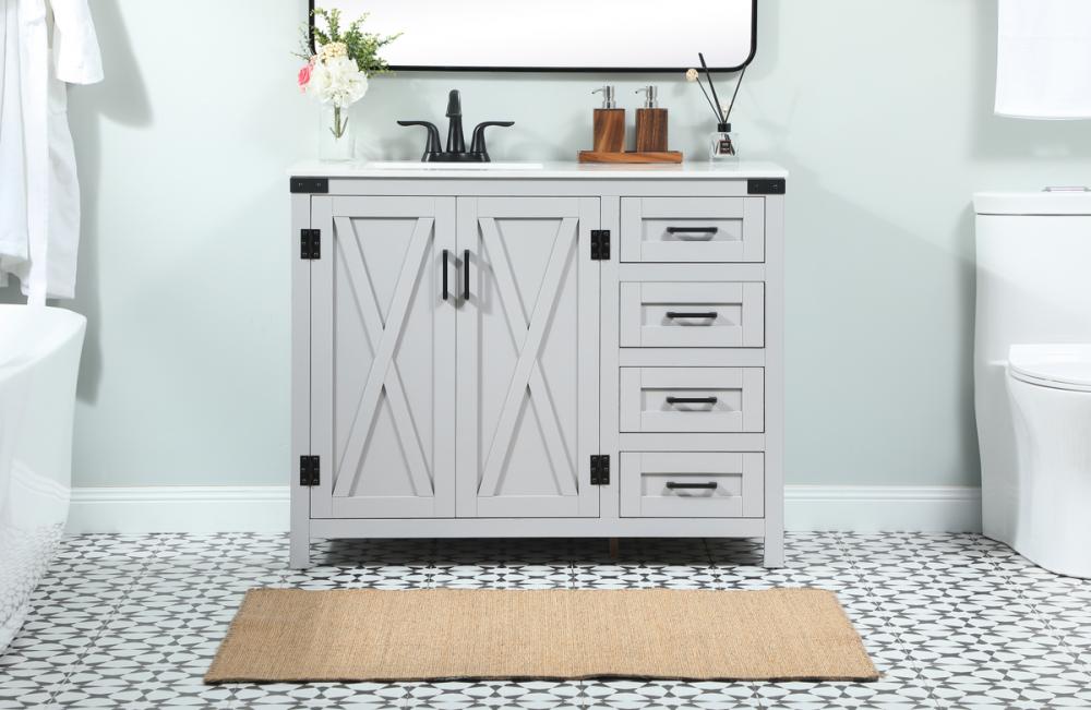 Reminiscent of barn doors, the two door cabinet and four drawers adds both stylistic charm and function with its plethora of storage options for all your bathroom essentials. Whether for your bathroom or the guests', everyone will marvel at its classic look for traditional and farmhouse aesthetics. A slab of engineered marble rounds out the piece up top, as well as the porcelain under mount sink and predrilled faucet holes. This vanity arrives fully assembled.