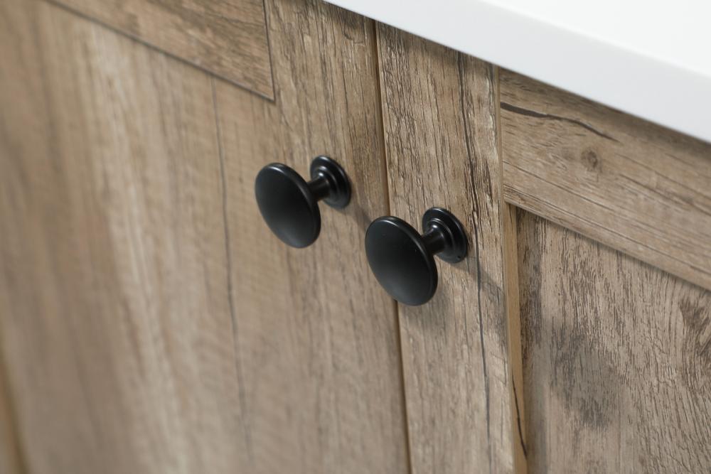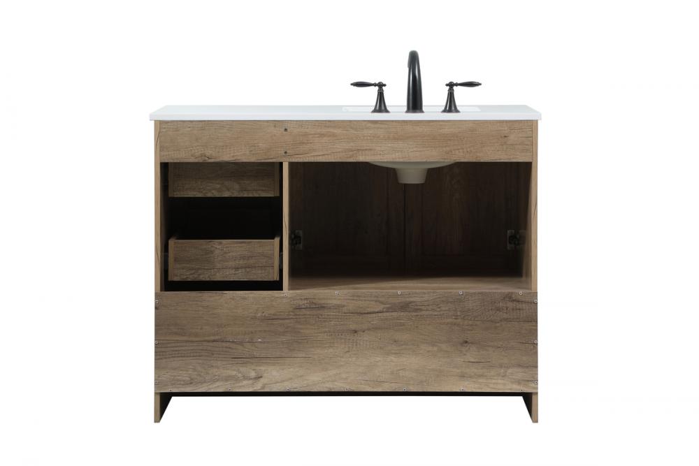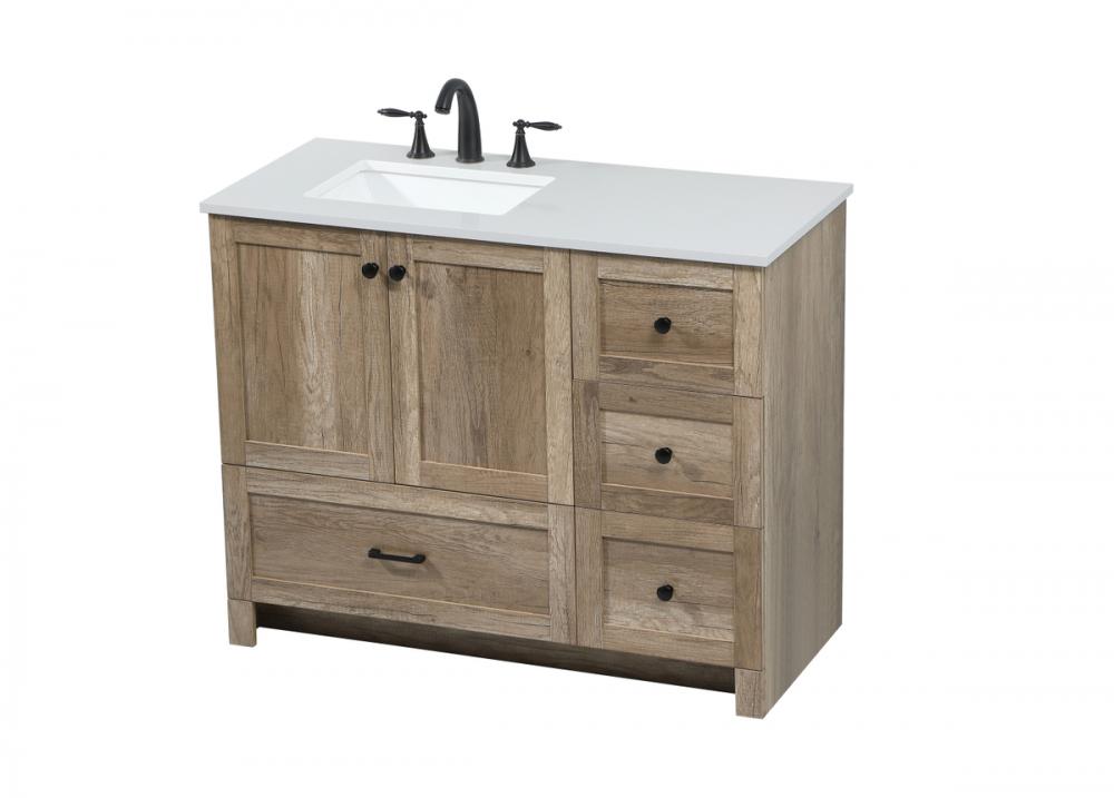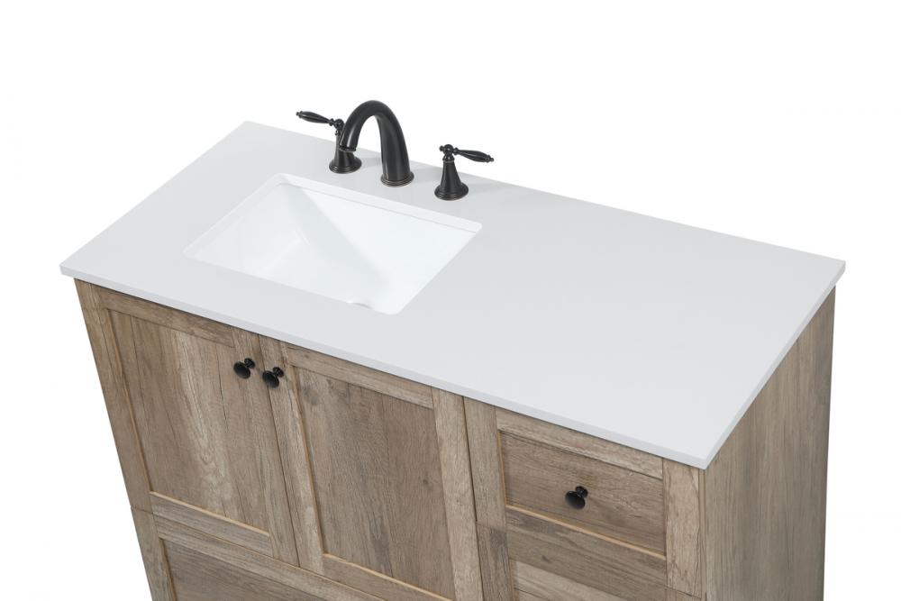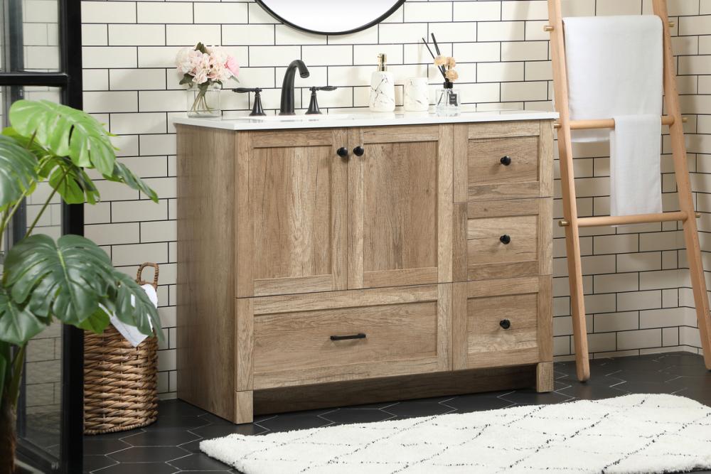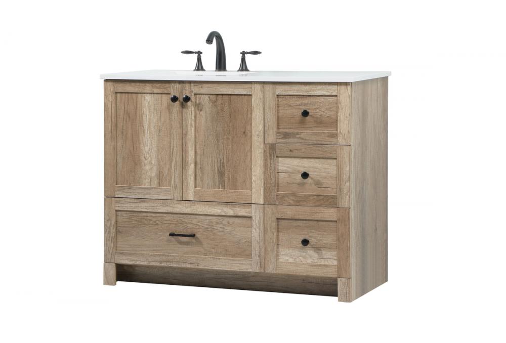 Delve into a world of minimalistic fashion and contemporary styling with this farmhouse 42" vanity. The clean faux lines anchors the weathered design. Black handle adorns the two doors hiding the base of the integrated porcelain sink while the bottom drawer and side drawers allow you to store your bathroom necessities and toiletries. It is the perfect vanity for any bathroom, regardless of size.