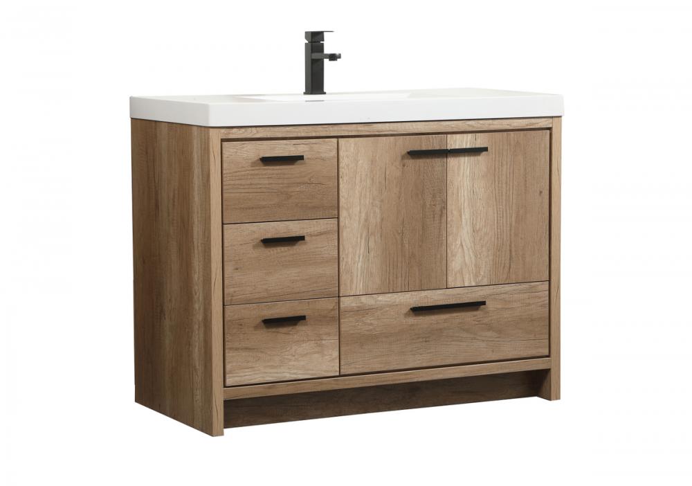 Modern sophistication is defined within the wood finish look and black barpulls of this vanity. Its length makes it the perfect addition to any sized home, and saves space with its storage area hidden behind the double cabinet doors and one bottom drawers. Topped with a highly durable thick resin white counter top and an integrated sink, this modern design will add everlasting class to your bathroom and powder room.