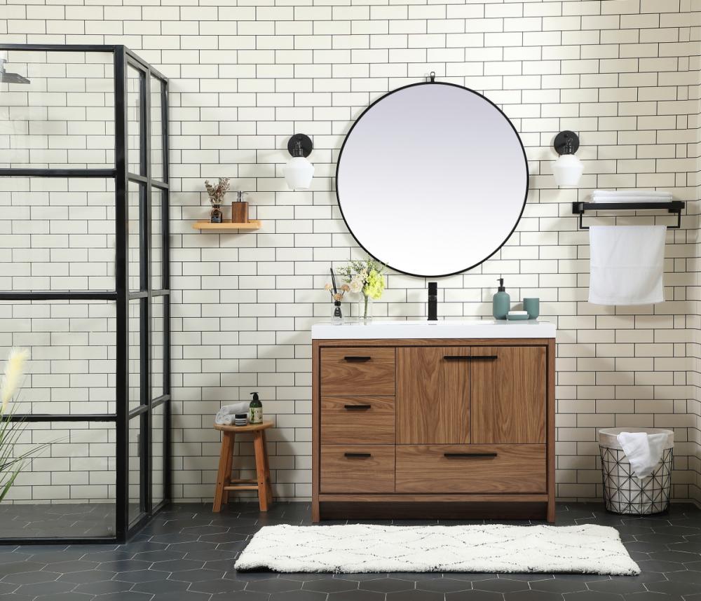 Modern sophistication is defined within the wood finish look and black barpulls of this vanity. Its length makes it the perfect addition to any sized home, and saves space with its storage area hidden behind the double cabinet doors and one bottom drawers. Topped with a highly durable thick resin white counter top and an integrated sink, this modern design will add everlasting class to your bathroom and powder room.